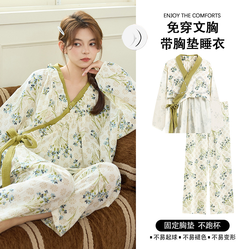 가슴 패드가 있는 긴팔 잠옷 여성용 봄 가을 얇은 구름면 귀여운 인터넷 스타일 외출복 홈웨어 세트 드레스스토어 가기
