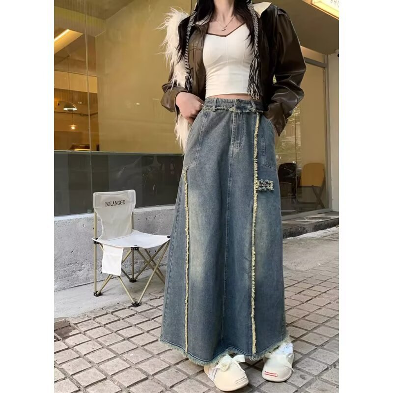 플러스 사이즈 빈티지 세탁 데님 스커트 여성 통통녀 가을과 겨울 새로운 높은 허리 디자인 센스 A 라인 긴 스커트스토어 가기