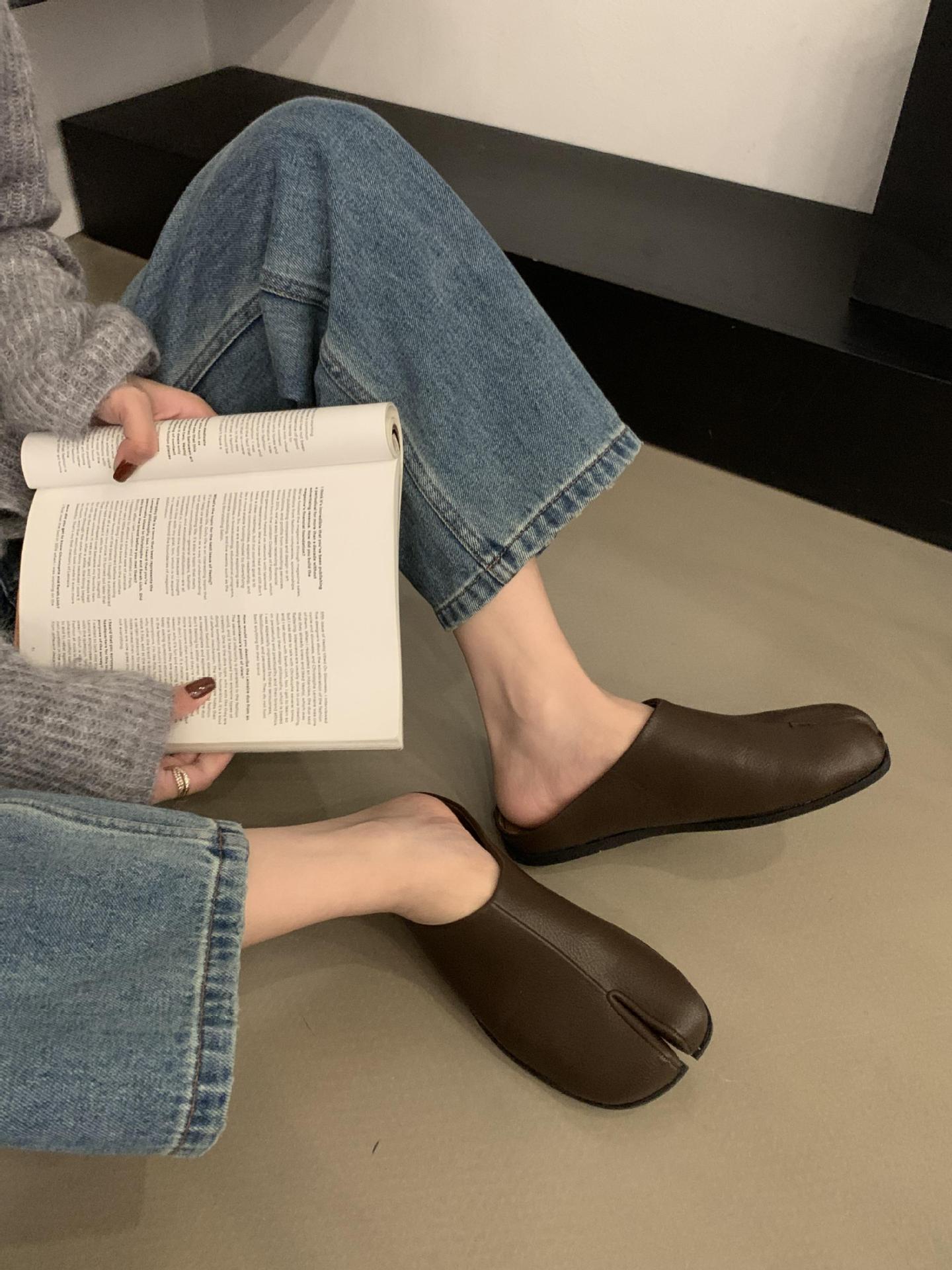 한국 작은 가죽 신발 여성 여름 2022 프랑스 스타일 분할 발가락 돼지 발 신발 플랫 발가락 캡 반 드래그 뮬 신발스토어 가기