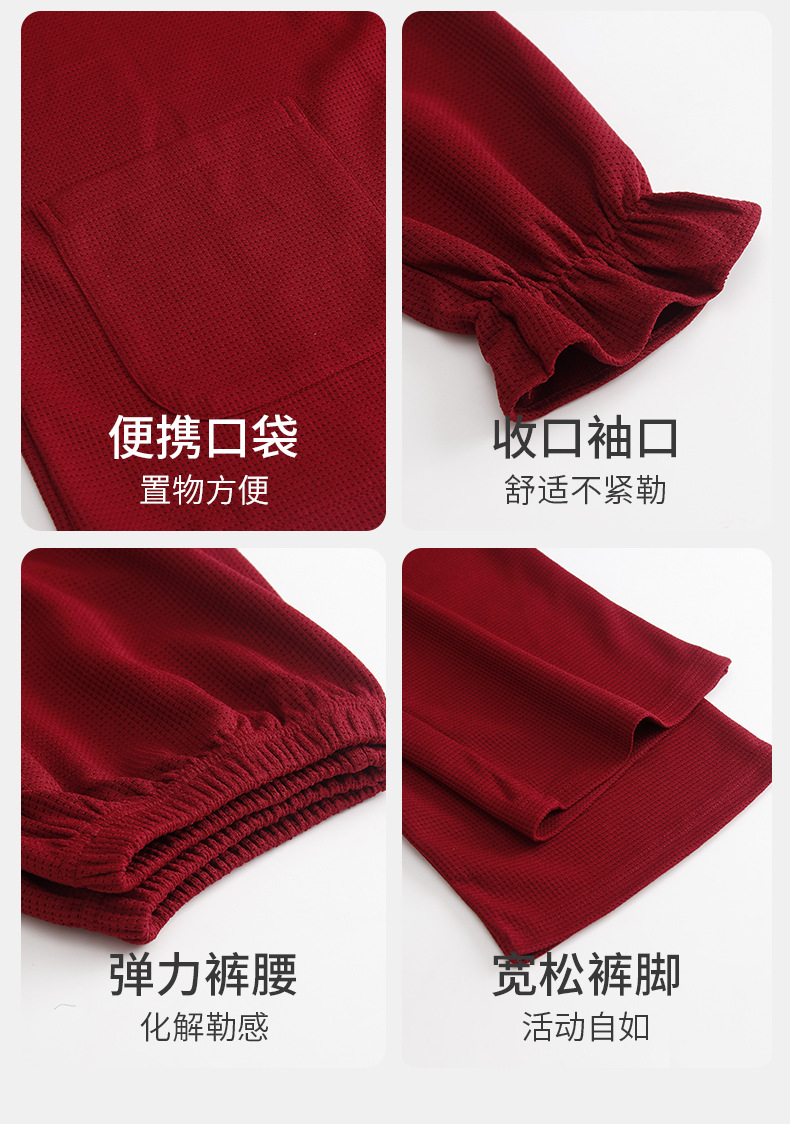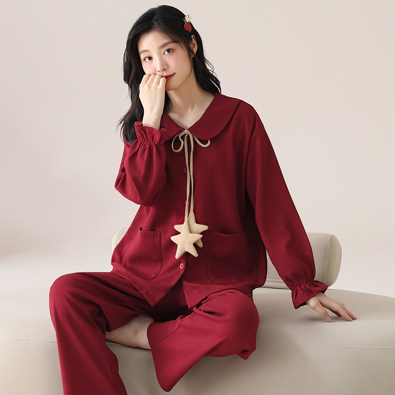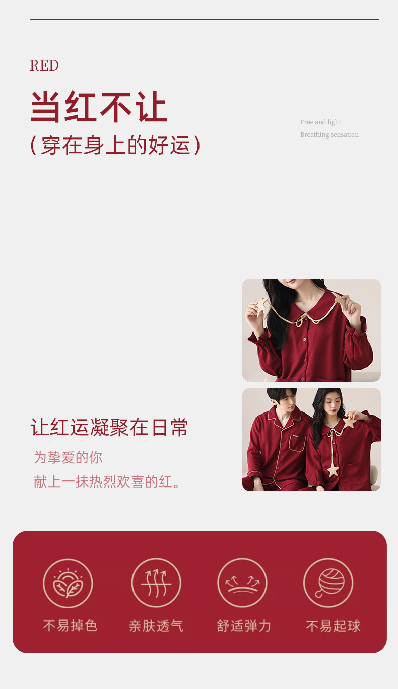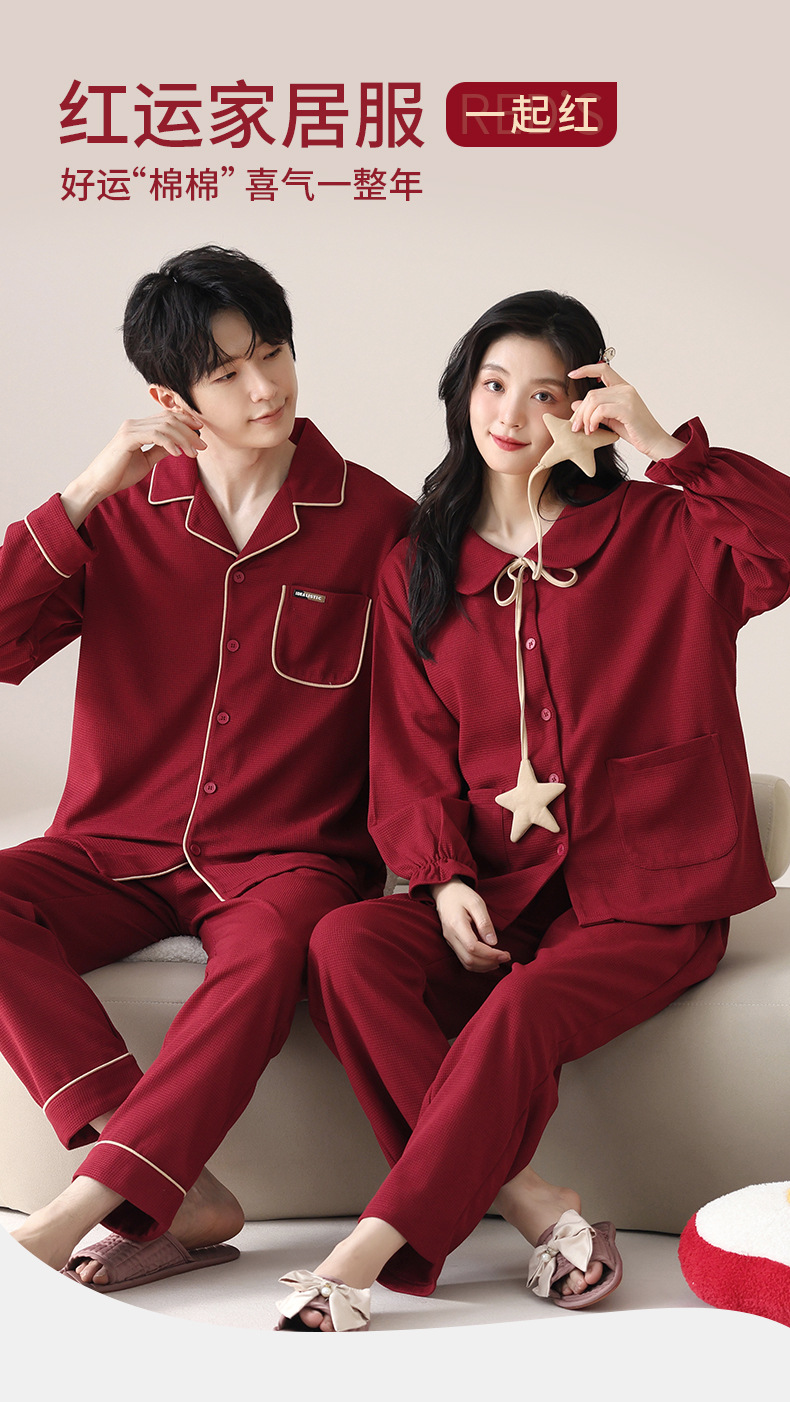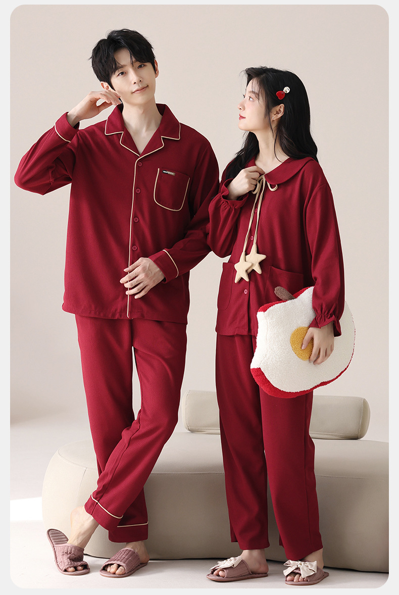 커플 잠옷 가을 2024 새로운 결혼식 세트 긴 소매 면 버건디 남성과 여성의 봄과 가을 홈 옷