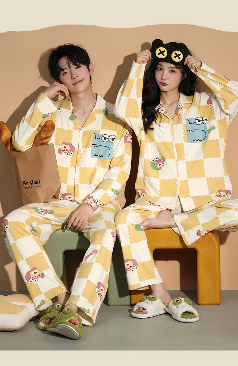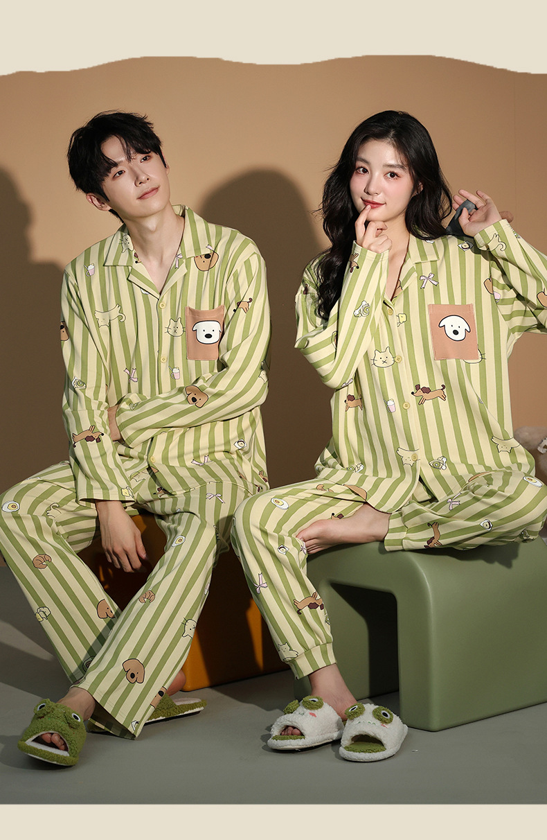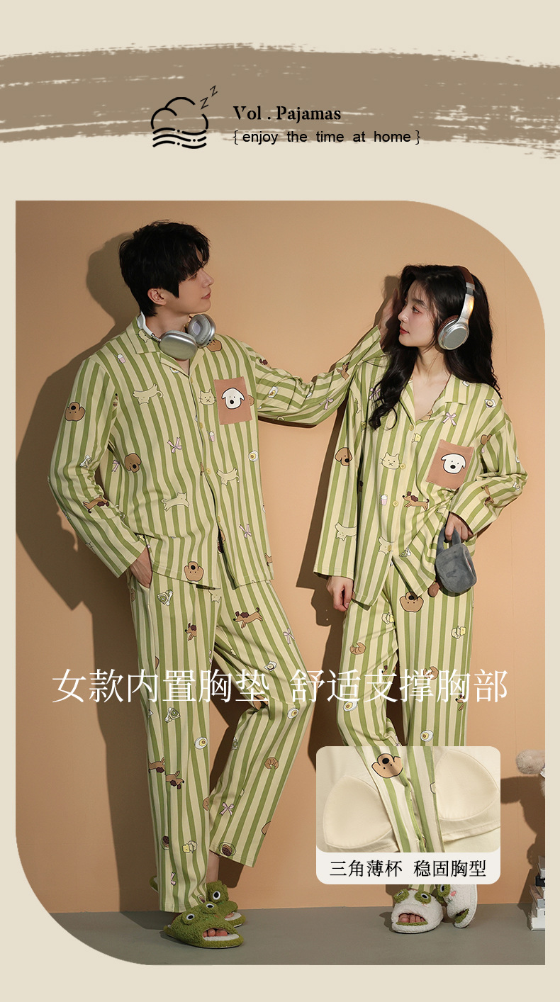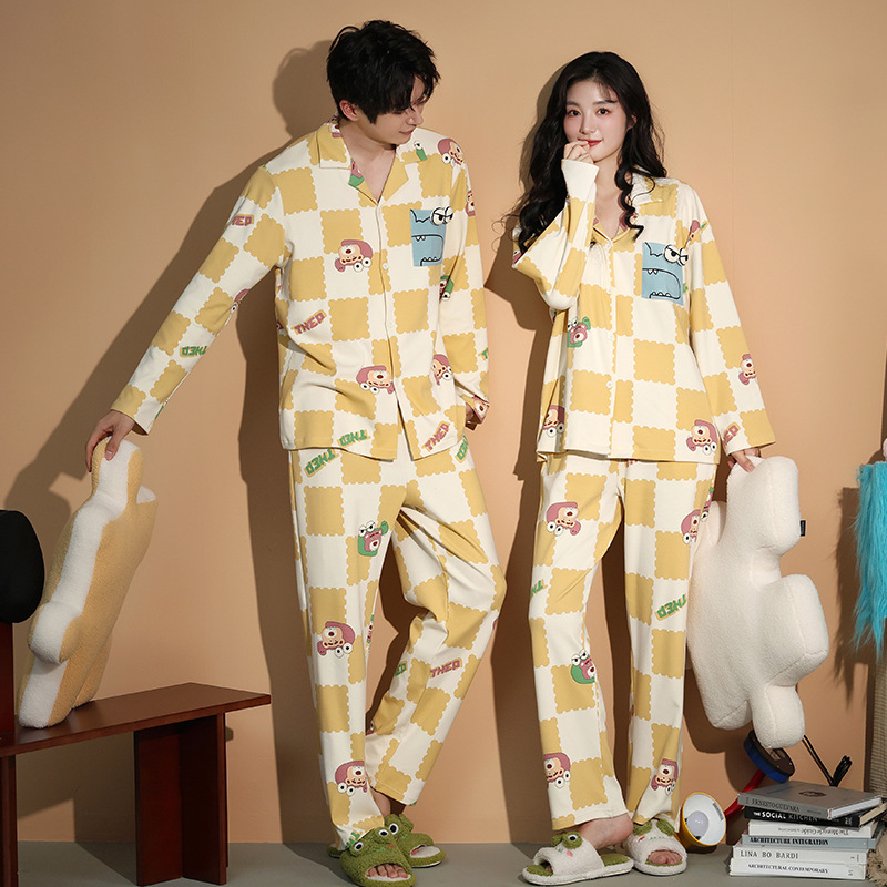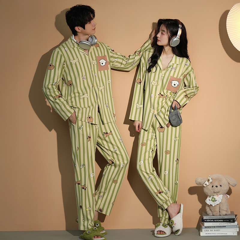 가을 패션 퓨어 코튼 커플 파자마 여성 가슴 패드 긴 소매 만화 인쇄 캐주얼 카디건 남성 홈 의류 세트스토어 가기