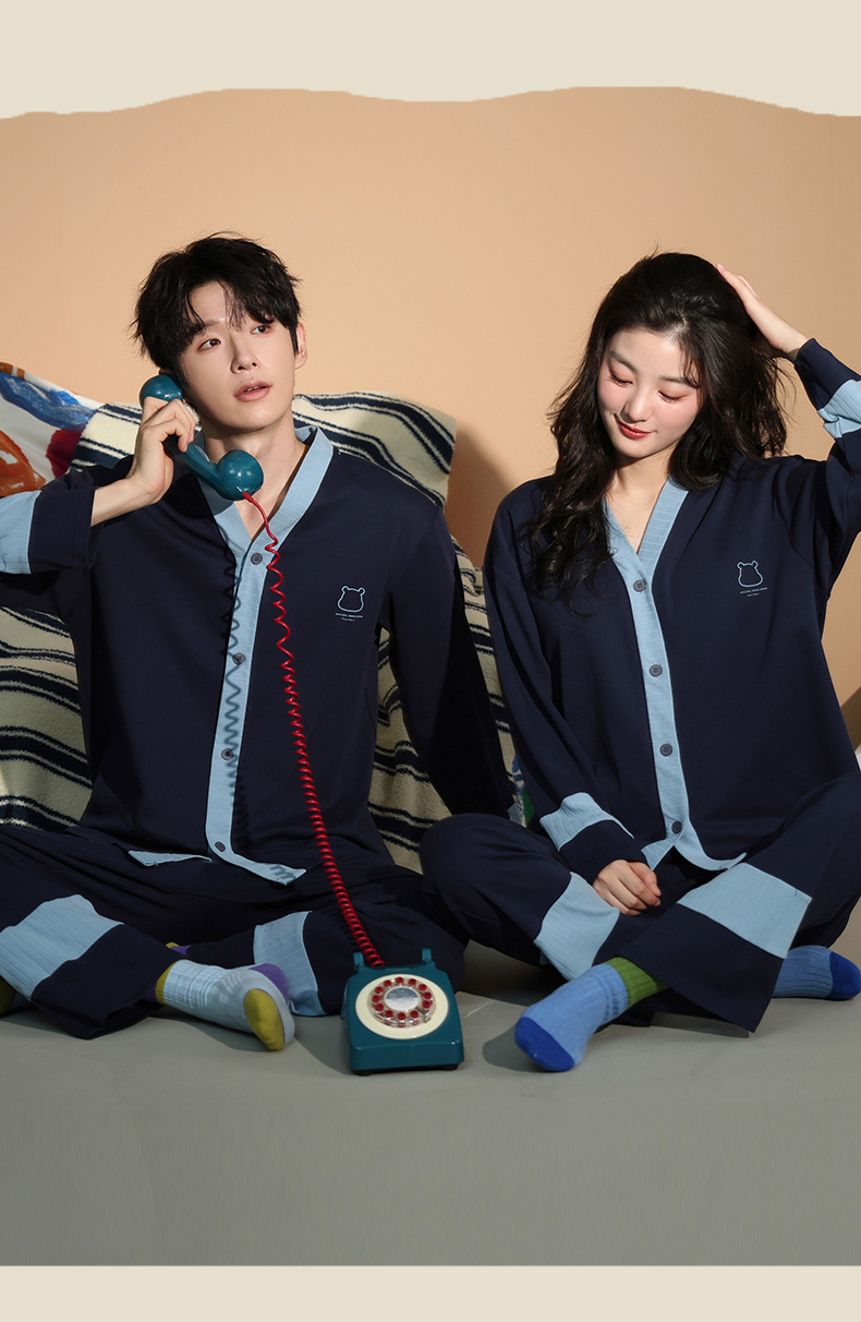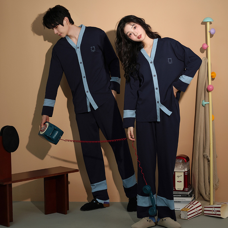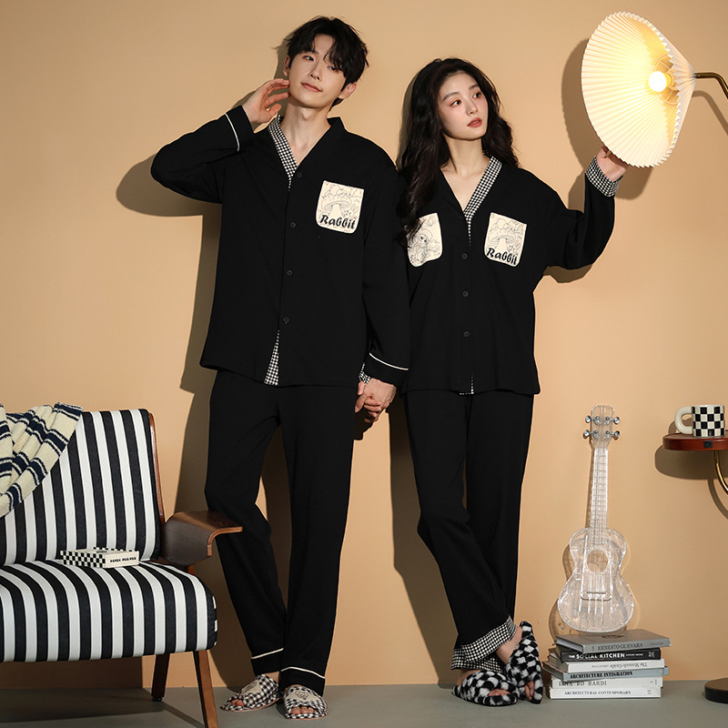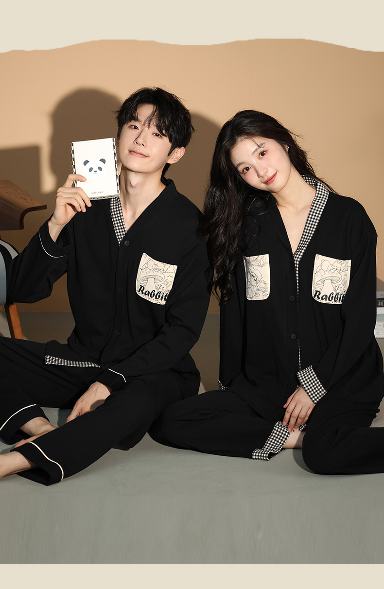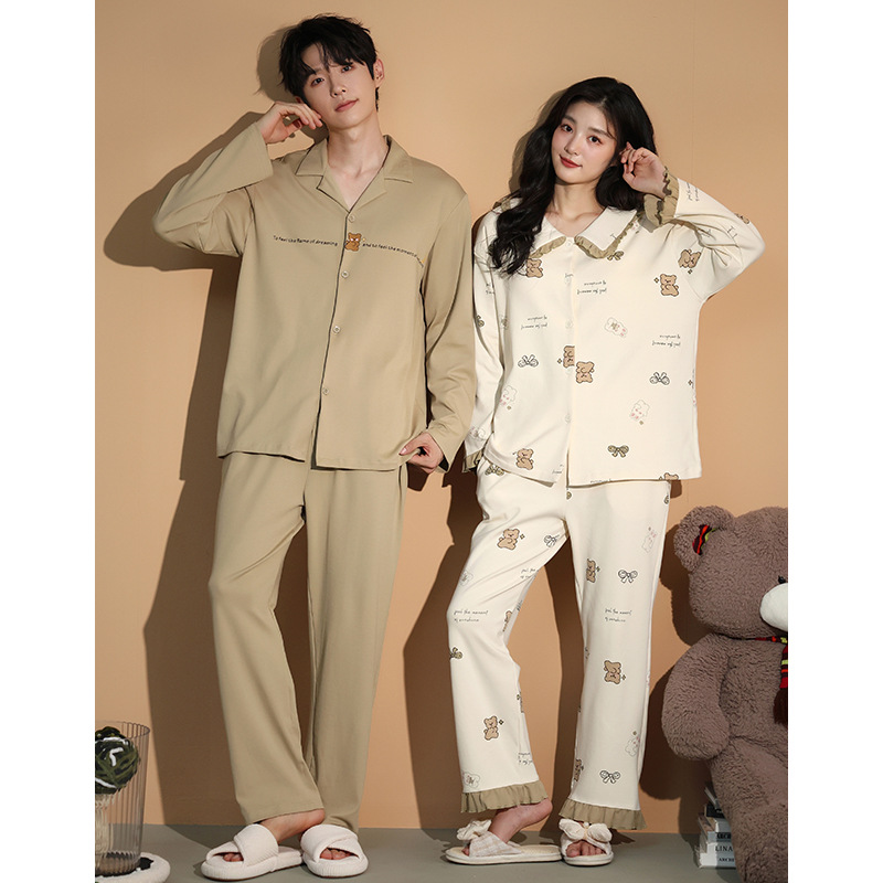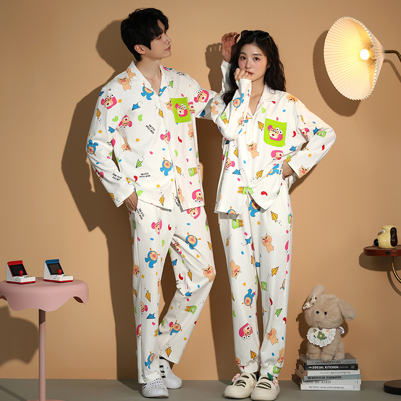 가을 패션 퓨어 코튼 커플 파자마 여성 가슴 패드 긴 소매 만화 인쇄 캐주얼 카디건 남성 홈 의류 세트