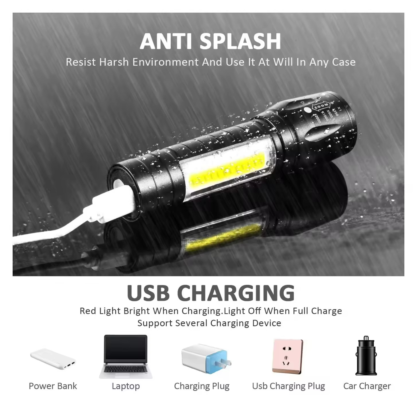 LED 손전등 COB 측면 망원경 줌 장거리 USB 충전 휴대용 조명 다기능 작업 조명
