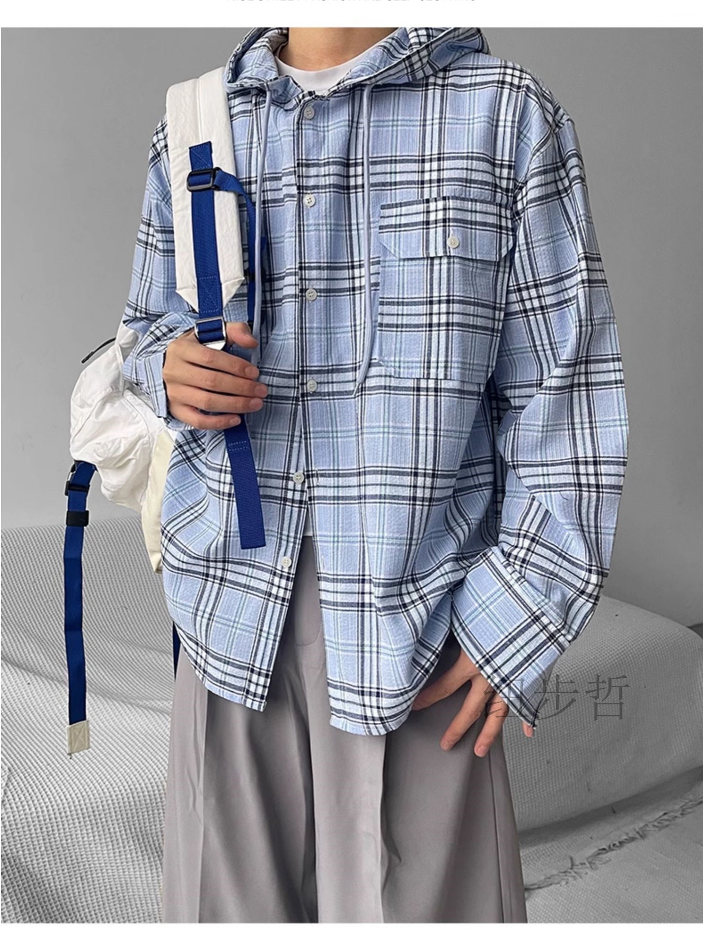 미국식 봄과 가을 격자 무늬 긴팔 셔츠 후드 남성 및 여성 캐주얼 격자 무늬 셔츠 느슨한 커플 코트 남성용 탑스토어 가기