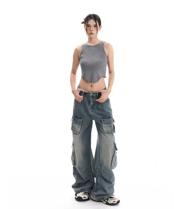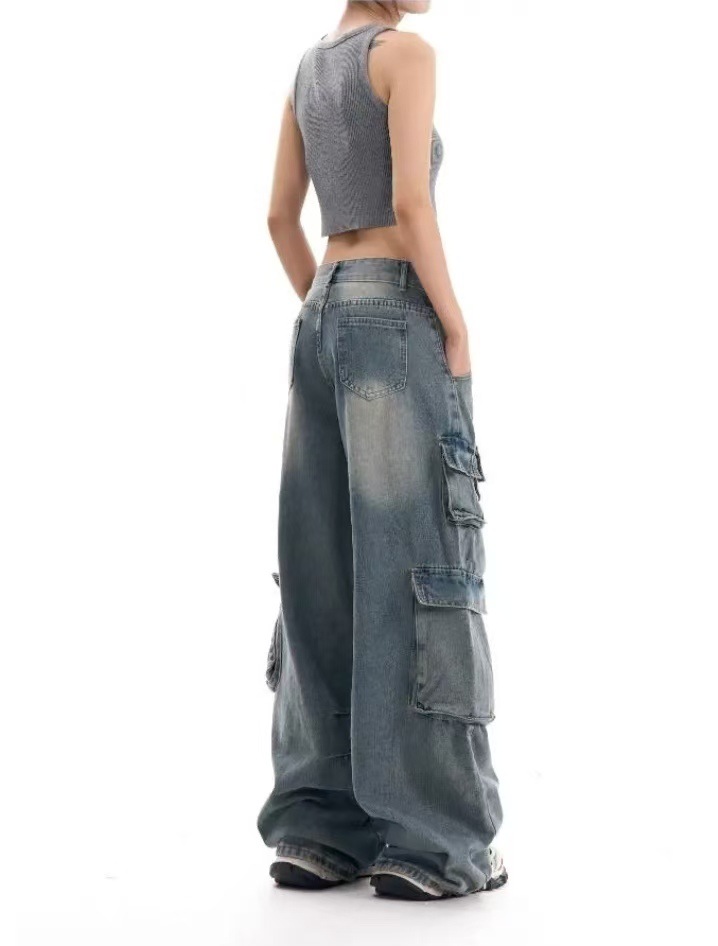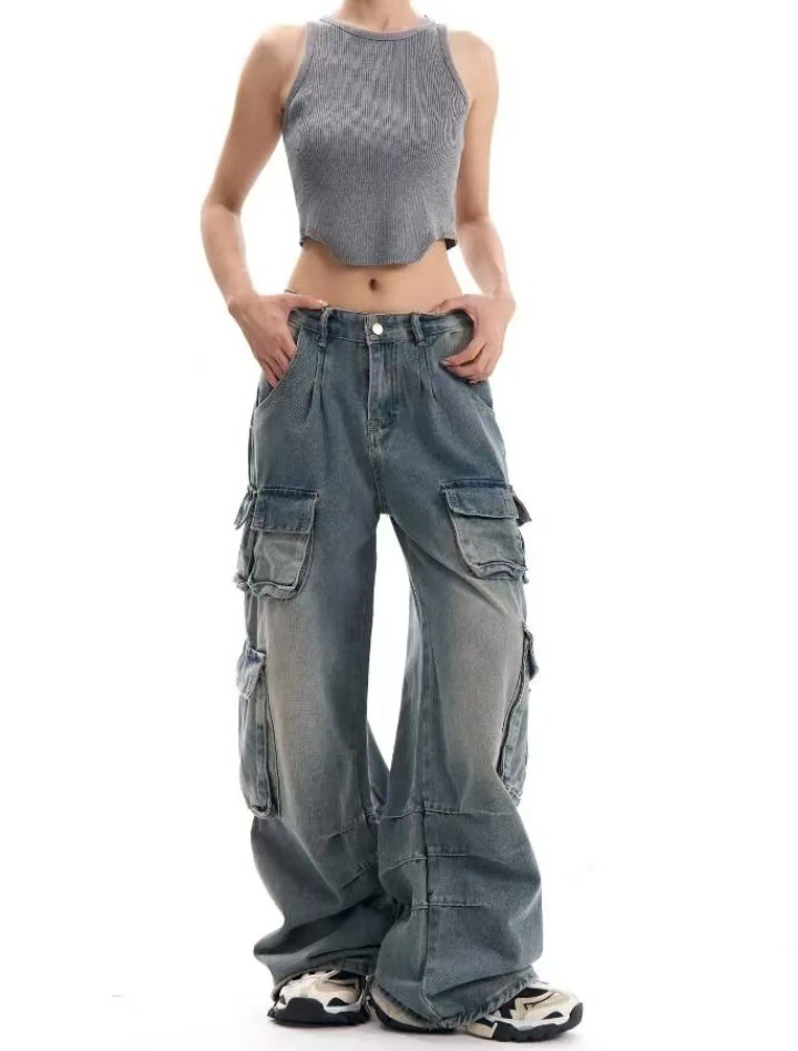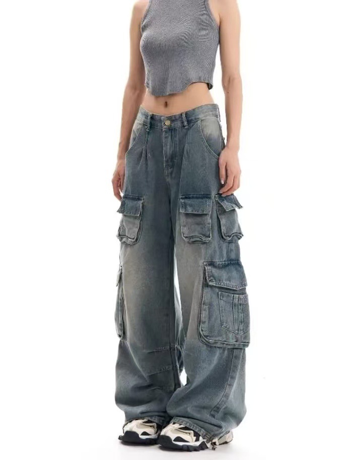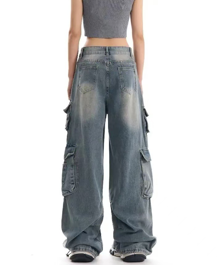 2024 가을 새로운 유럽과 미국 스타일 Y2K 뜨거운 소녀 청바지 여성용 툴링 트렌디 한 오래된 디자인 센스 걸레 바지