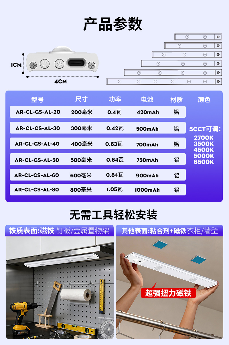 超薄智能人体感应led灯 磁吸自粘长条衣柜灯带充电式酒柜橱柜灯条