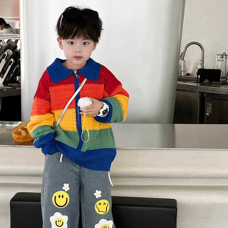2025 봄과 가을 새 소년 중공 니트 무지개 스웨터 카디건 소년 스타일 재킷 중소 어린이상의