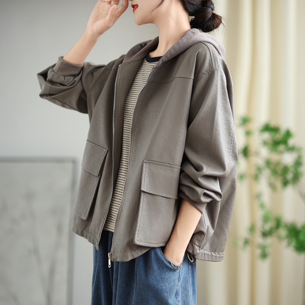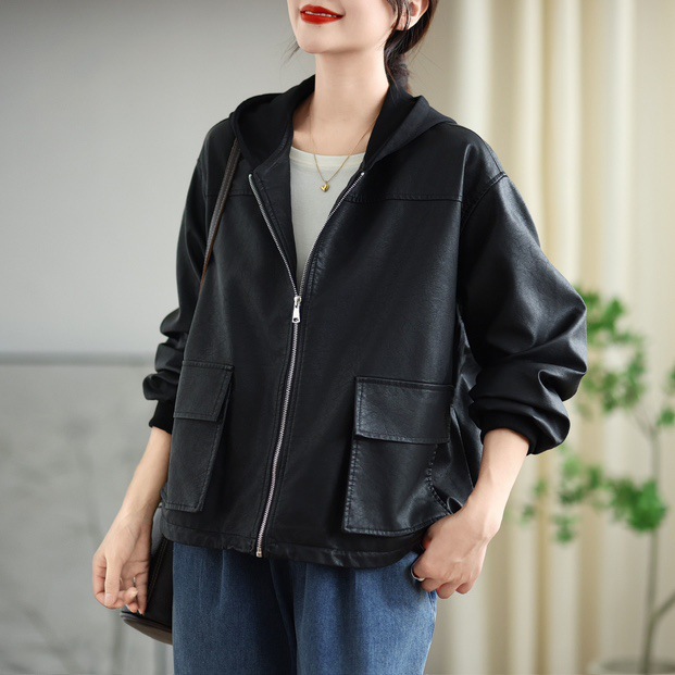 패션 세련 된 큰 포켓 후드 PU 가죽 자켓 여성 한국식 느슨한 올매치 캐주얼 우아한 카디건 자켓