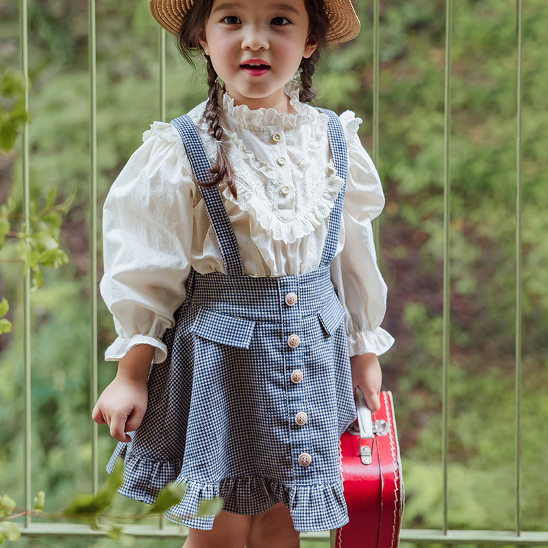 2025 가을 딸기 샌드라 한국 아동 여아용 러플 레이스 A라인 서스펜더 스커트 작은 격자무늬 서스펜더 스커트스토어 가기