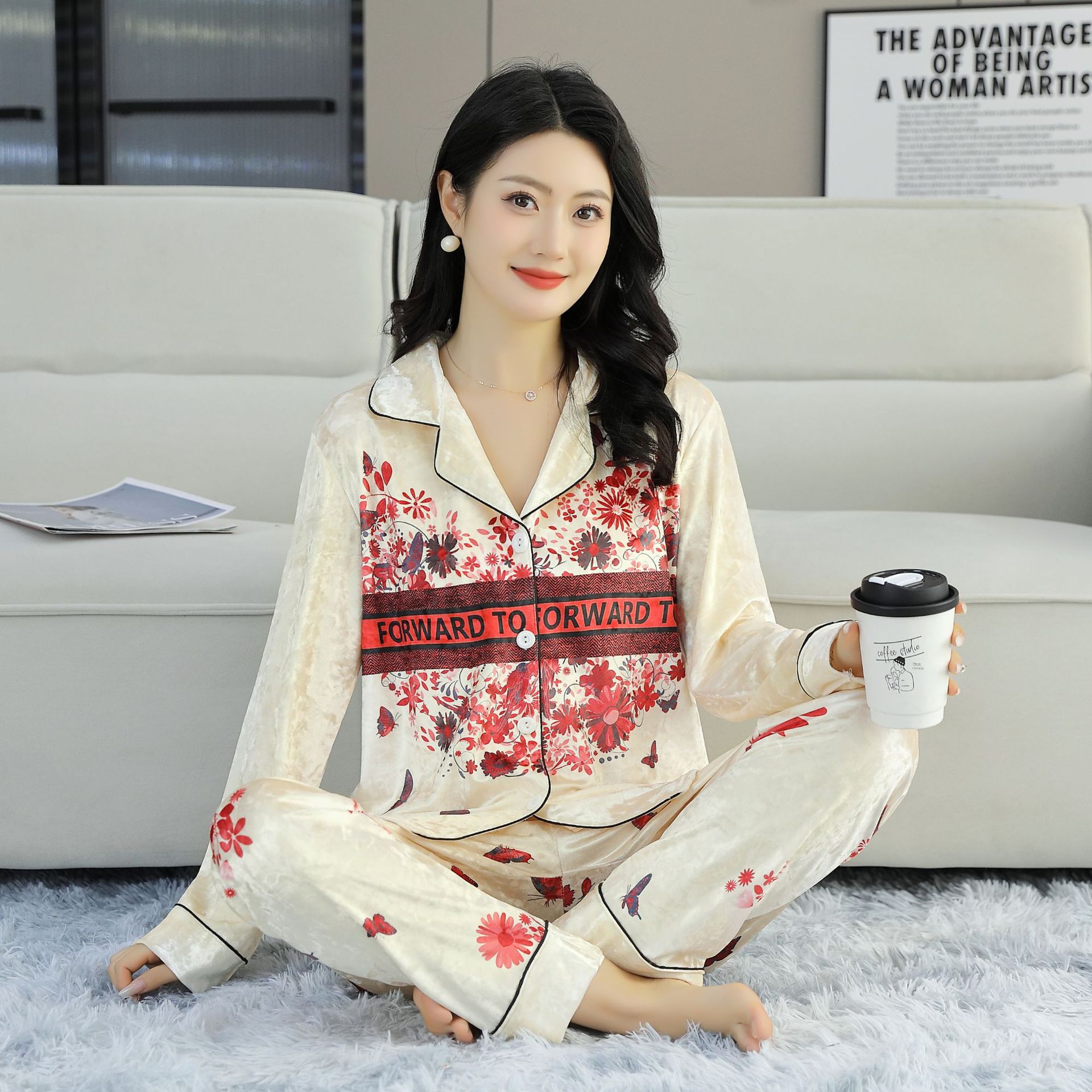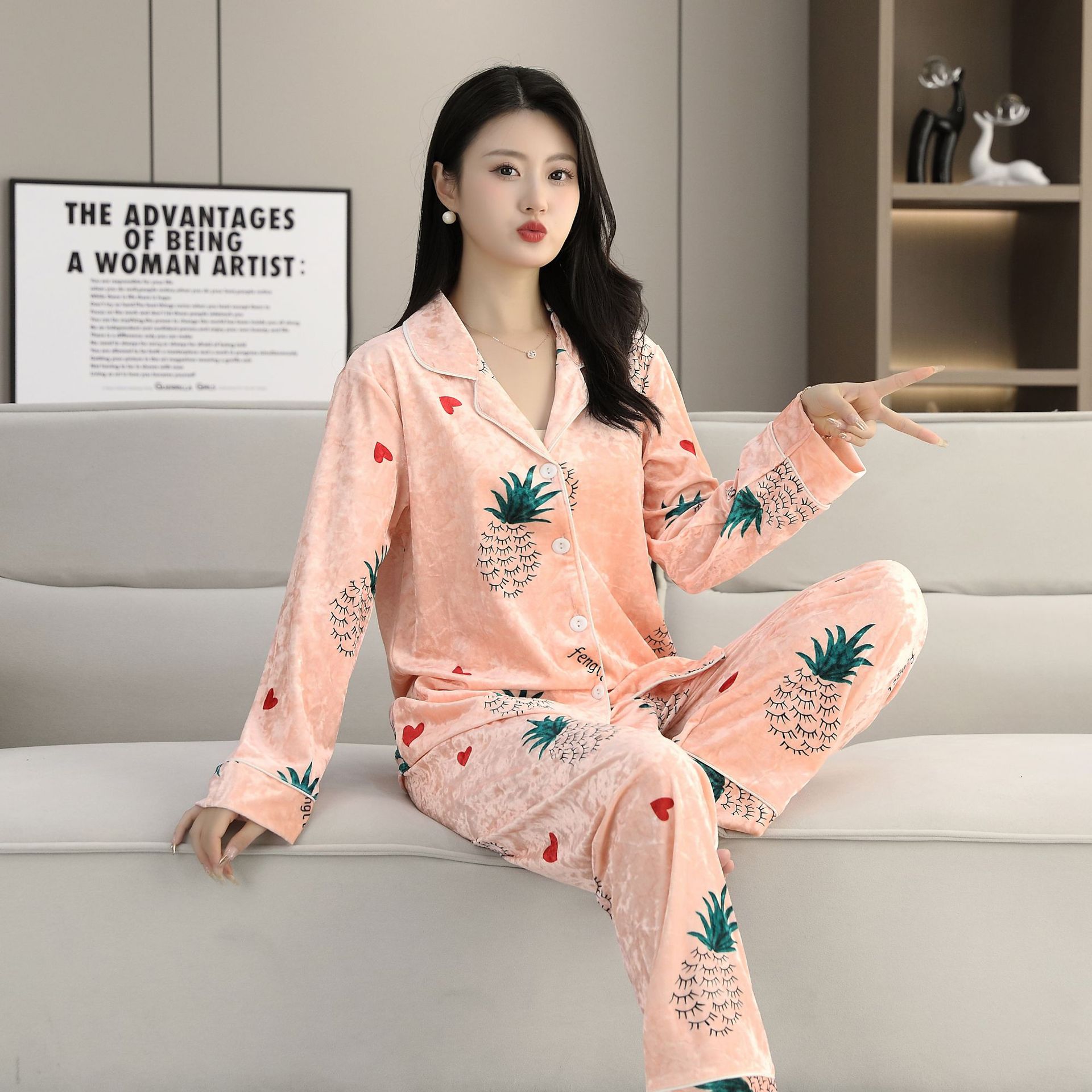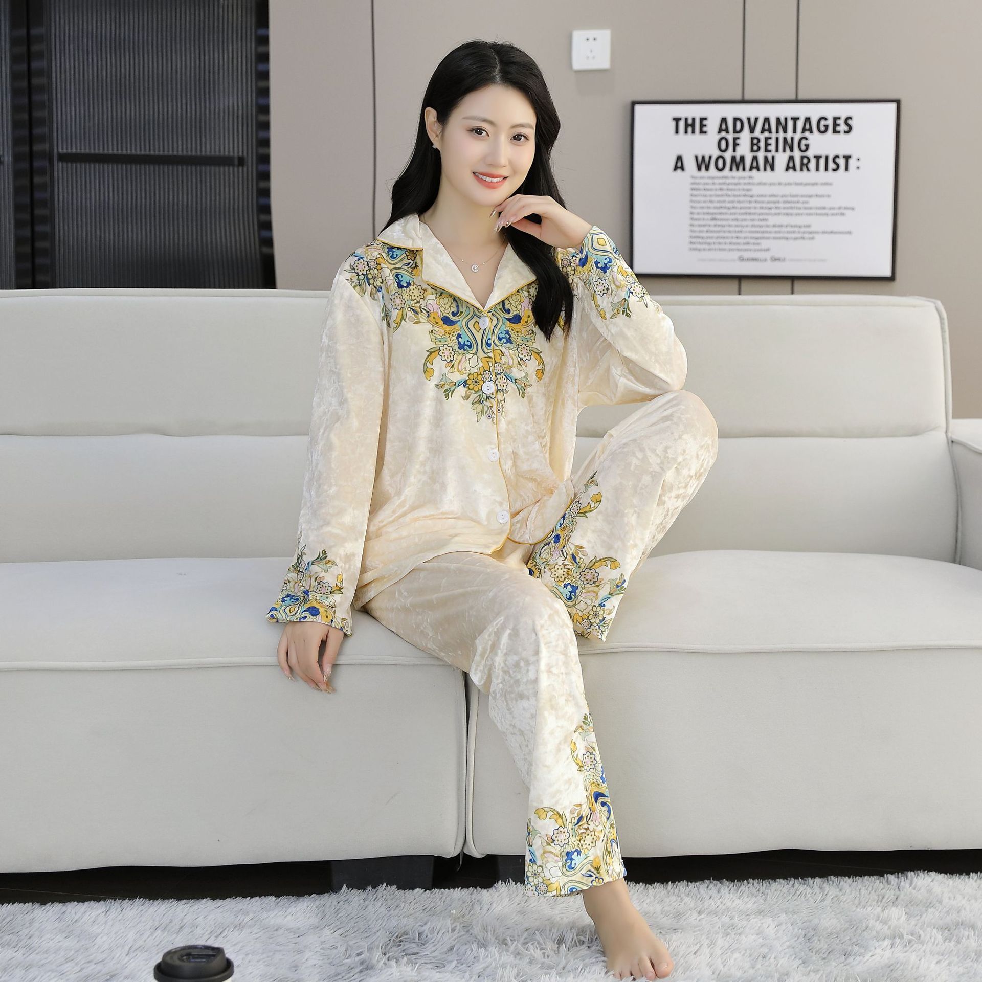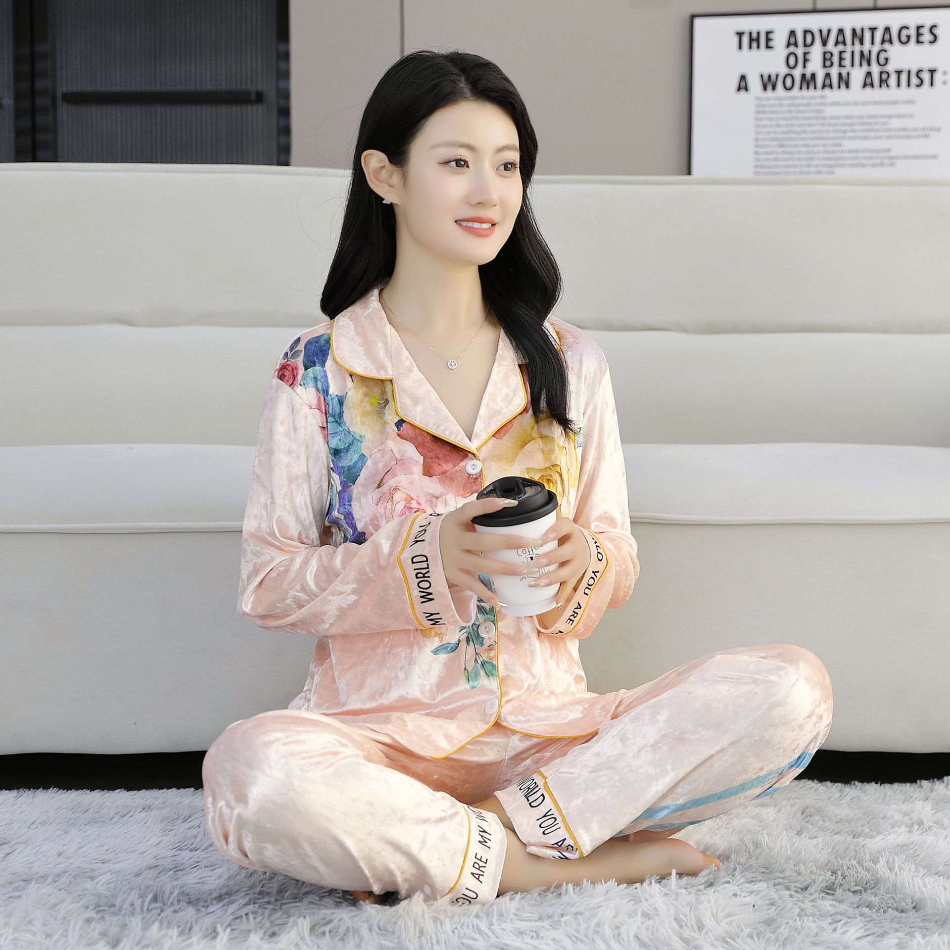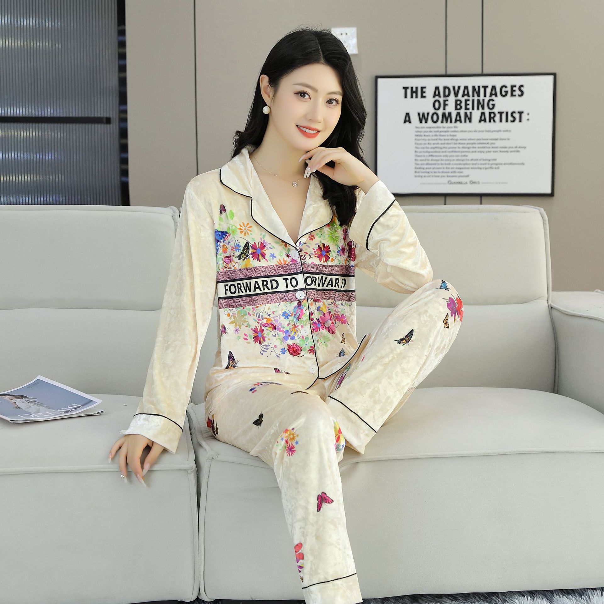 여성용 골드 벨벳 잠옷 가을 겨울 긴팔 투피스 세트 남통 홈웨어 골드 다이아몬드 벨벳 고급스러운 느낌 대형 사이즈 도매스토어 가기