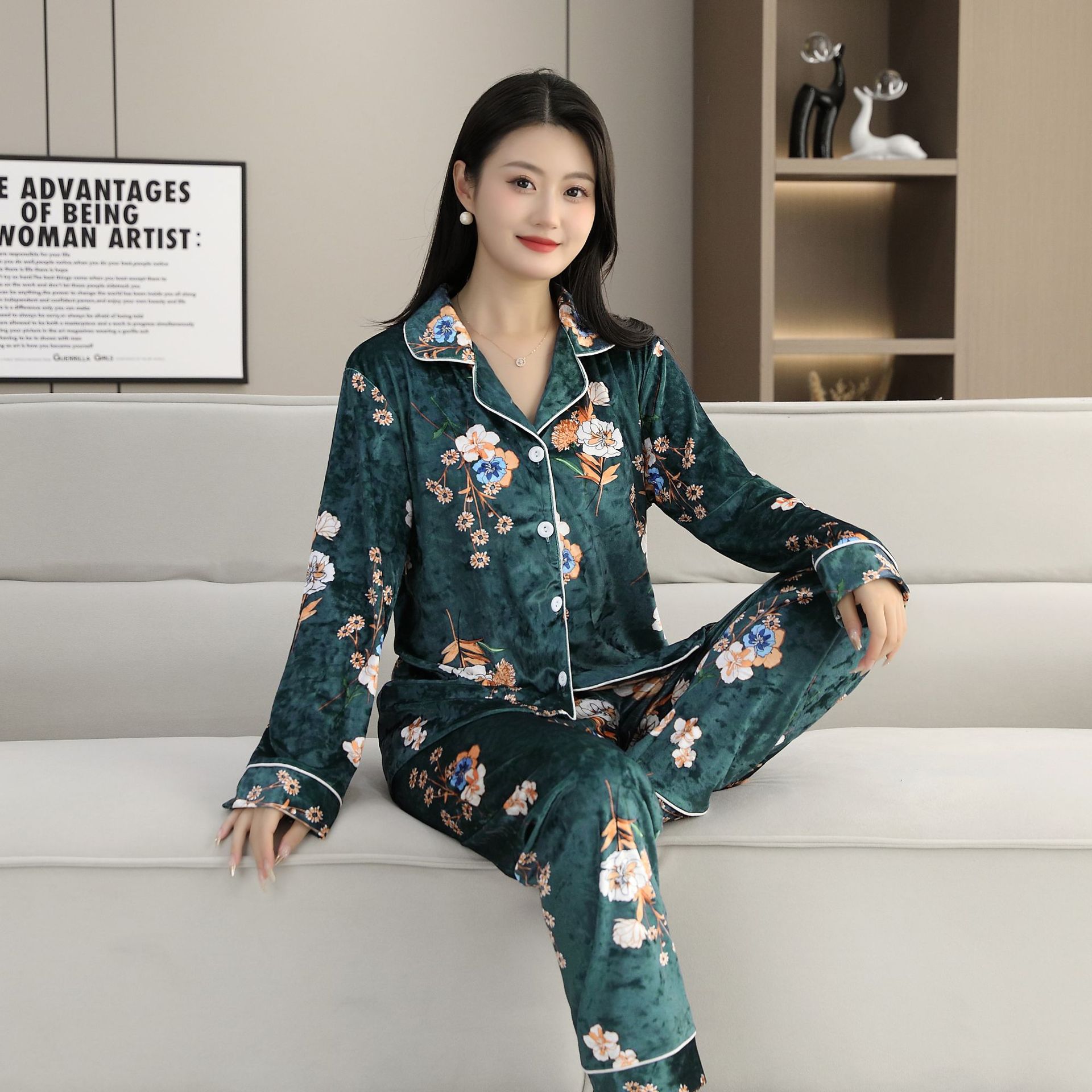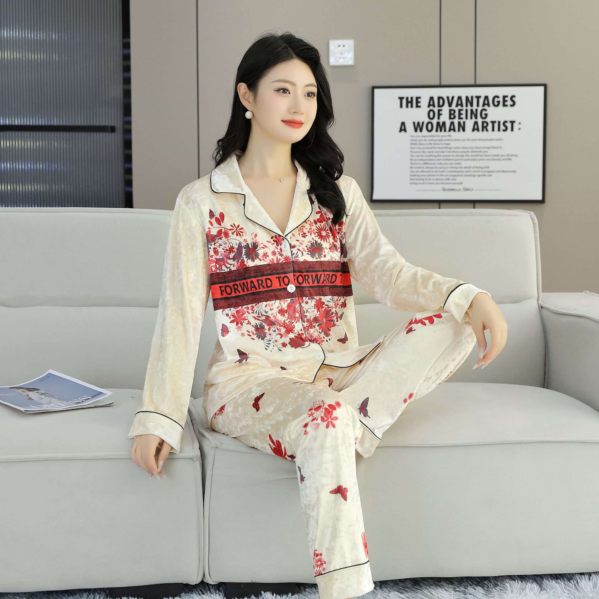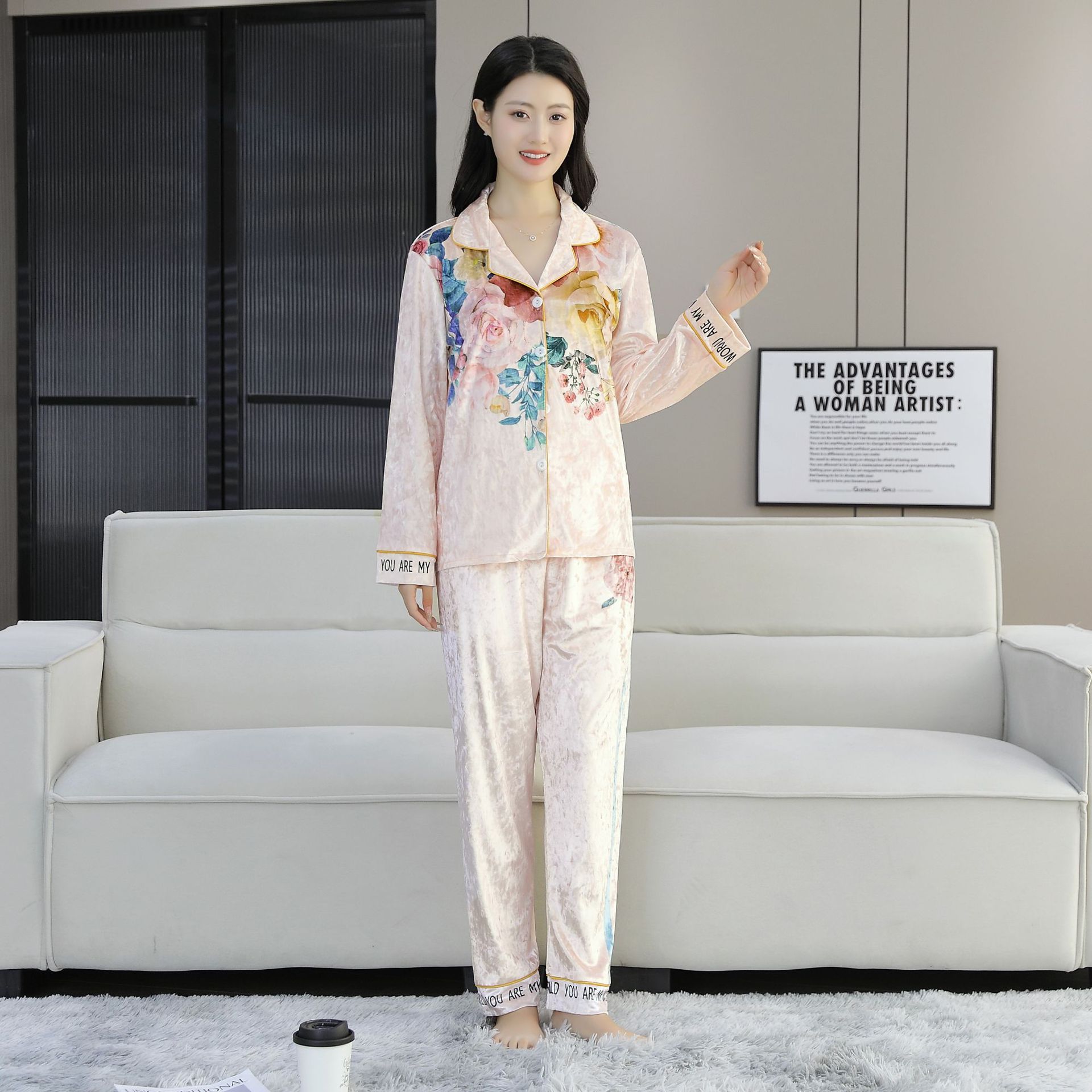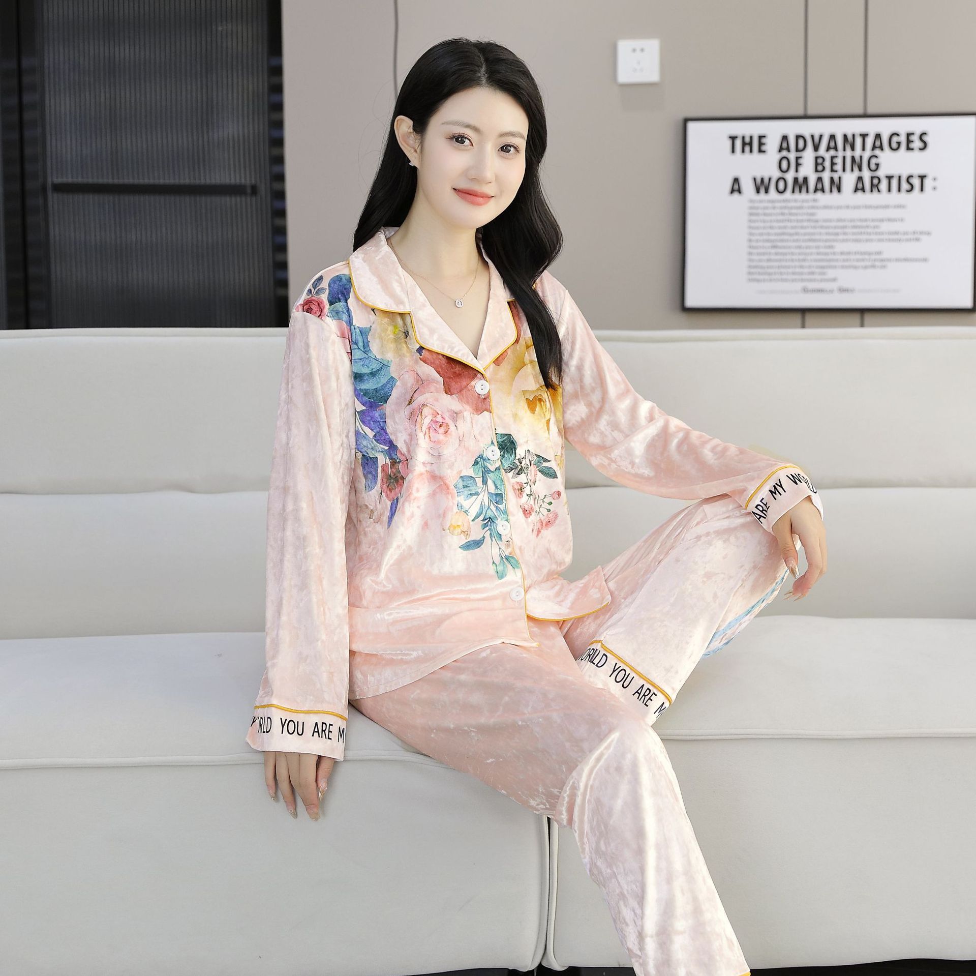 여성용 골드 벨벳 잠옷 가을 겨울 긴팔 투피스 세트 남통 홈웨어 골드 다이아몬드 벨벳 고급스러운 느낌 대형 사이즈 도매스토어 가기