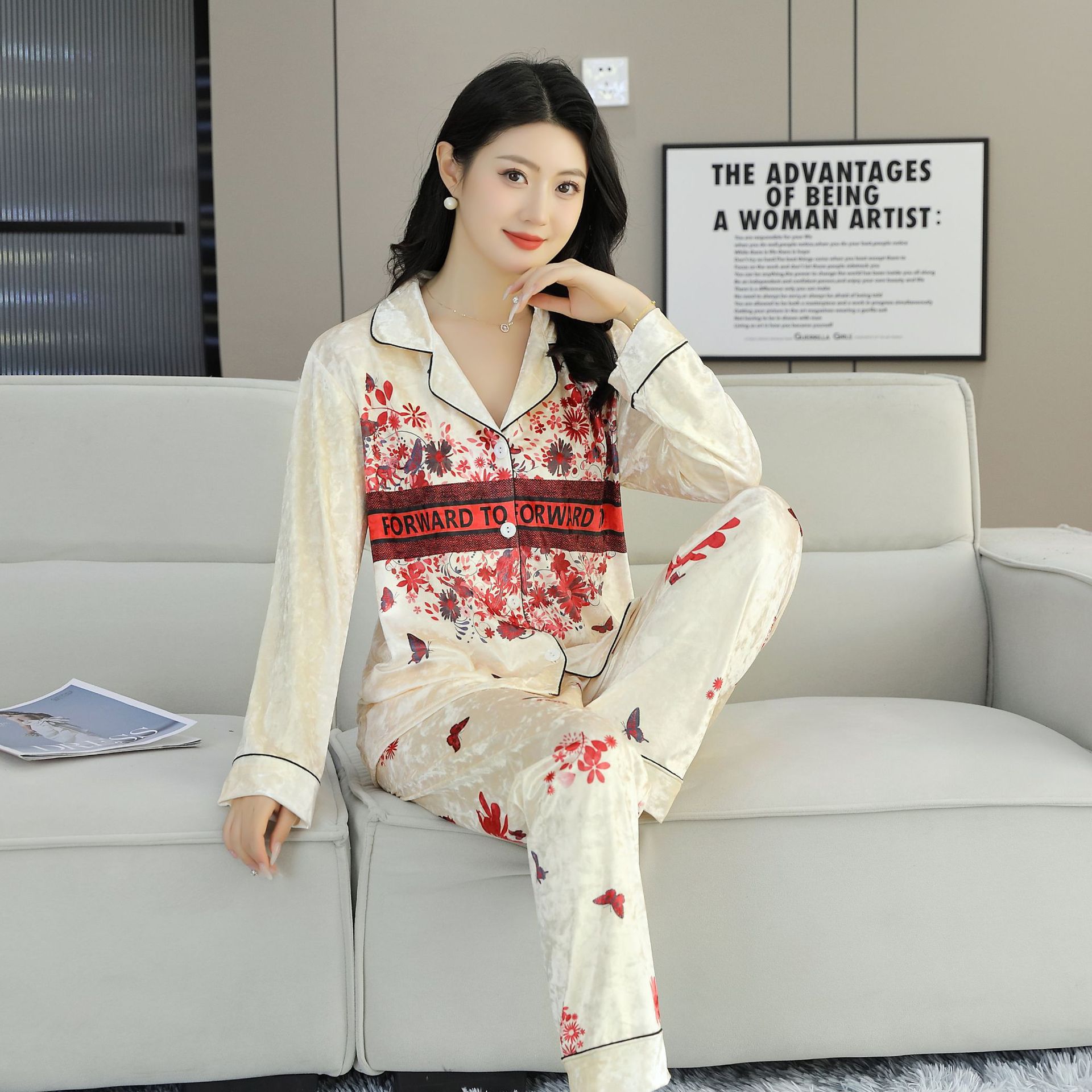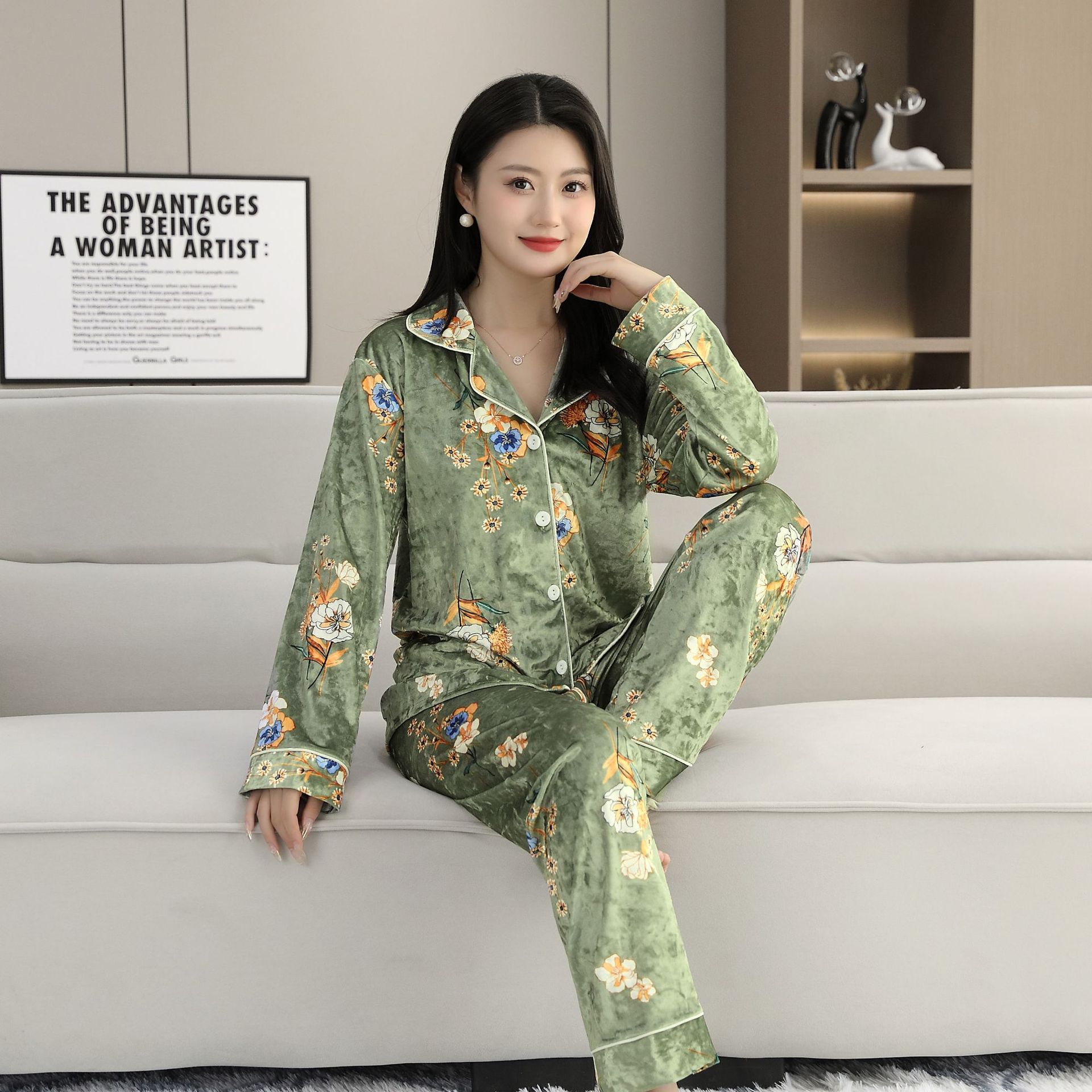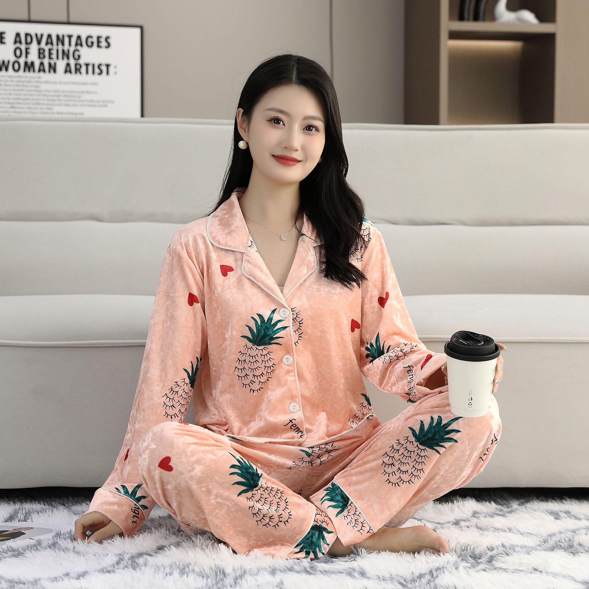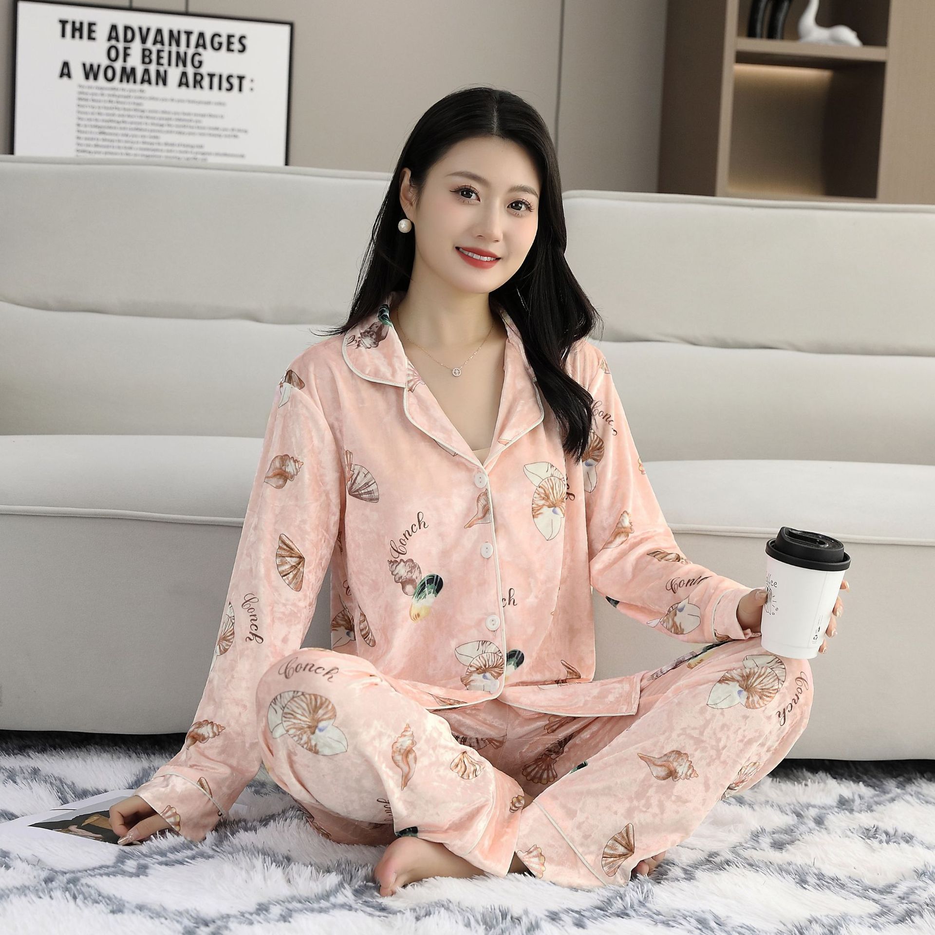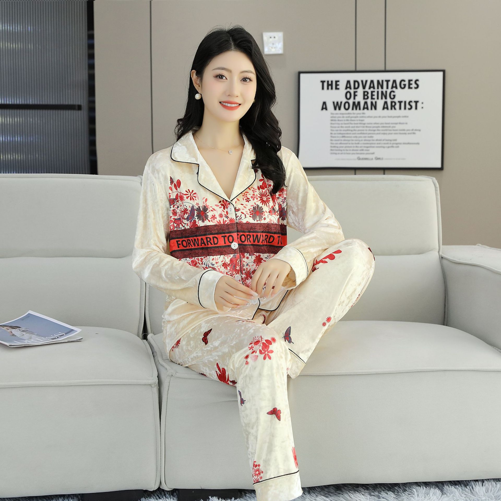 여성용 골드 벨벳 잠옷 가을 겨울 긴팔 투피스 세트 남통 홈웨어 골드 다이아몬드 벨벳 고급스러운 느낌 대형 사이즈 도매스토어 가기