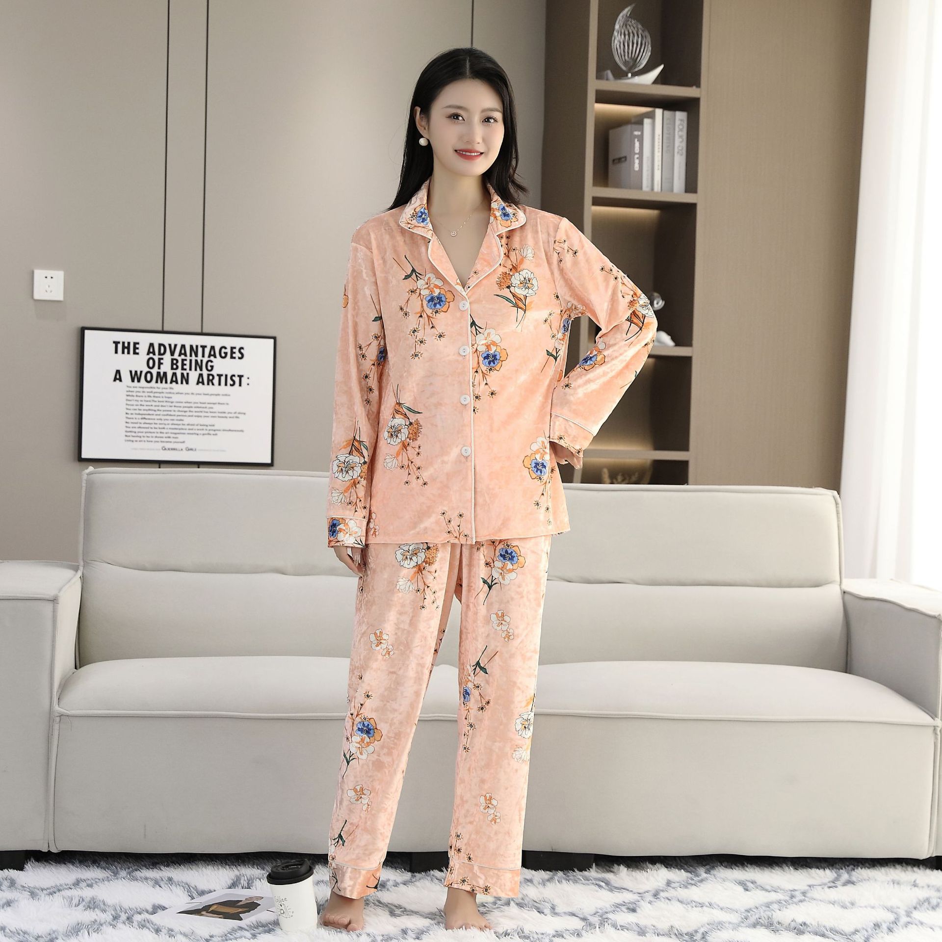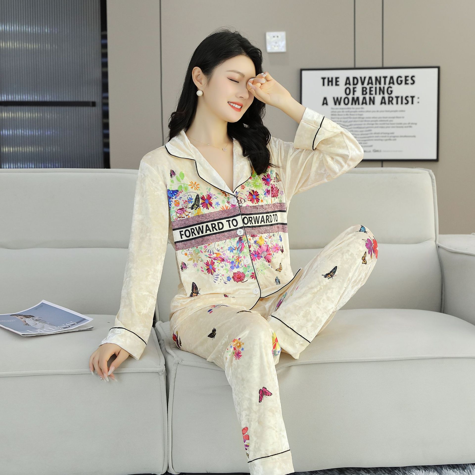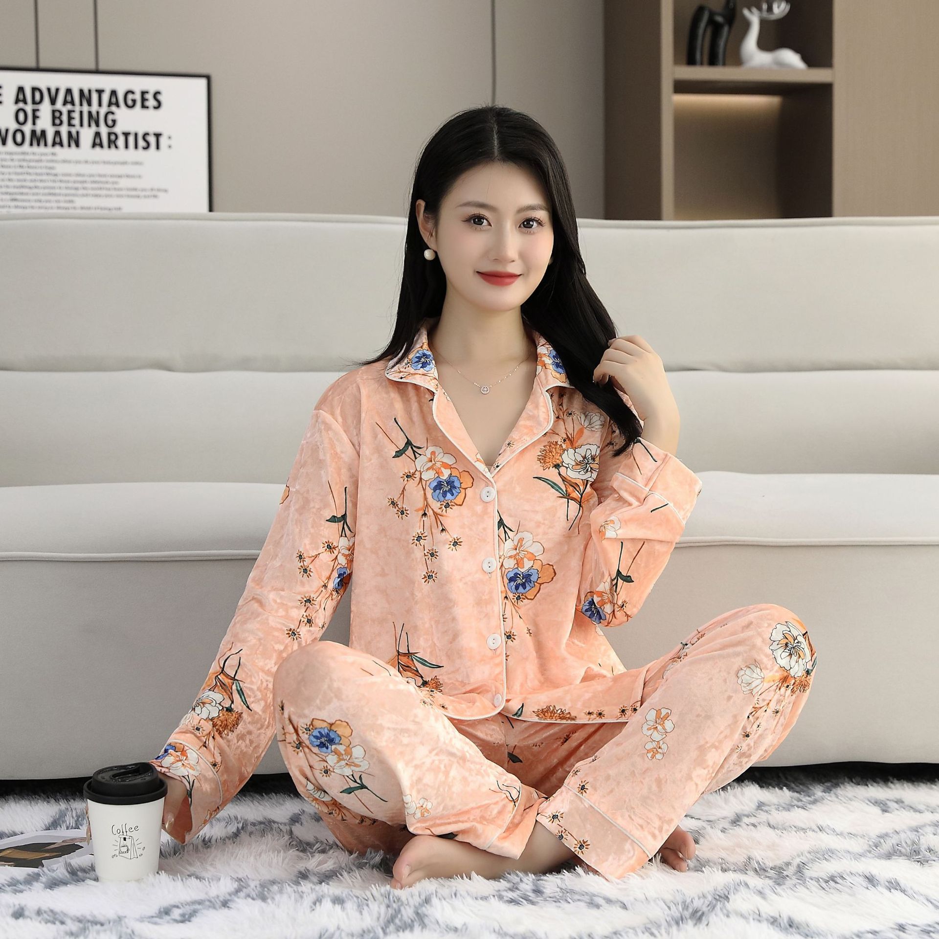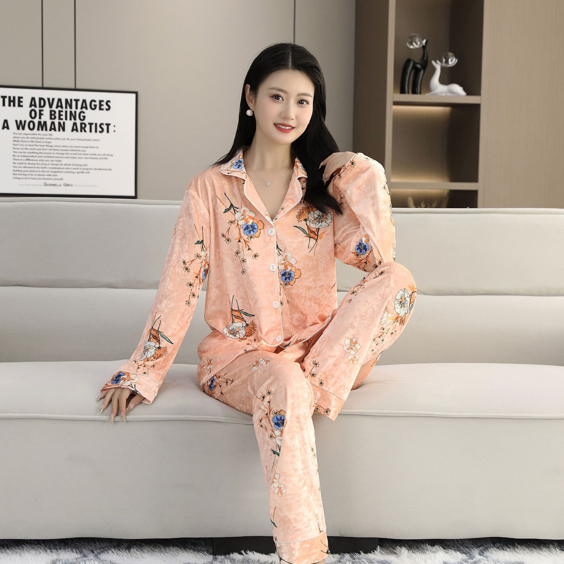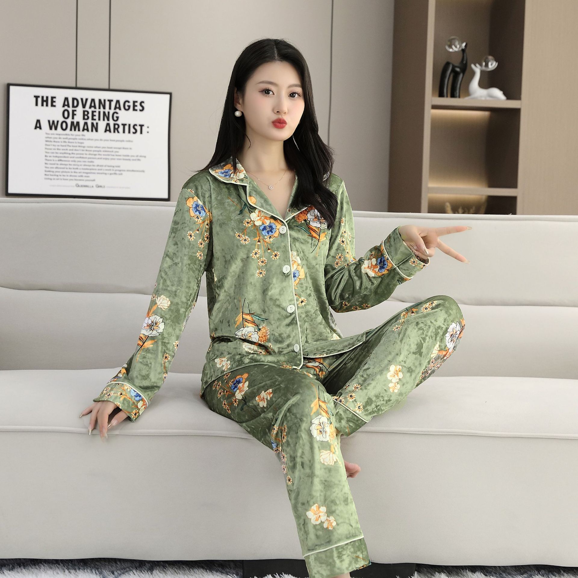 여성용 골드 벨벳 잠옷 가을 겨울 긴팔 투피스 세트 남통 홈웨어 골드 다이아몬드 벨벳 고급스러운 느낌 대형 사이즈 도매스토어 가기