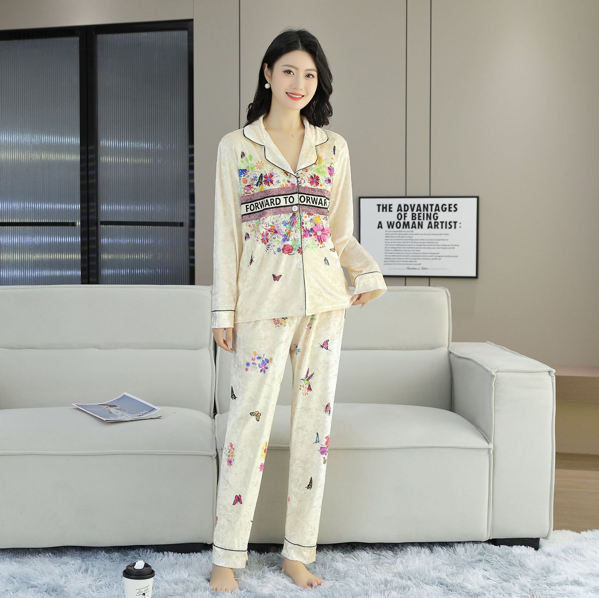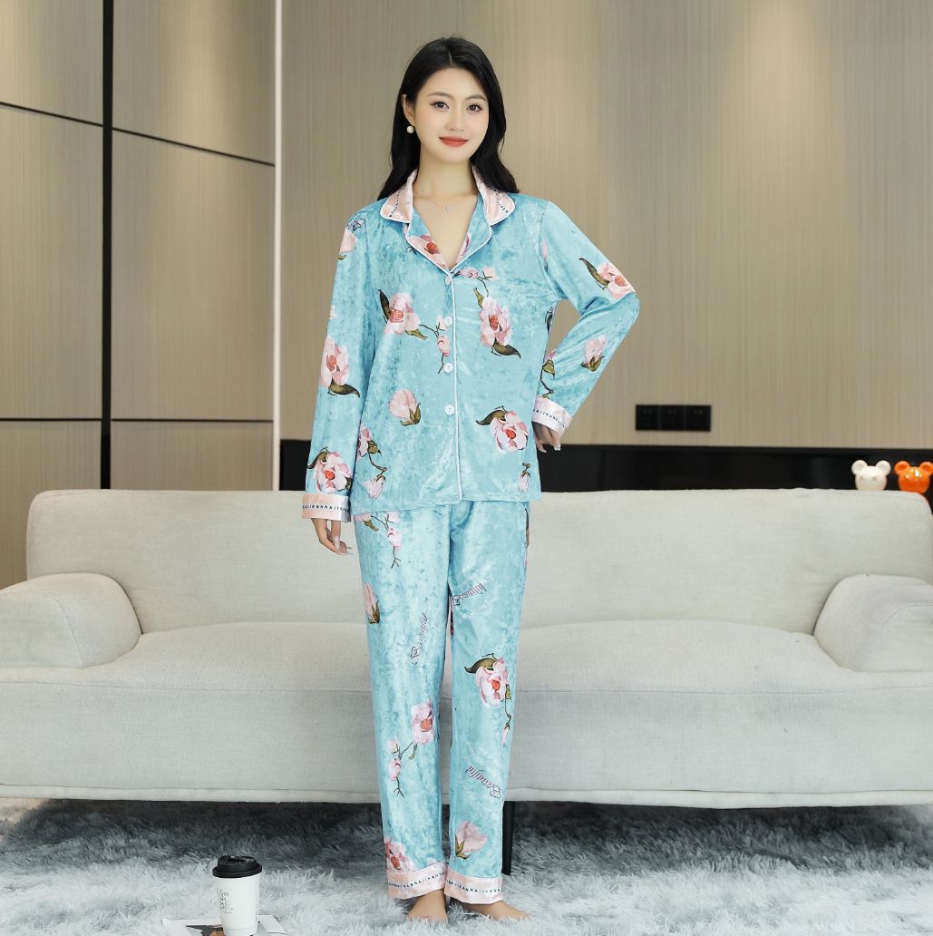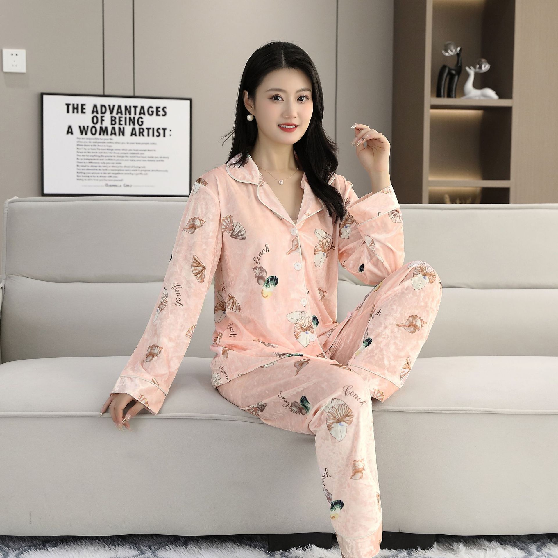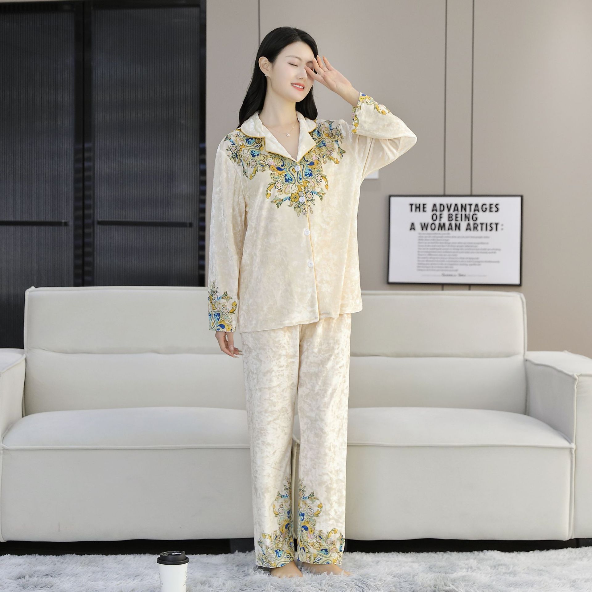 여성용 골드 벨벳 잠옷 가을 겨울 긴팔 투피스 세트 남통 홈웨어 골드 다이아몬드 벨벳 고급스러운 느낌 대형 사이즈 도매스토어 가기
