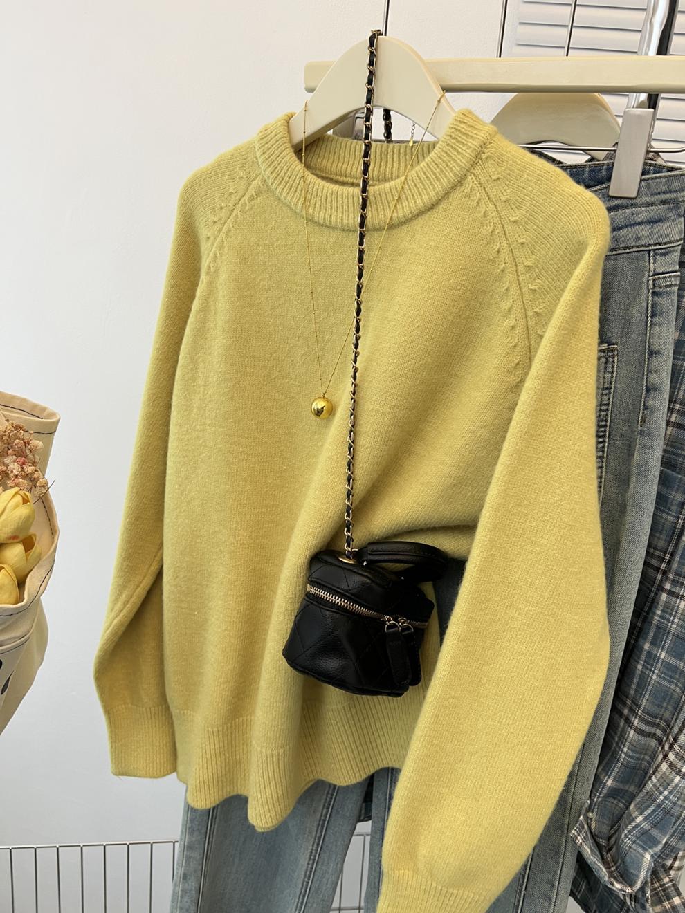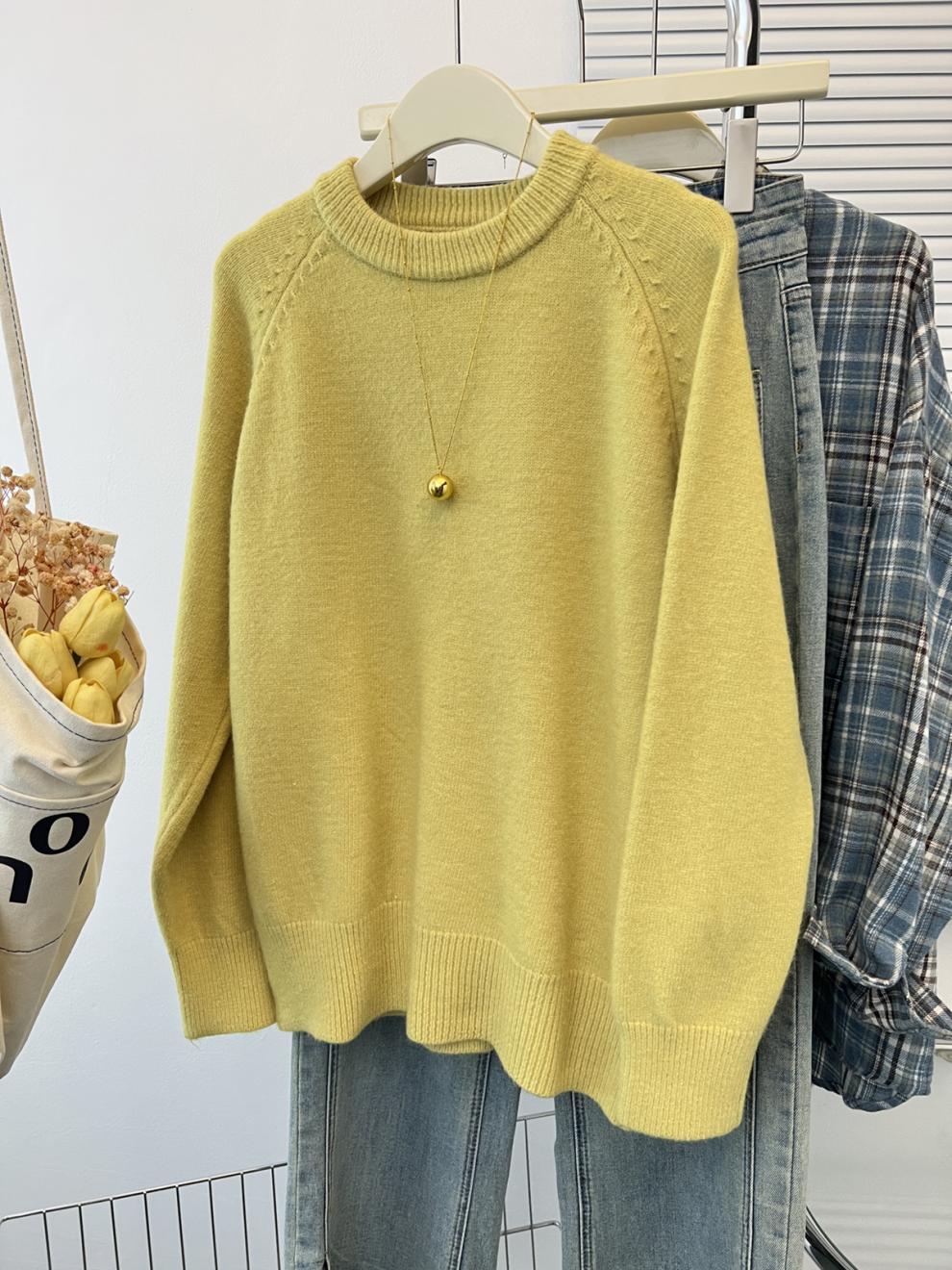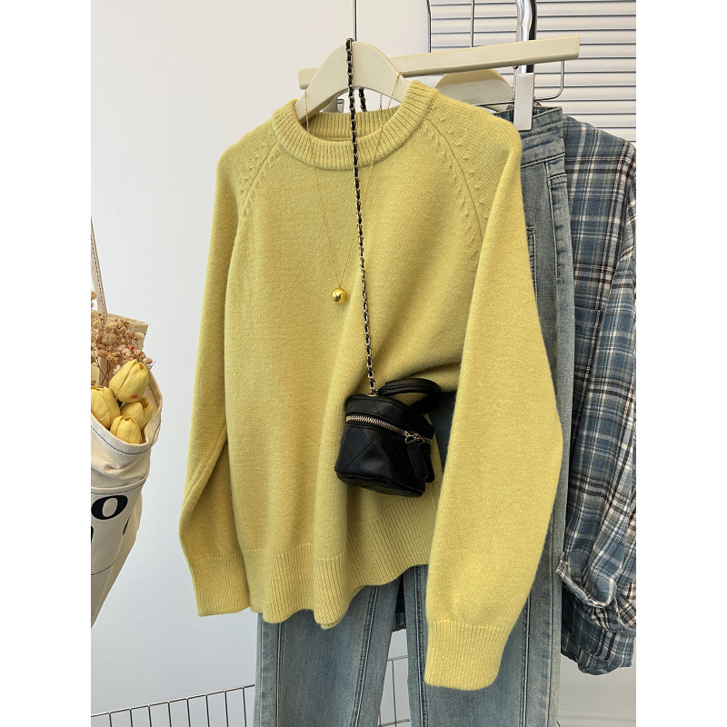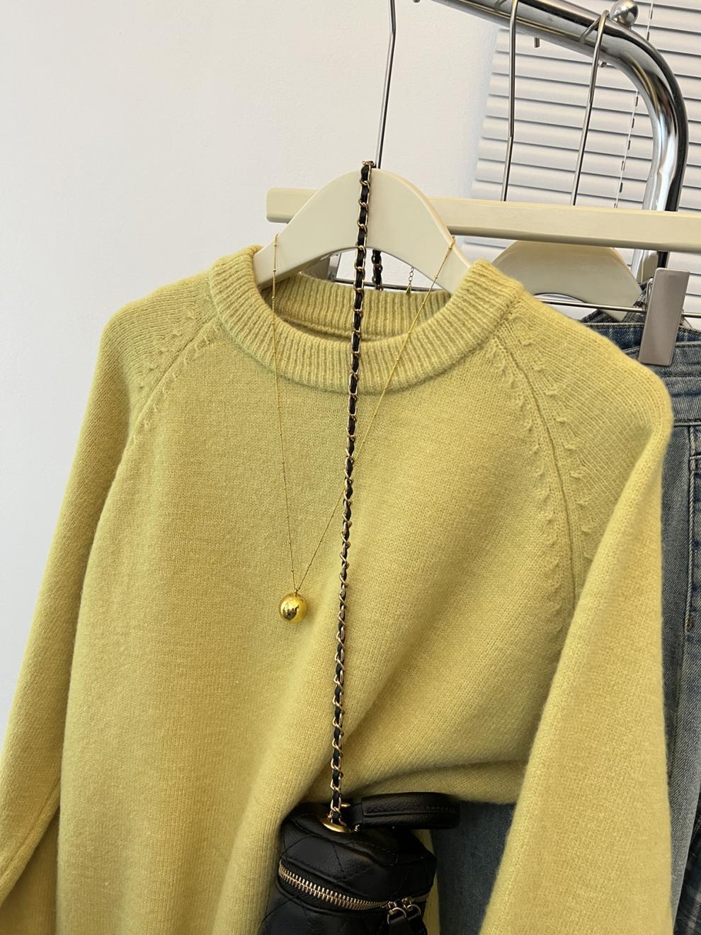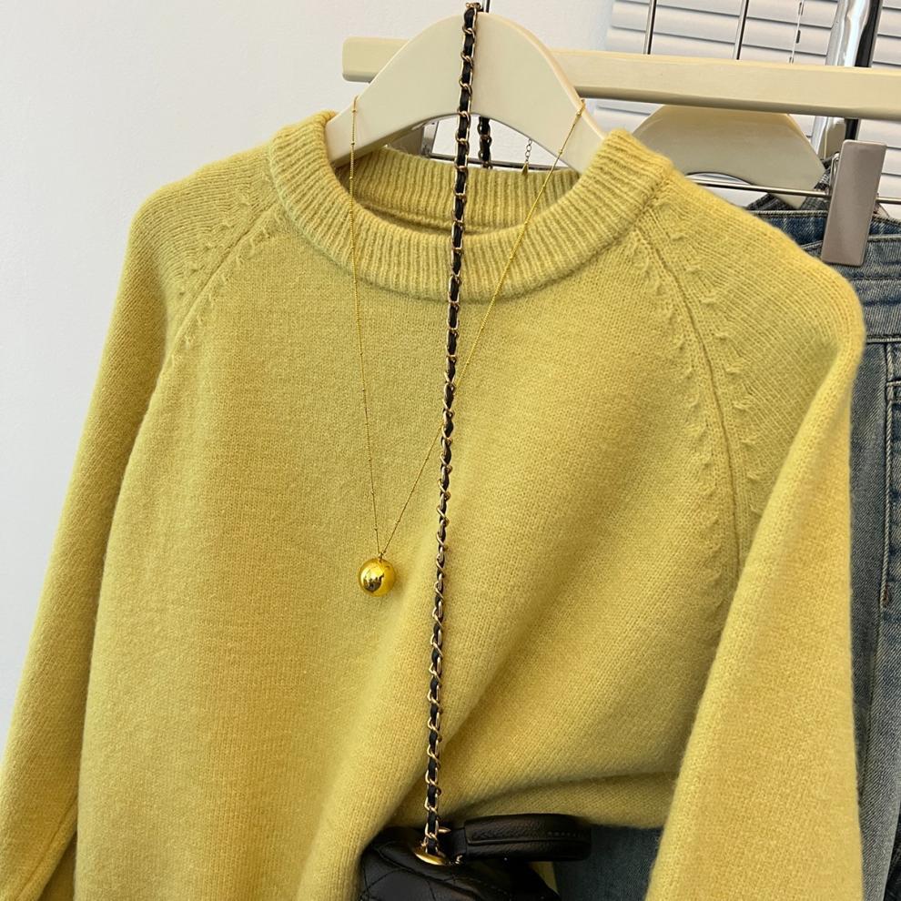 리얼 샷 ~ 쇼 화이트 머스타드 옐로우 너구리 벨벳 크루 넥 풀오버 스웨터 여성의 가을과 겨울 두꺼운 겨울 베이스 뜨개질