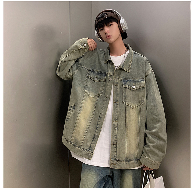 노란색 진흙 염색 도구 데님 코트 남성 봄과 가을 미국 거리 복고풍 하이 엔드 힙합 재킷 틈새 디자인
