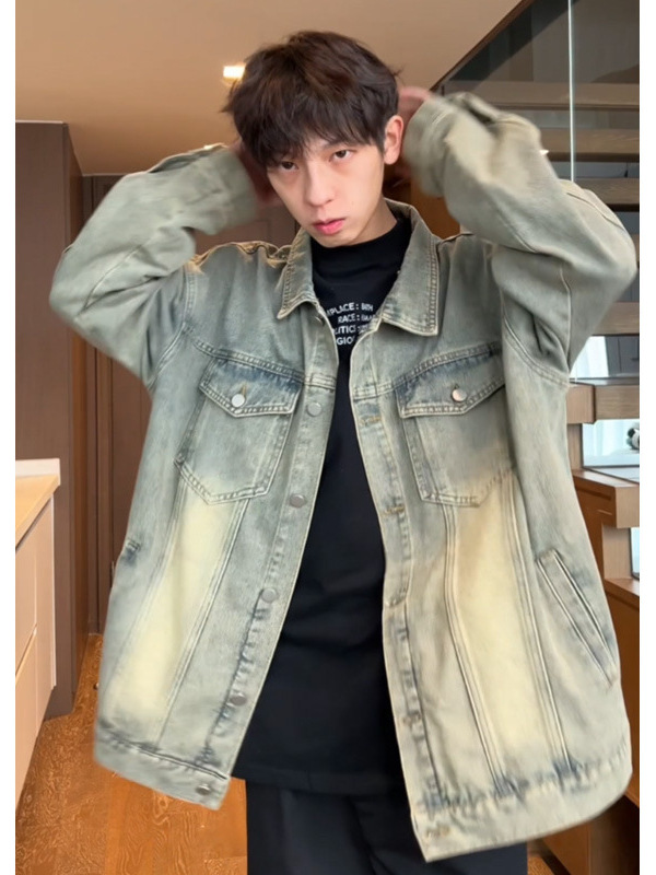 노란색 진흙 염색 도구 데님 코트 남성 봄과 가을 미국 거리 복고풍 하이 엔드 힙합 재킷 틈새 디자인스토어 가기