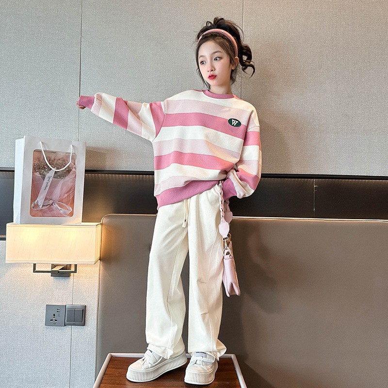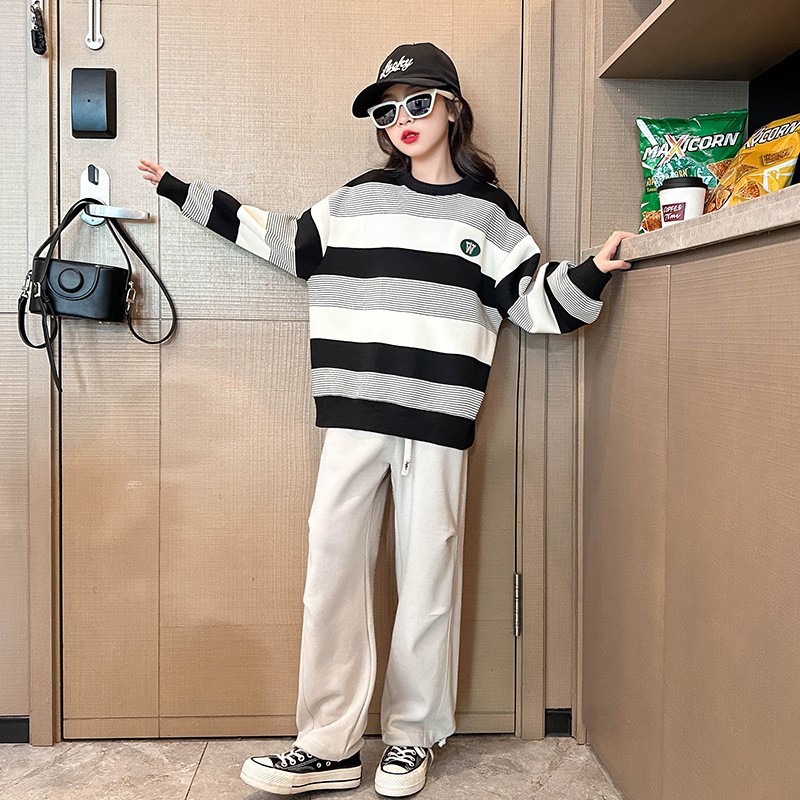 24 봄과 가을 소녀 패션 2 색 줄무늬 긴팔 티셔츠 느슨한 캐주얼 스웨트 미중 및 큰 어린이를위한 세련된 풀오버 탑