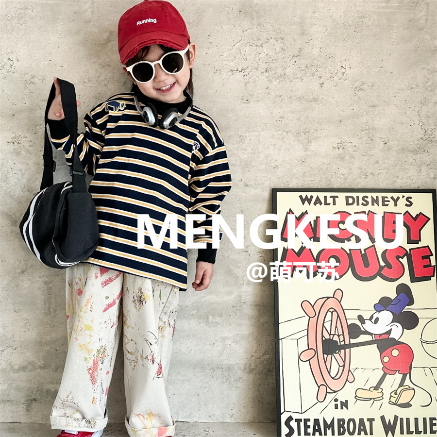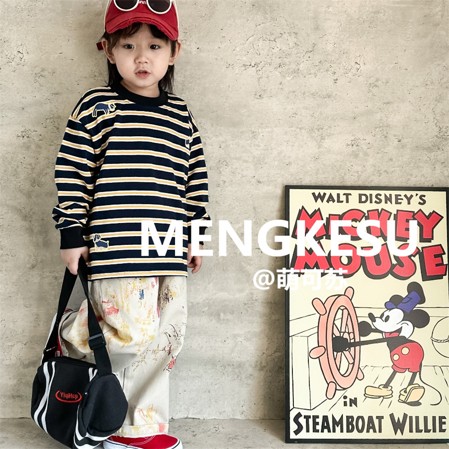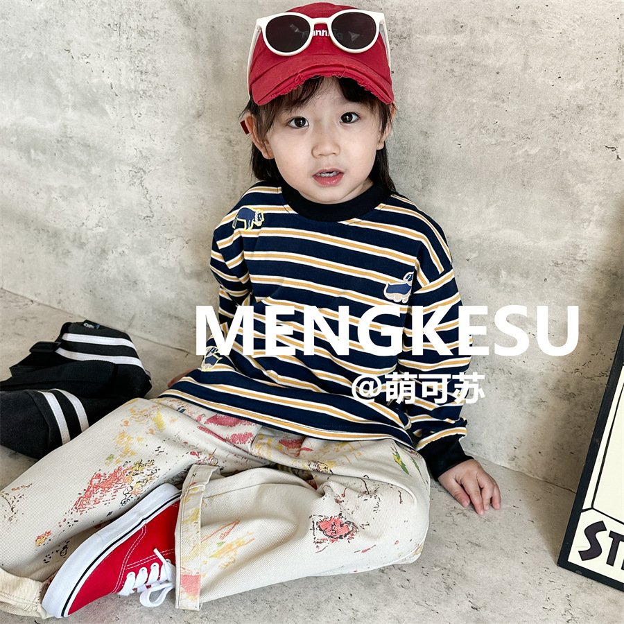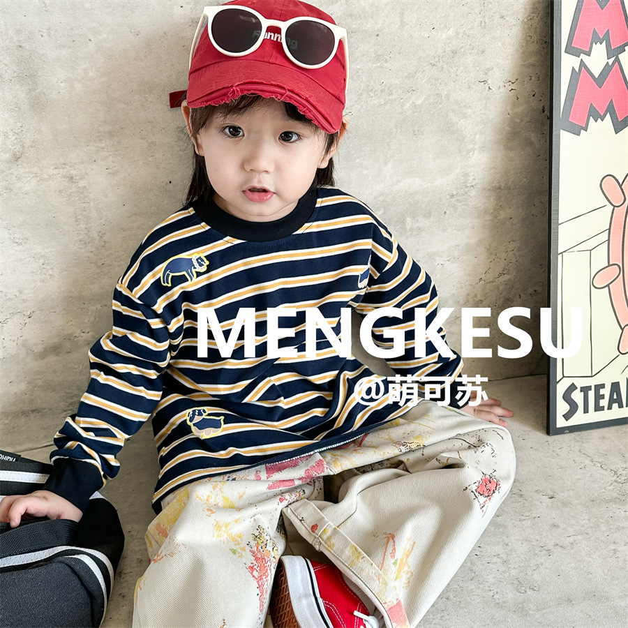 Moe Su 아동복 소년 티셔츠 긴 소매 2024 새로운 아기 줄무늬 만화 최고 어린이 가을베이스 셔츠 트렌디스토어 가기