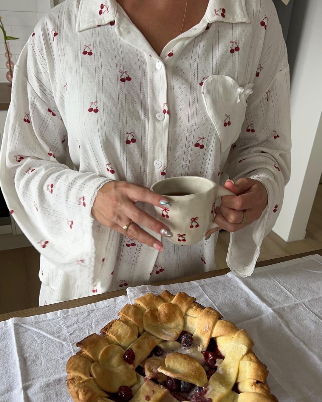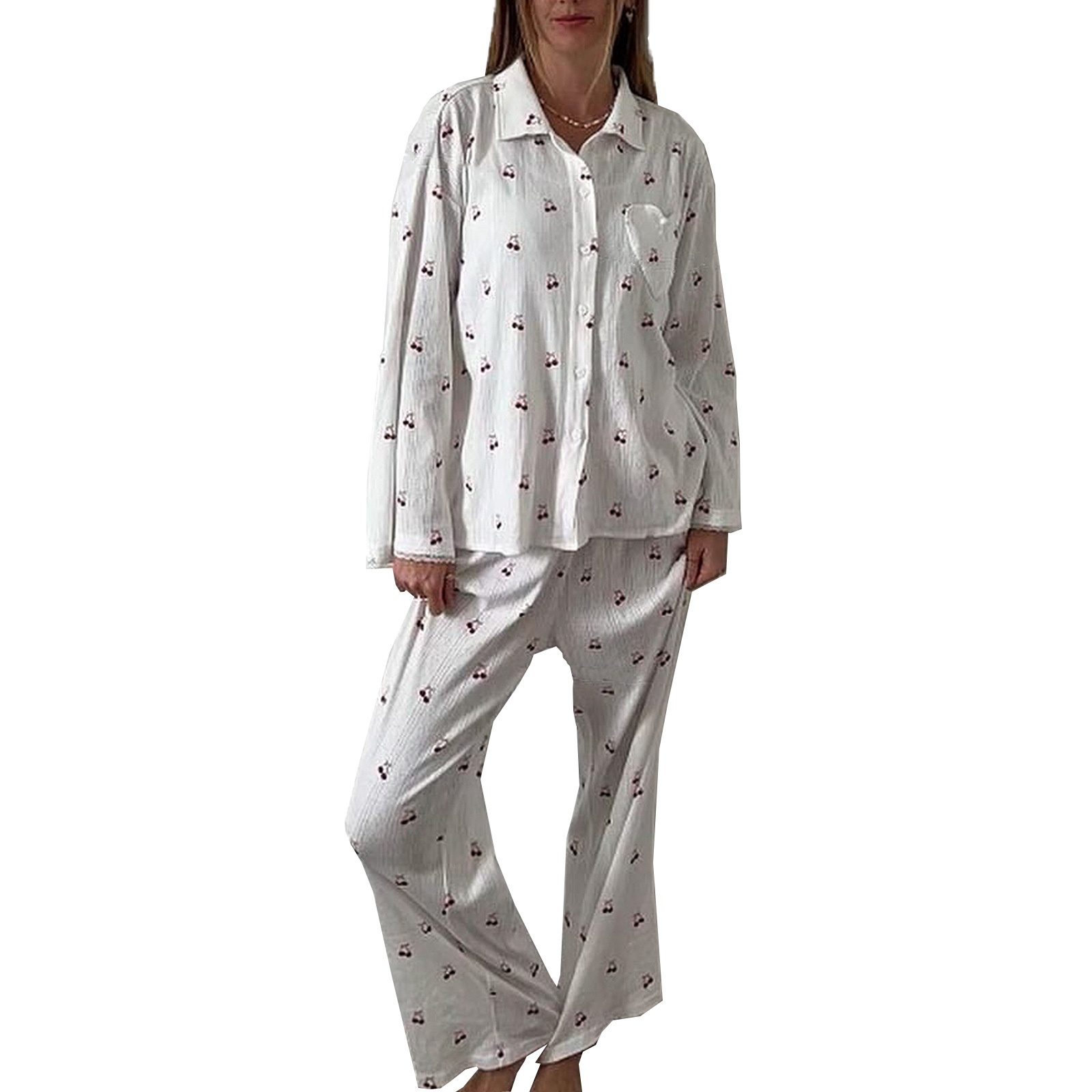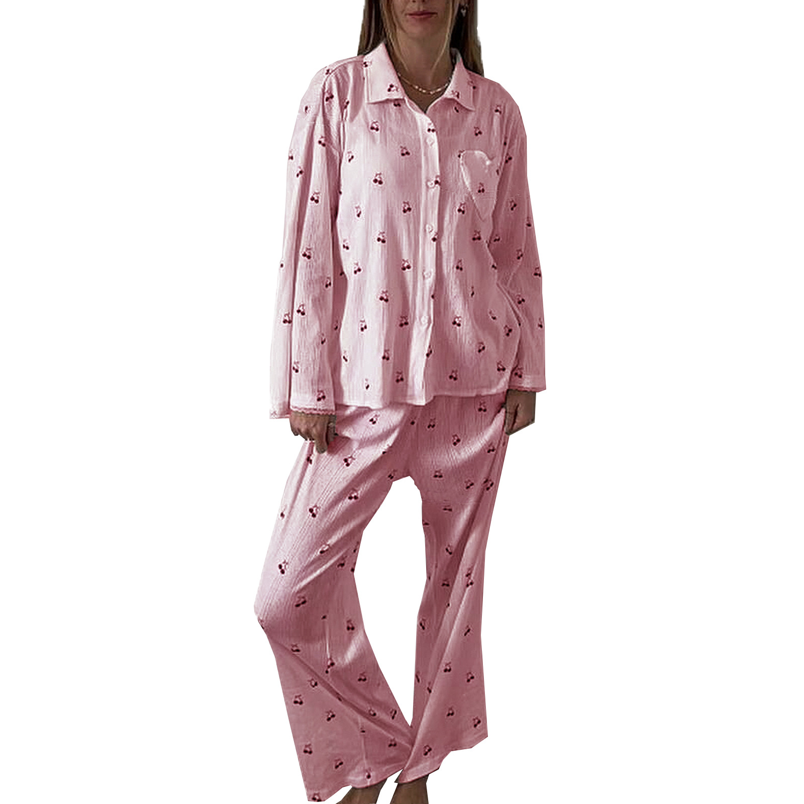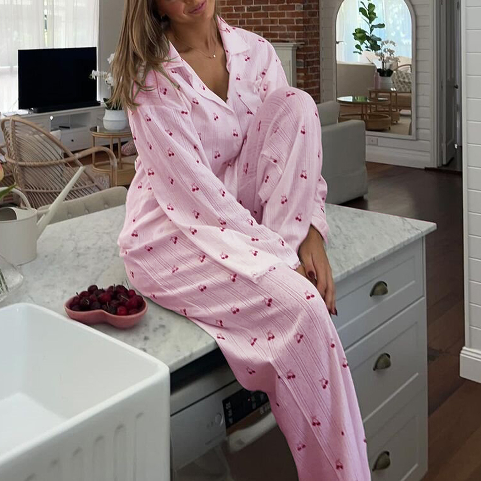 2024 유럽과 미국의 가을 캐주얼 카디건 니트 긴 소매 바지 파자마 여성 체리 인쇄 간단한 홈 옷스토어 가기