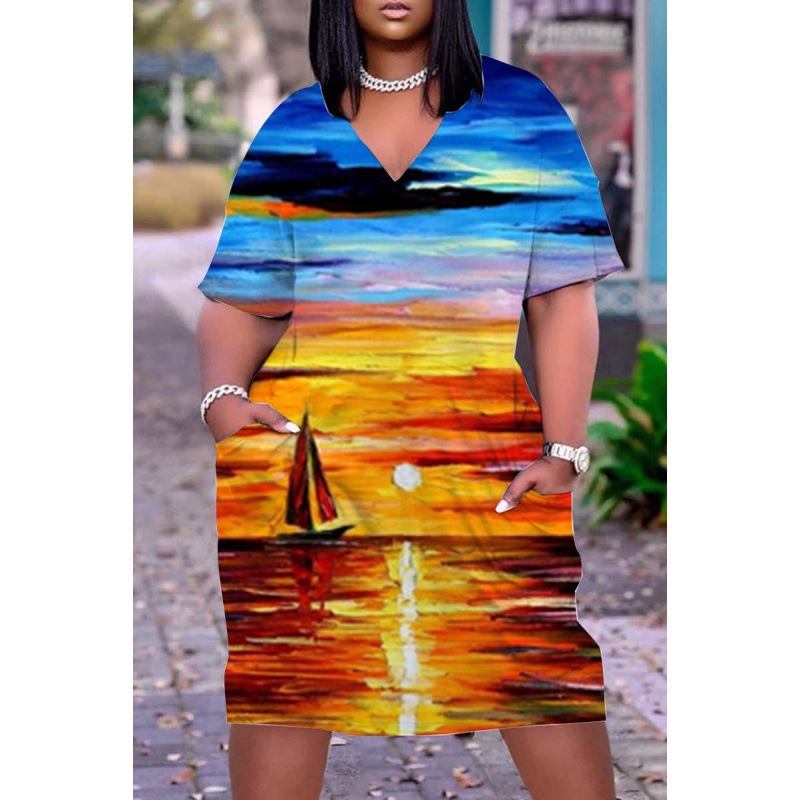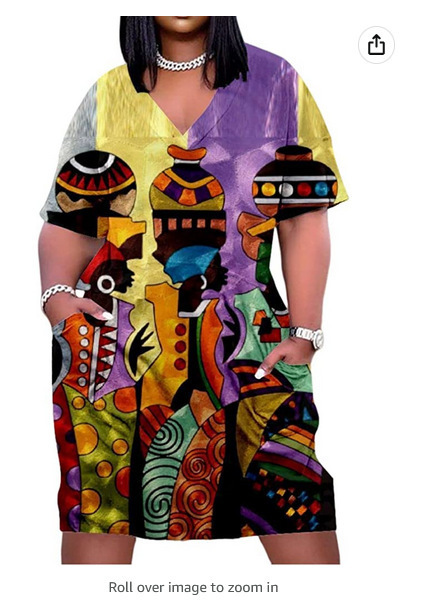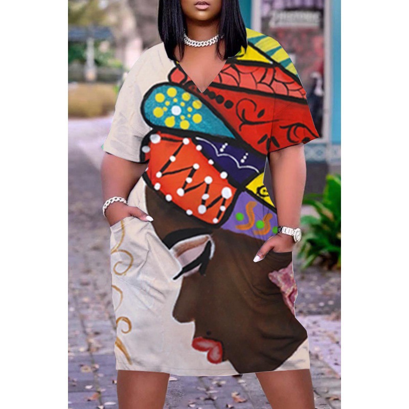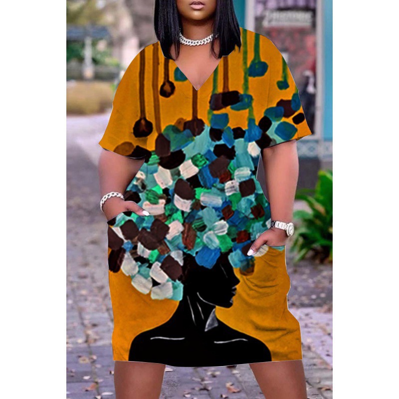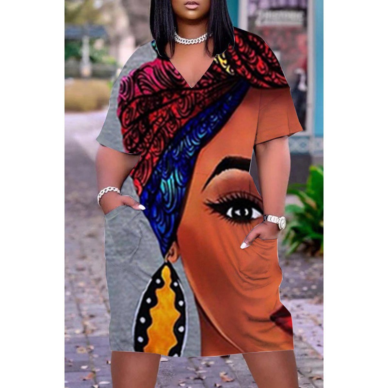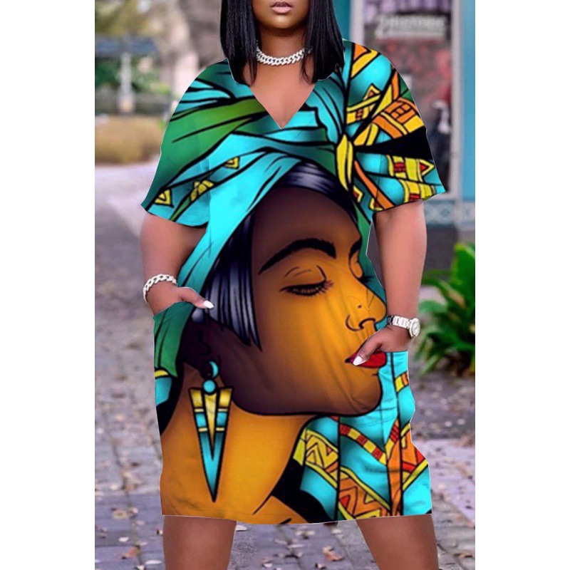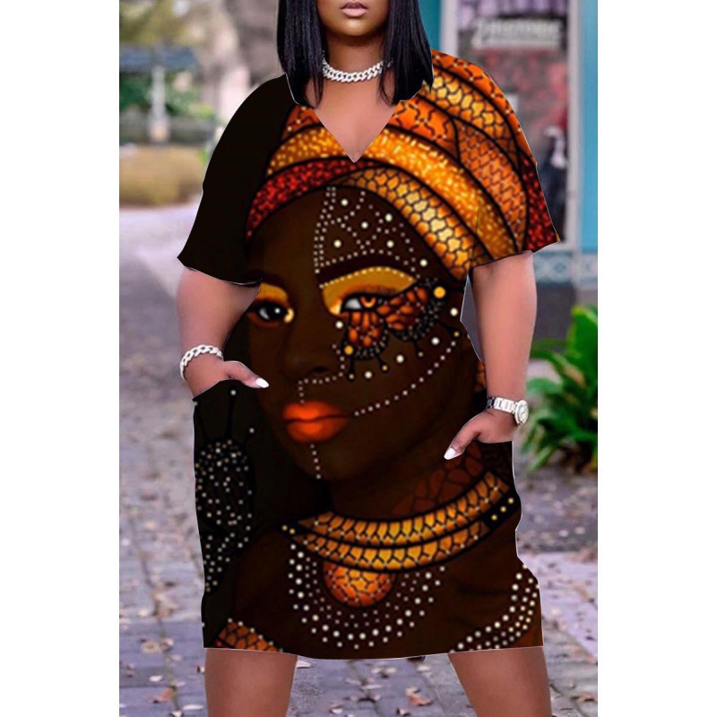 2024 크로스-국경 아프리카 인디언 블랙 3D 디지털 인쇄 원피스 플러스 사이즈 느슨한 중간 길이 V-목 원피스스토어 가기