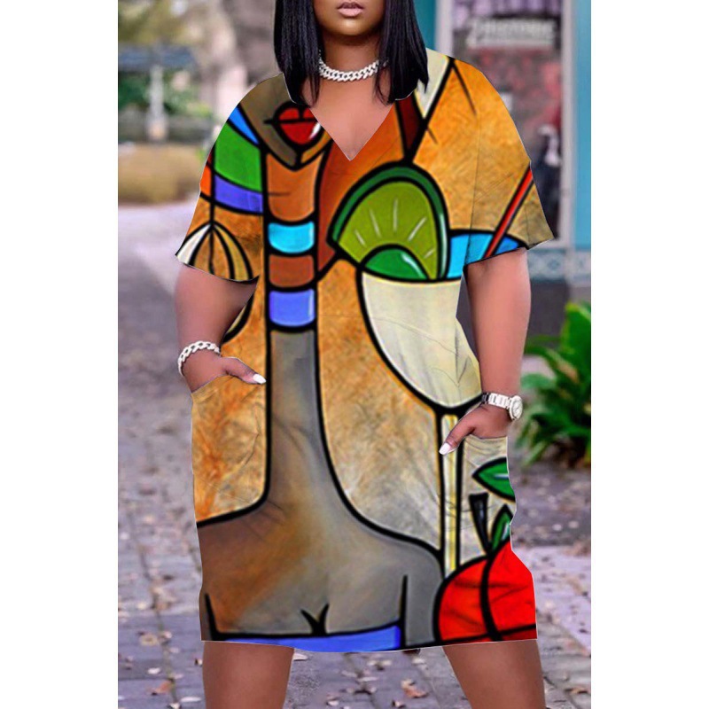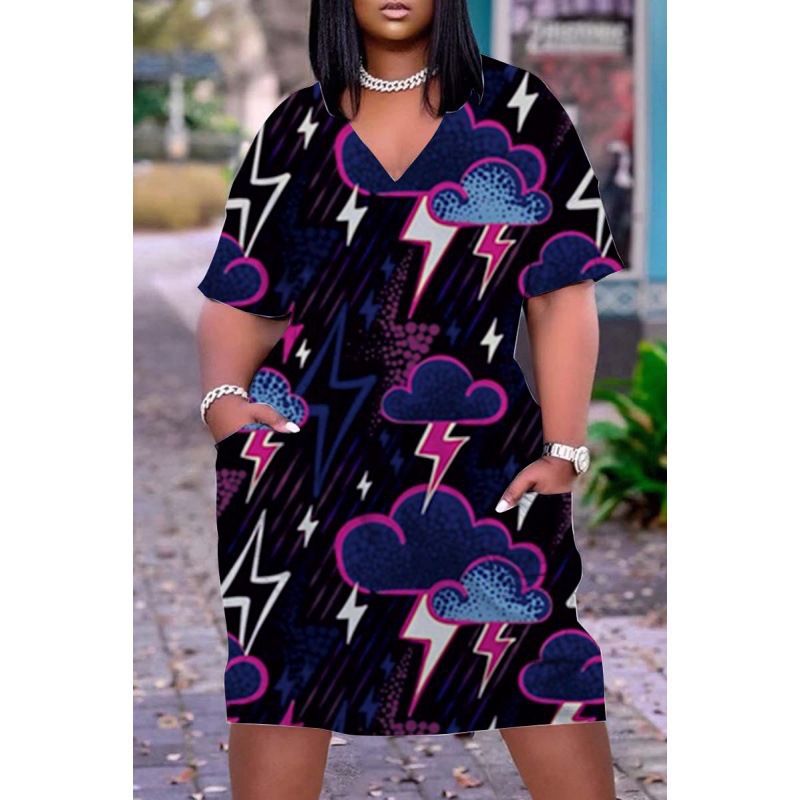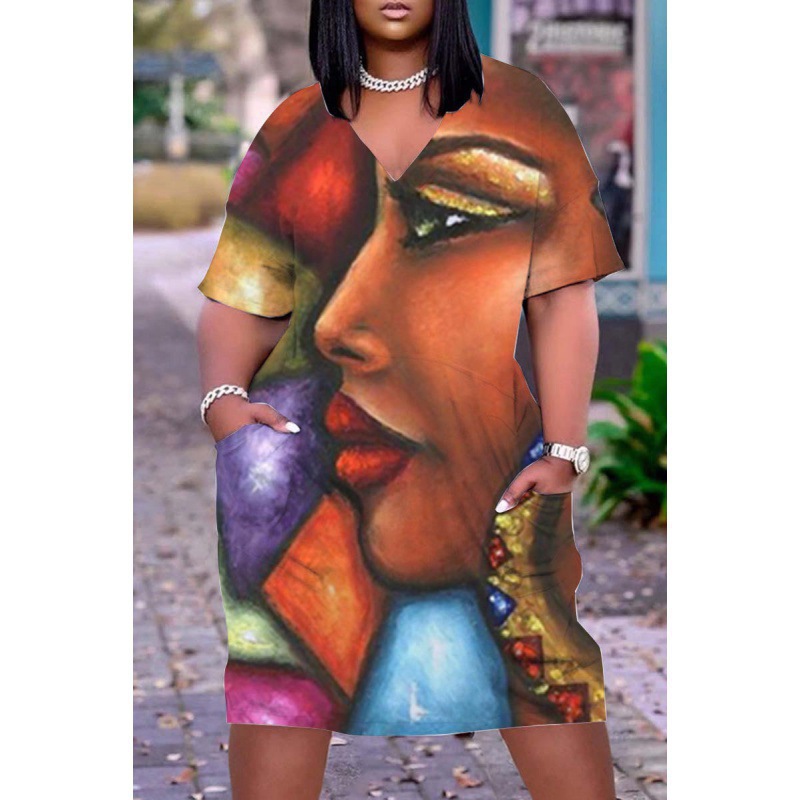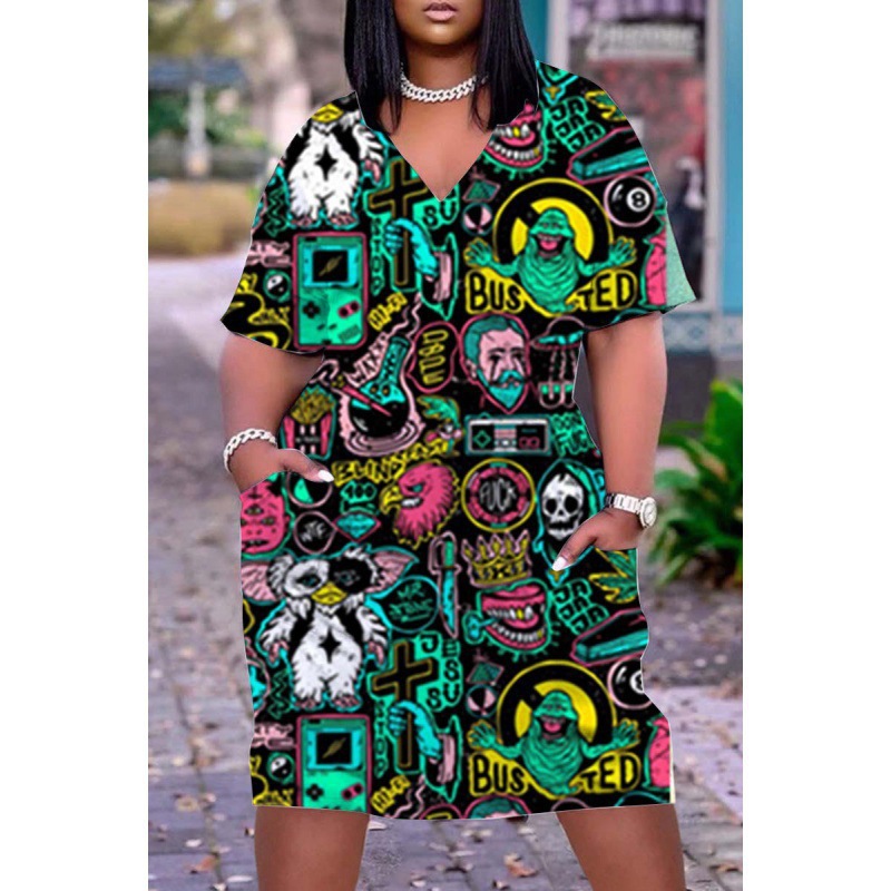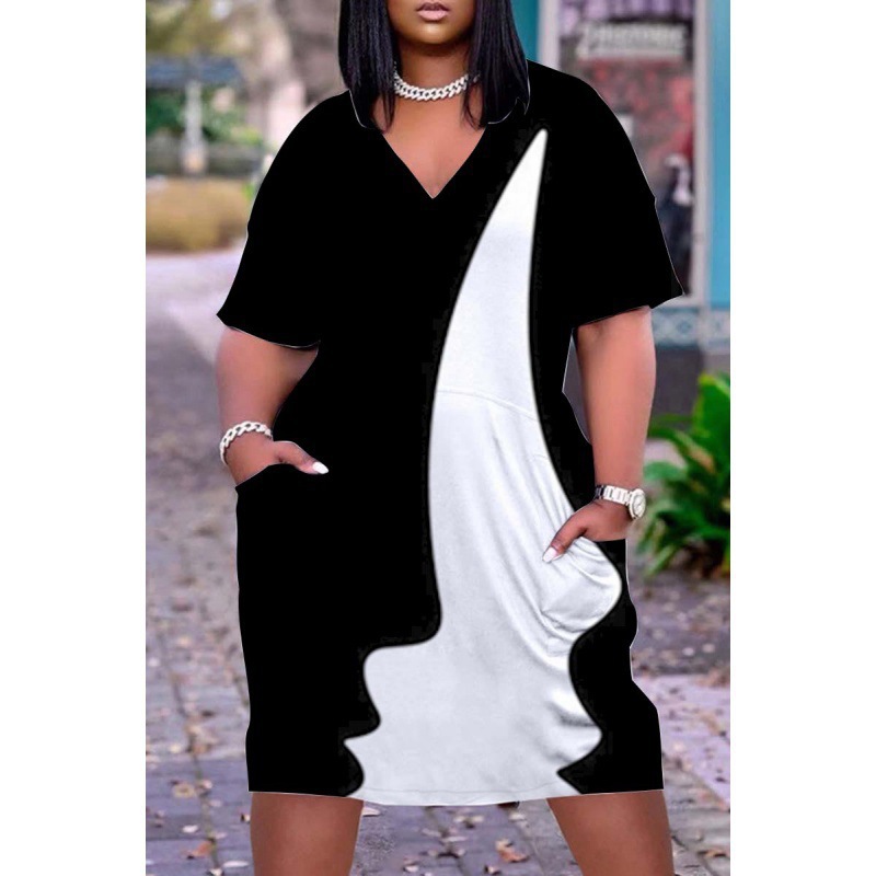 2024 크로스-국경 아프리카 인디언 블랙 3D 디지털 인쇄 원피스 플러스 사이즈 느슨한 중간 길이 V-목 원피스