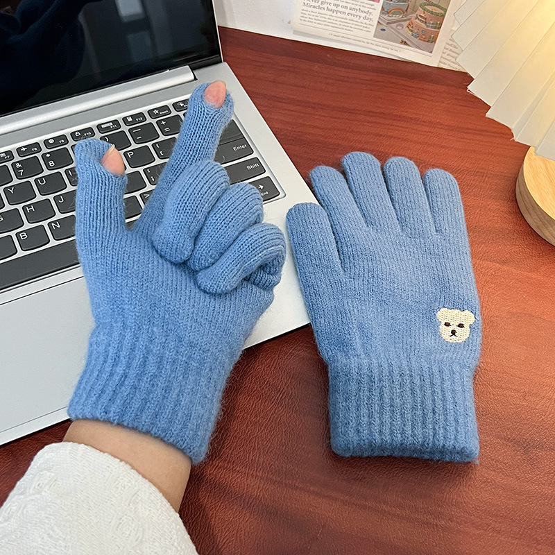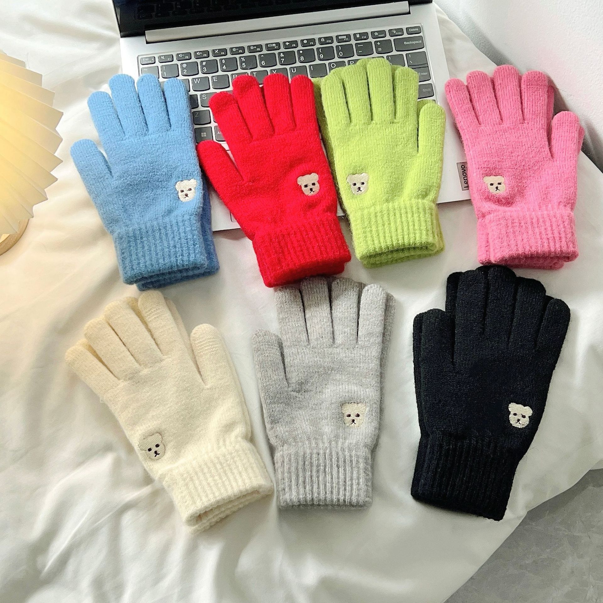한국 새로운 가을과 겨울 귀여운 곰 자수 양모 니트 손가락 5-손가락 장갑 터치 스크린 오픈 손가락 여성 솔리드스토어 가기