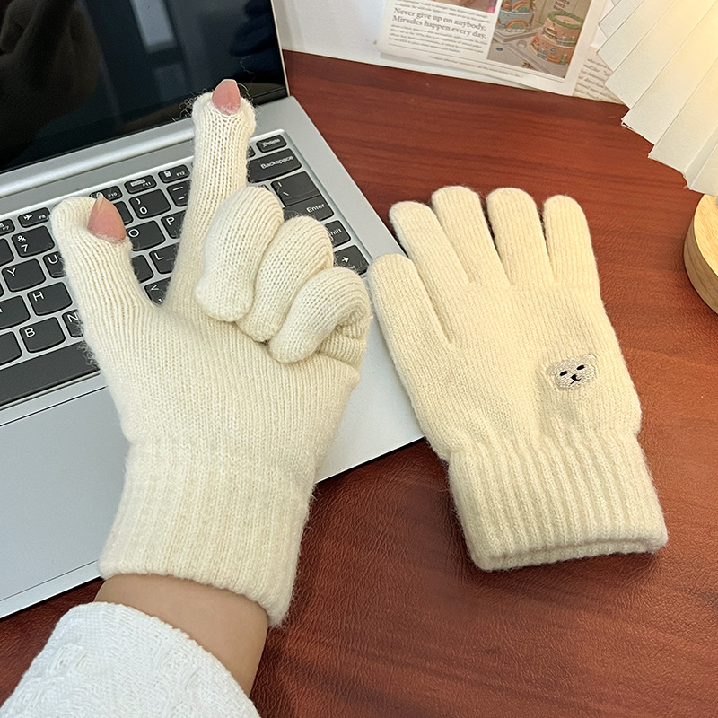 한국 새로운 가을과 겨울 귀여운 곰 자수 양모 니트 손가락 5-손가락 장갑 터치 스크린 오픈 손가락 여성 솔리드