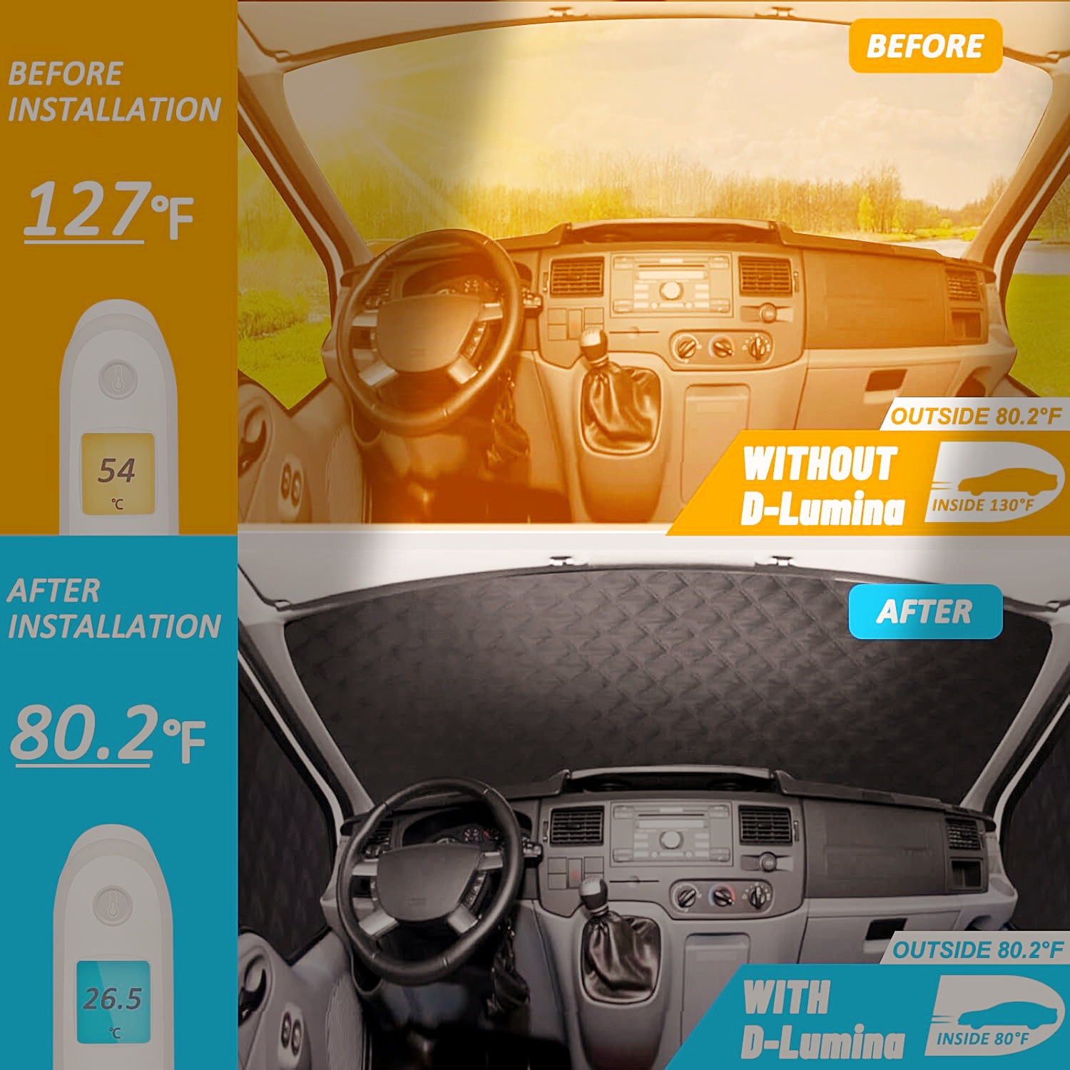 【四季保护】:能承受阳光和高温,既能通过挡风玻璃减少热量,又保护隐私。 有效降低车内温度,阻挡高达 95% 的有害紫外线,隔离阳光,保持车内温度,保持凉爽。 我们的房车车窗罩防水,可保护您的房车免受雪、冰、霜冻、灰尘、雨水、污垢和阳光的伤害。