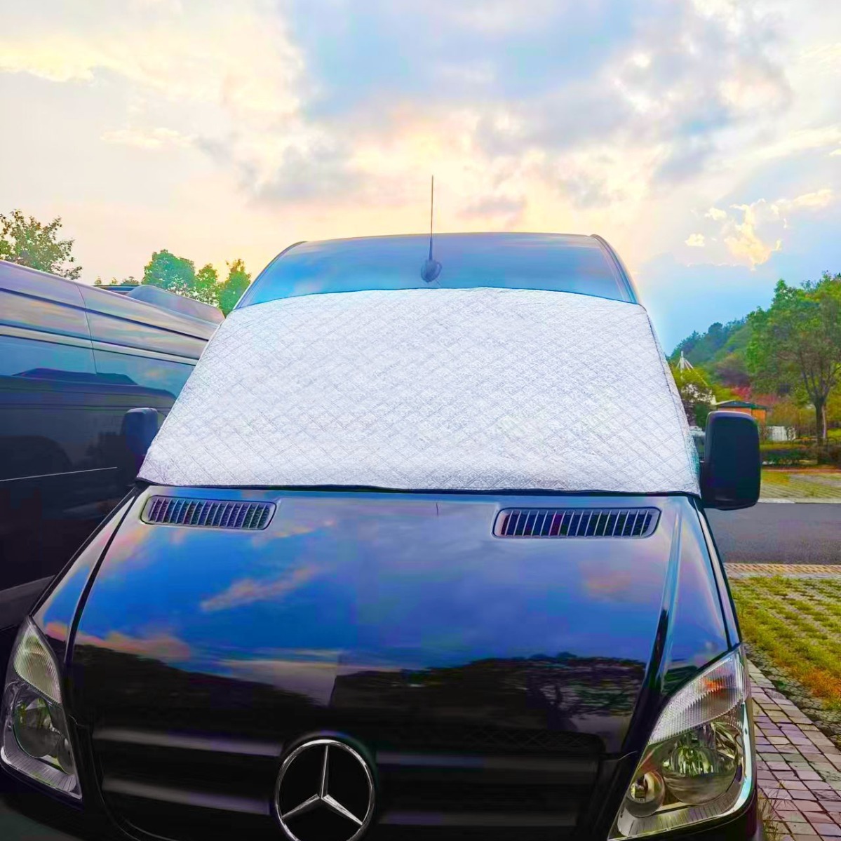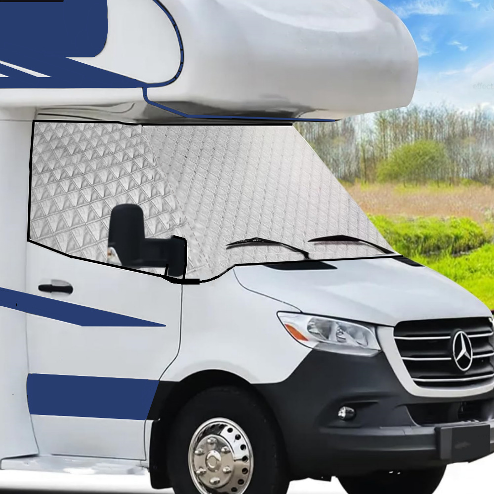 【定制房车挡风玻璃罩】:适用于 B 类 Merce-des Benz Sprinter 凌特2007-2013款房车的前 RV 挡风罩。 定制车窗罩可覆盖所有前挡风玻璃和侧窗,在房车内放松或将房车停在外面时,保护您的内部隐私。