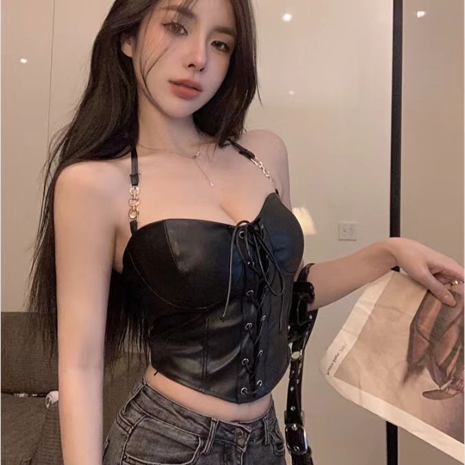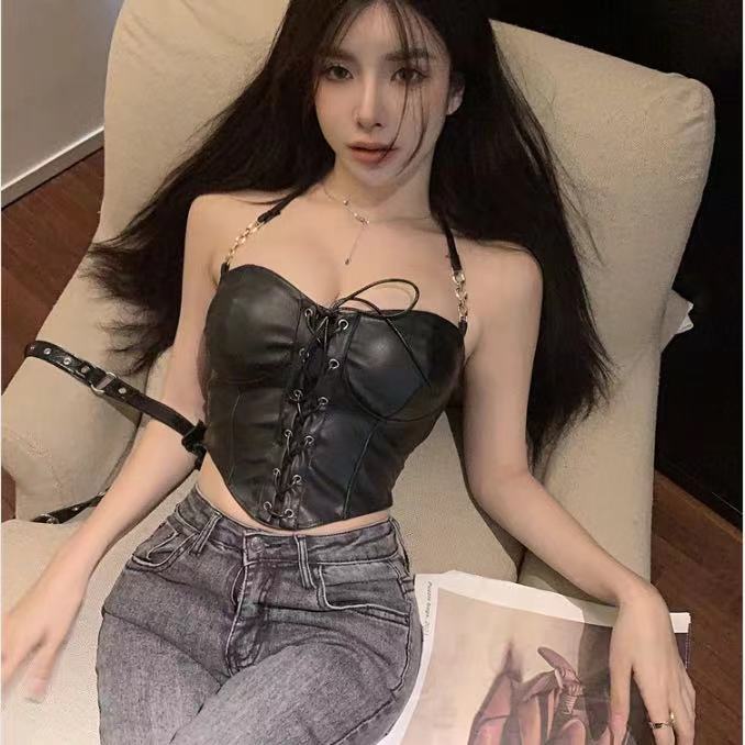 검은 PU 가죽 벨트 허리 튜브 상단 교수형 목베이스 셔츠 Halter Vest 여성용 외부 착용 스파이스 소녀 섹시한 내부 탑스토어 가기