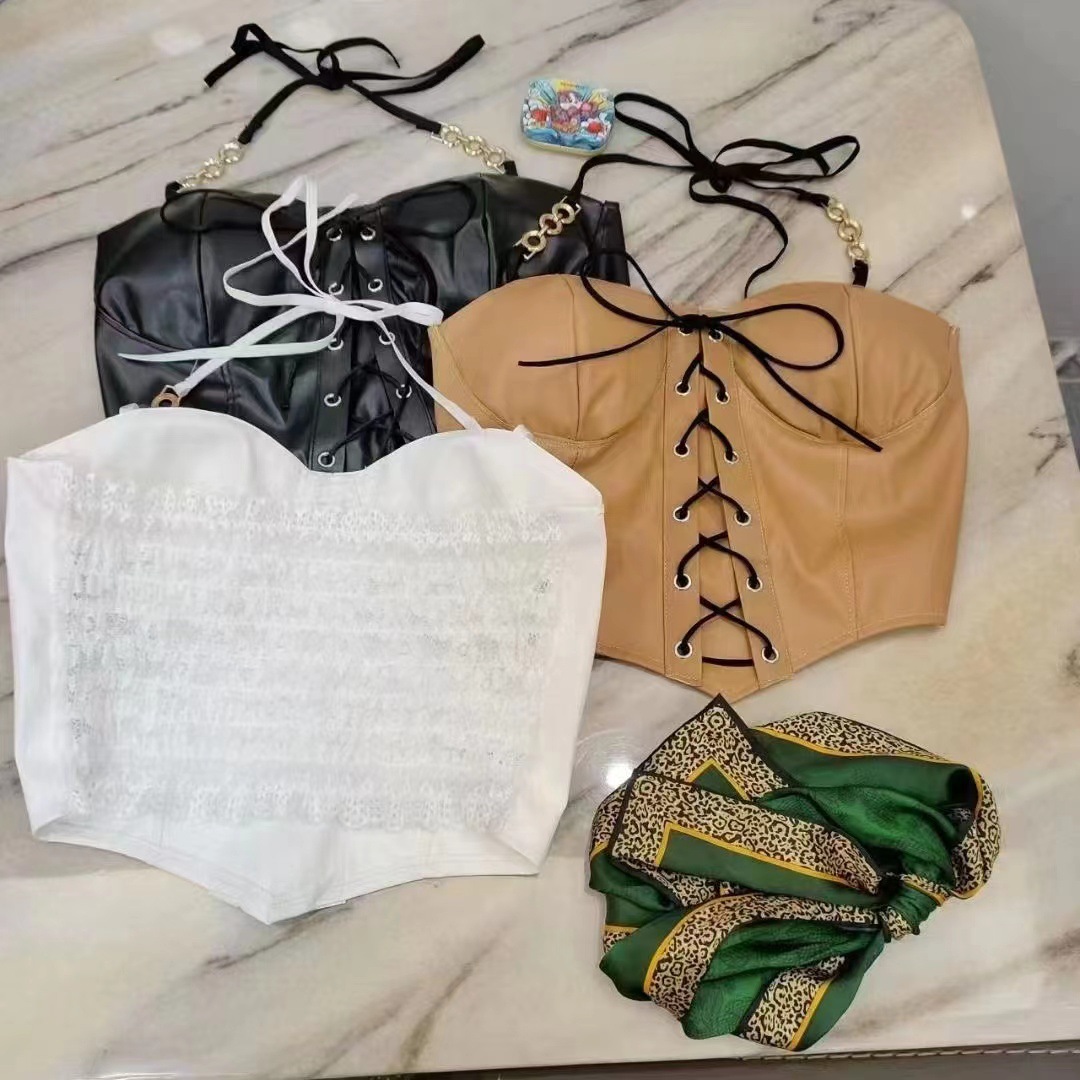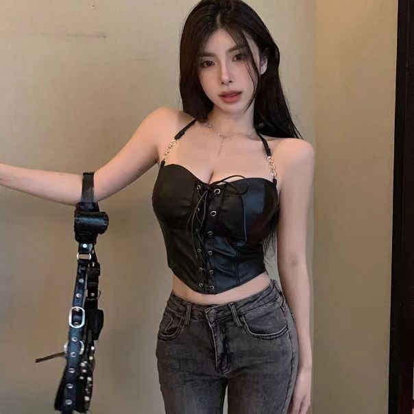 검은 PU 가죽 벨트 허리 튜브 상단 교수형 목베이스 셔츠 Halter Vest 여성용 외부 착용 스파이스 소녀 섹시한 내부 탑