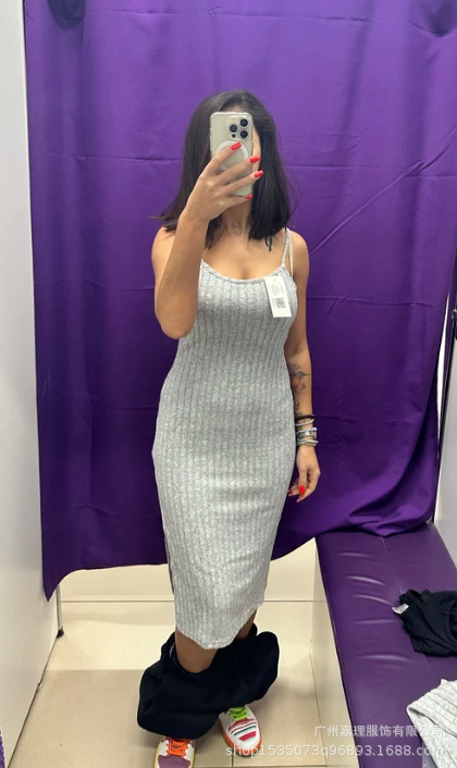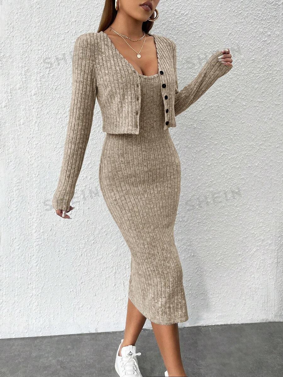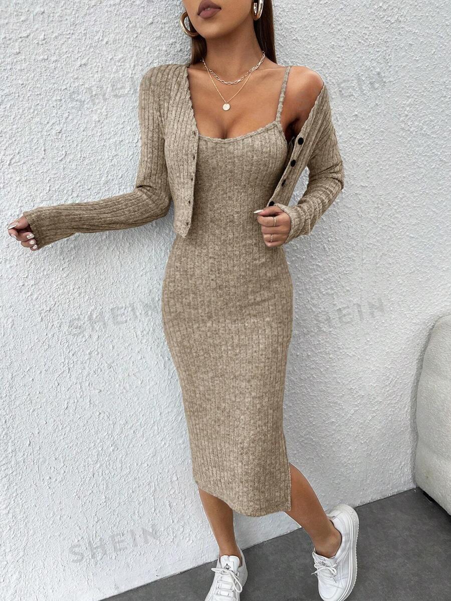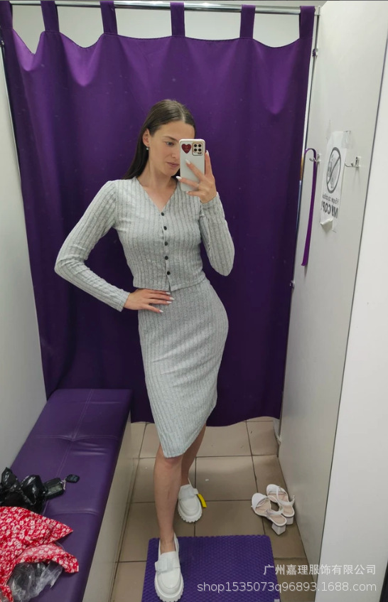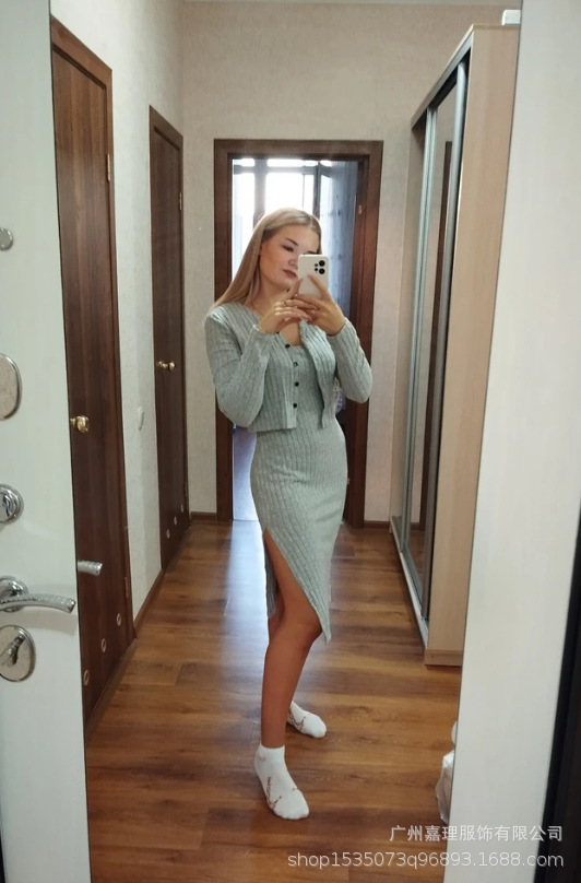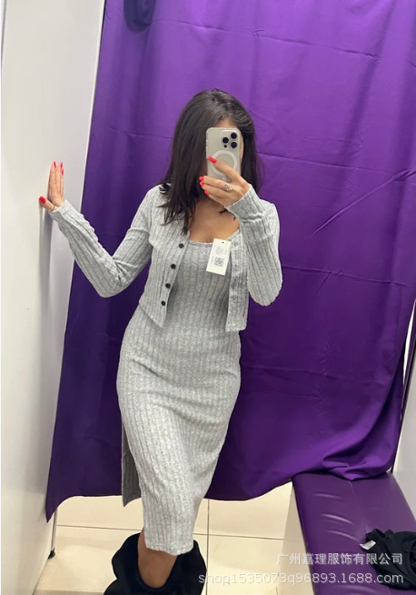 2024 년 가을/겨울 유럽과 미국 아마존 국경 간 여성 슬림 슬링 원피스 핏 스트립 카디건 자켓 여성용 투피스 세트스토어 가기