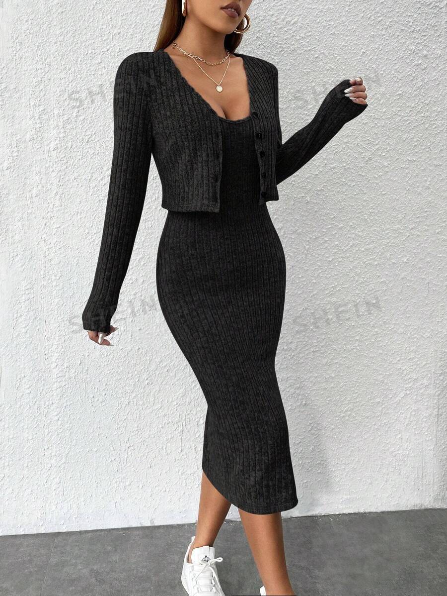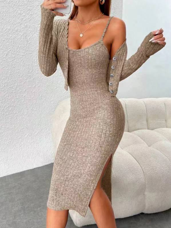 2024 년 가을/겨울 유럽과 미국 아마존 국경 간 여성 슬림 슬링 원피스 핏 스트립 카디건 자켓 여성용 투피스 세트