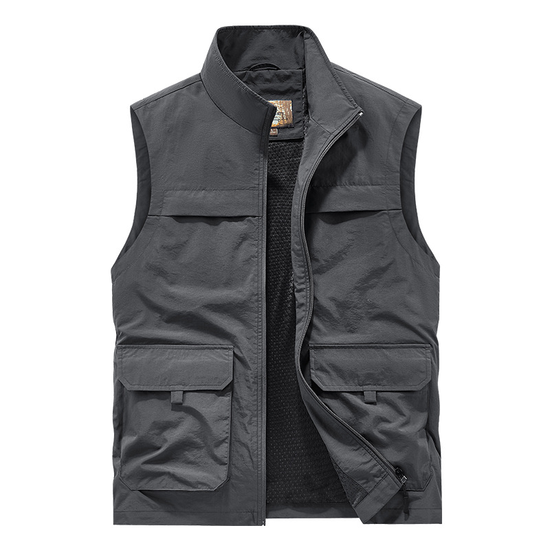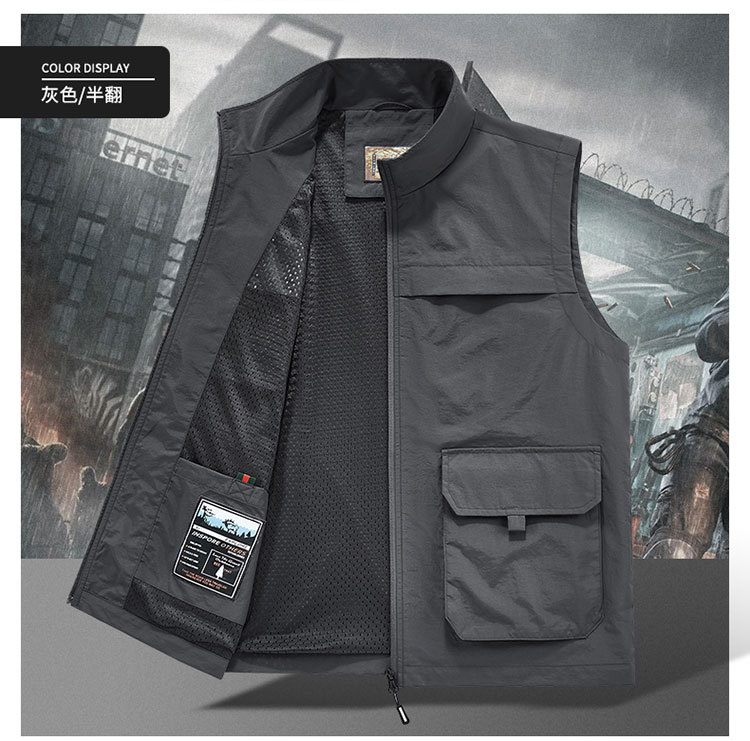 사계절 낚시 남자 조끼 메시 통기성 민소매 스탠드 칼라 멀티 포켓 빠른 건조 조끼 국경 플러스 사이즈 Waistcoat
