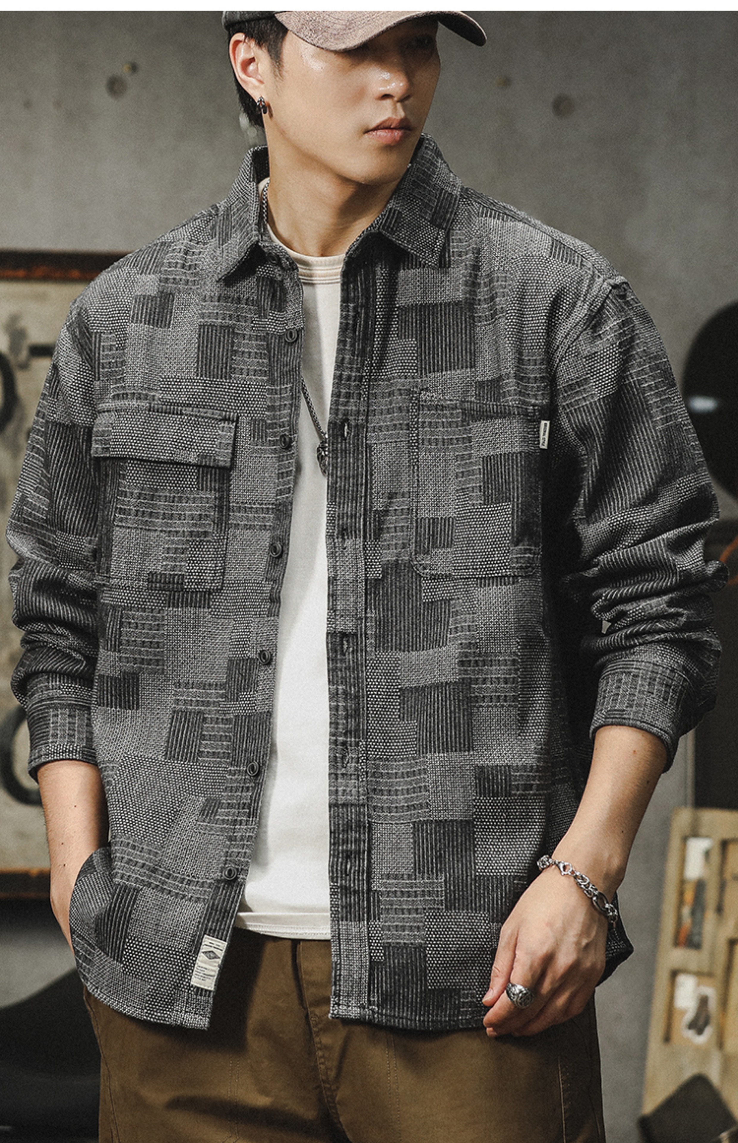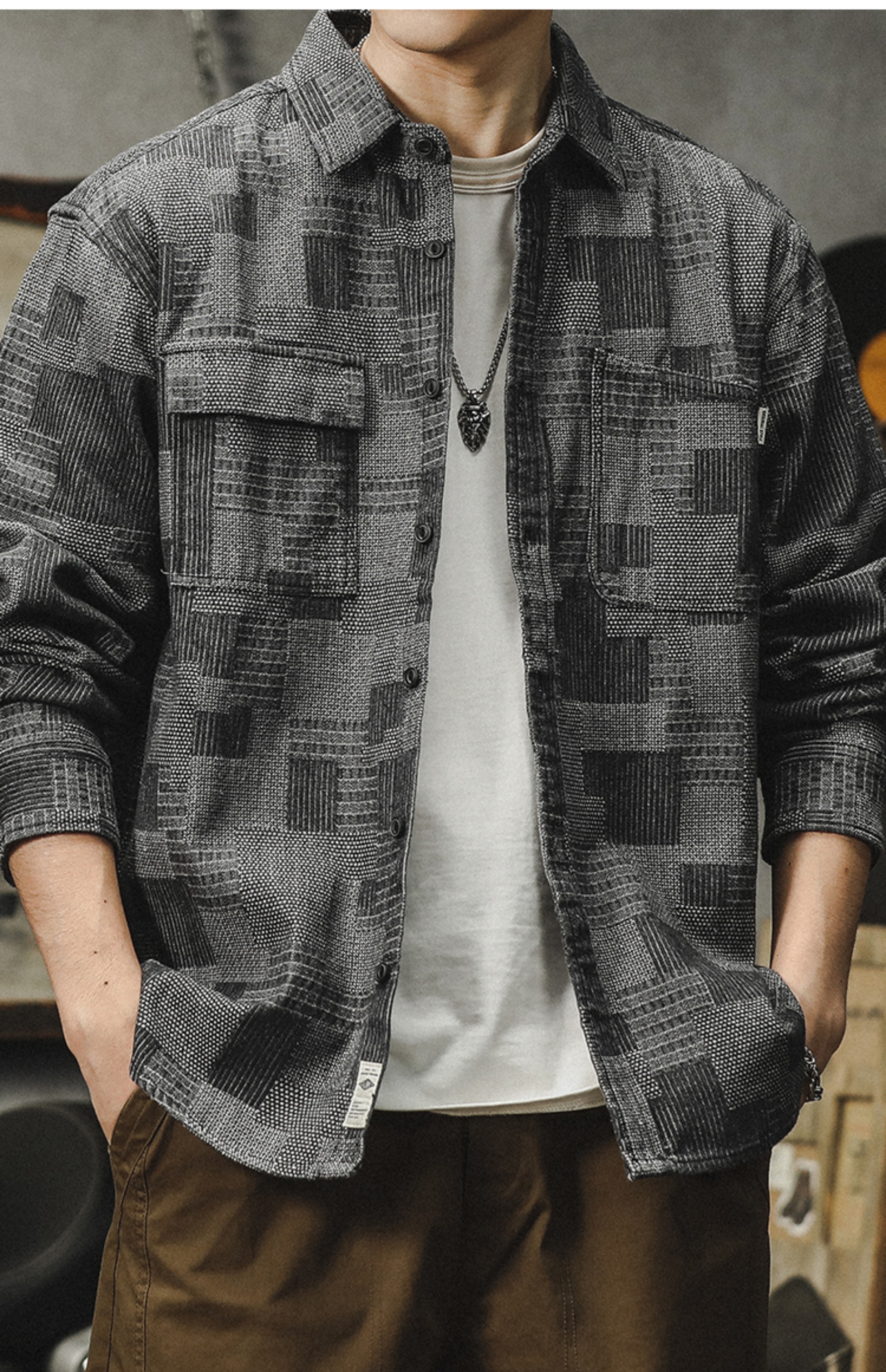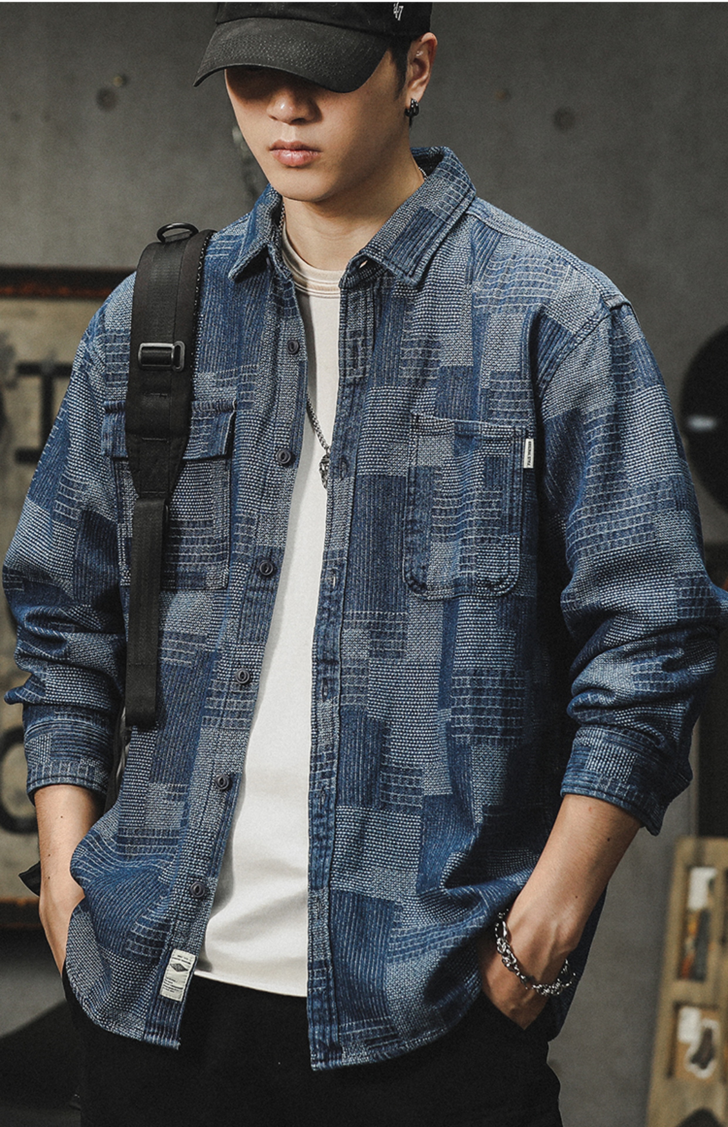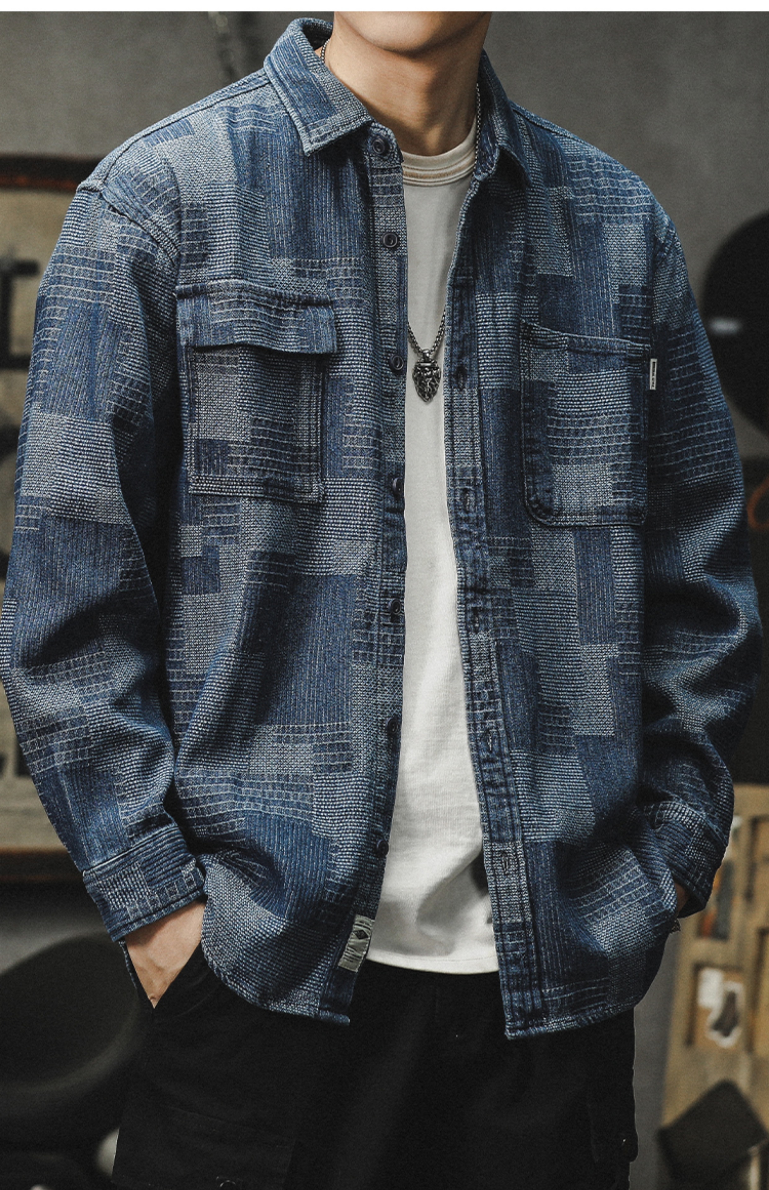 격자 무늬 데님 셔츠 남자의 긴 소매 봄 및 가을 새로운 느슨한 미국 스타일 유행 브랜드 캐주얼 트렌디 핸즈름 작업복 셔츠 재킷스토어 가기