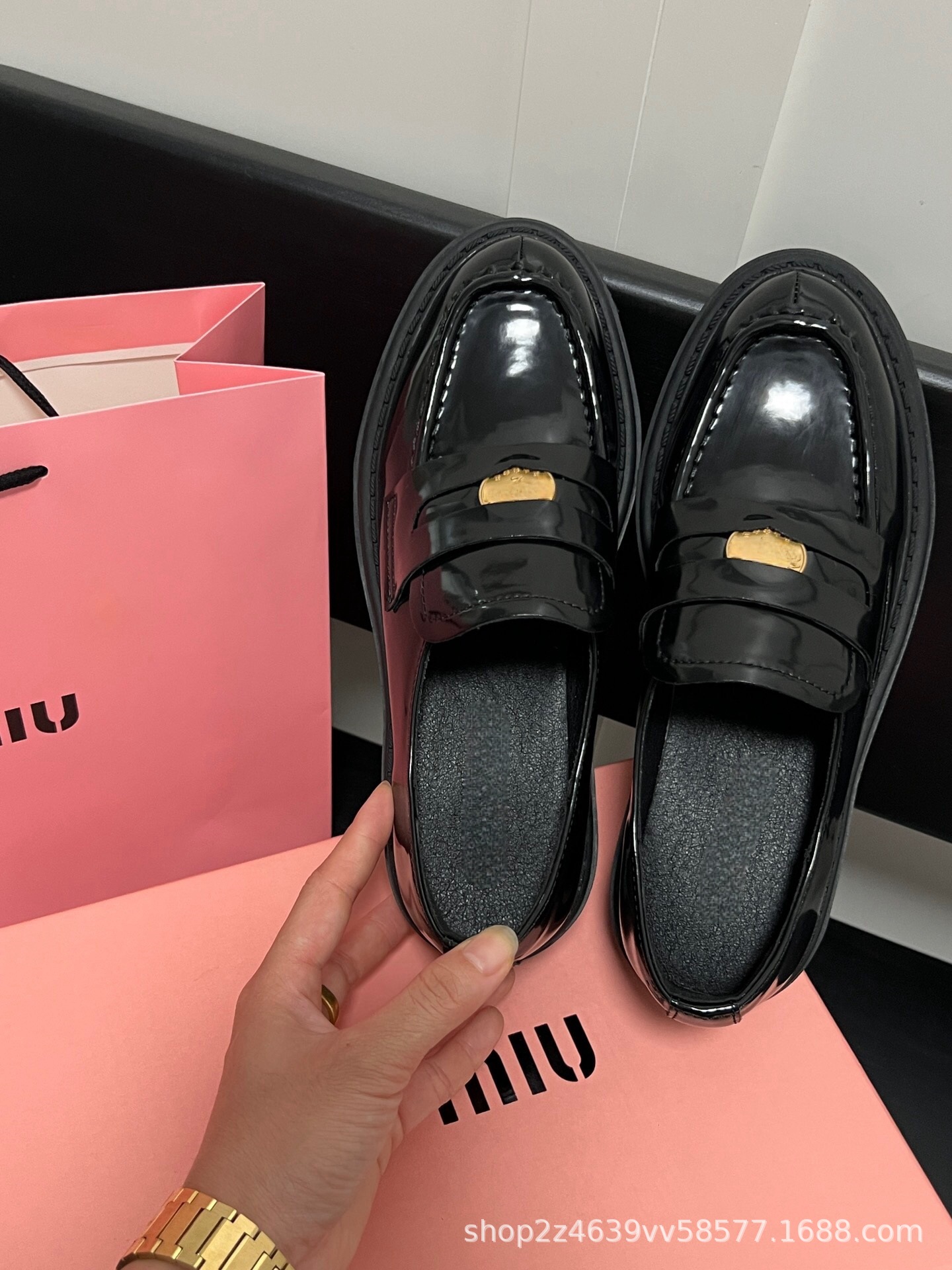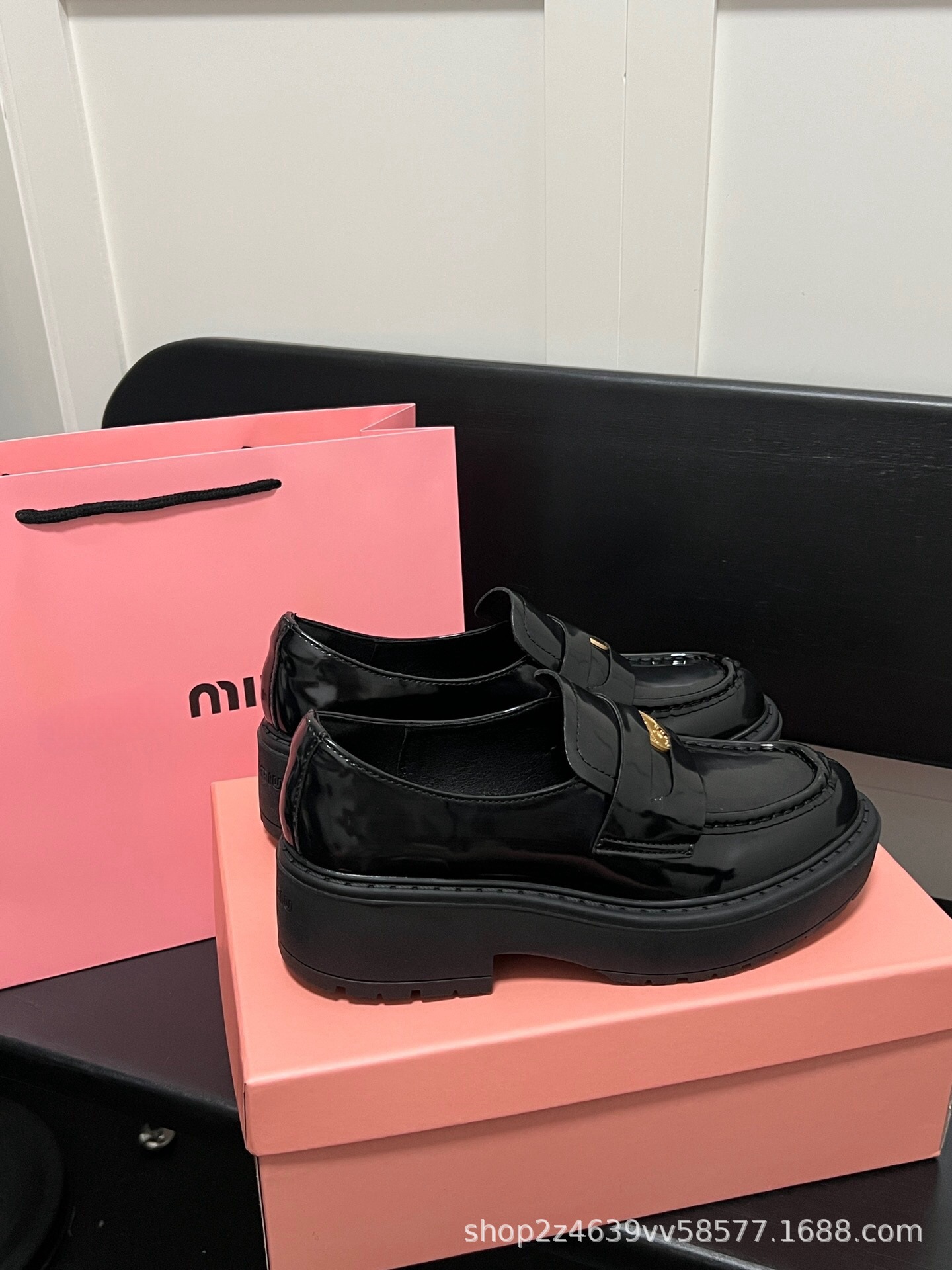 미우 여성용 두꺼운 밑창 작은 가죽 신발, 복고풍 금화 슬립온 로퍼, 높이가 증가된 영국식 두꺼운 굽 신발