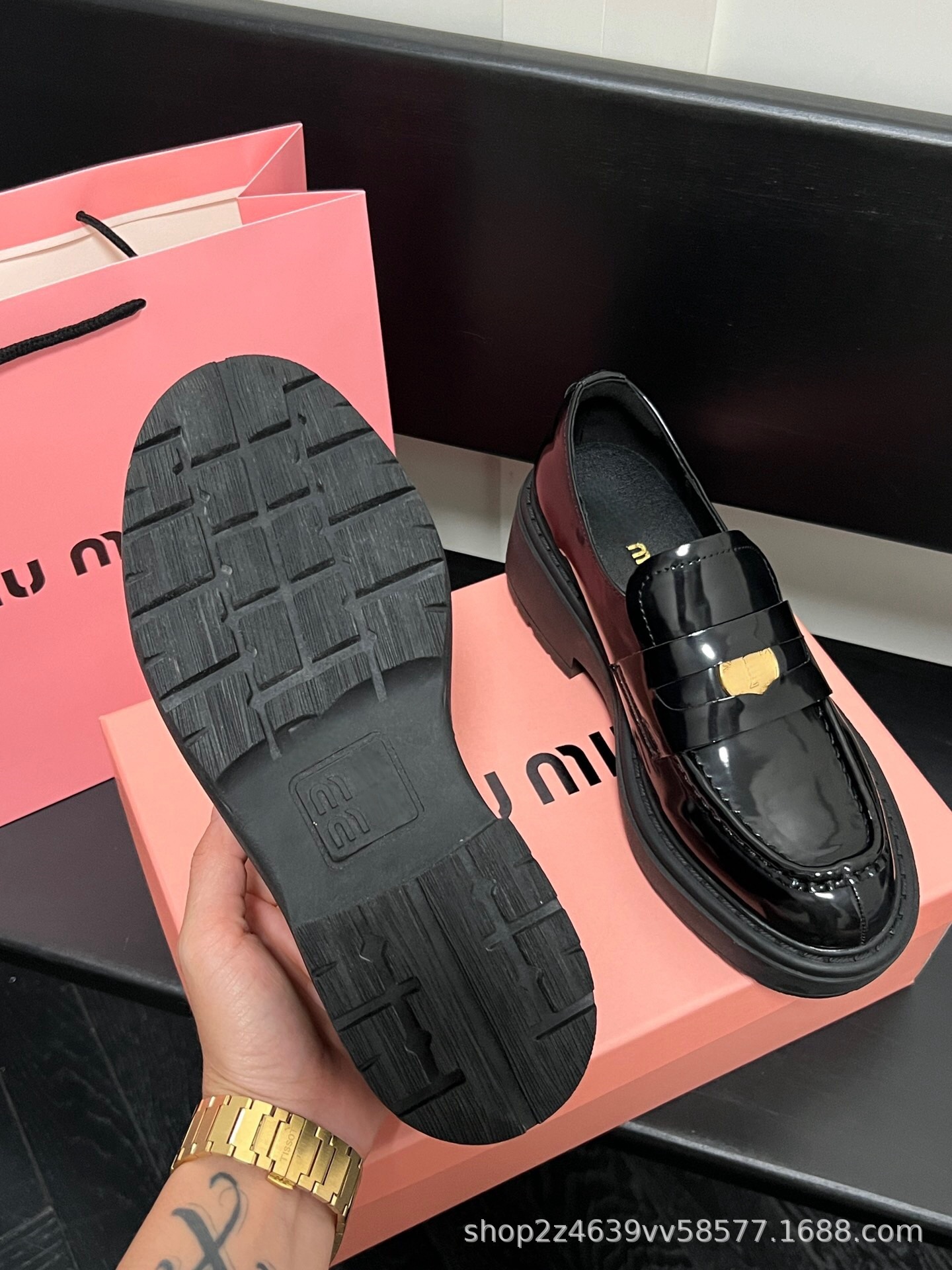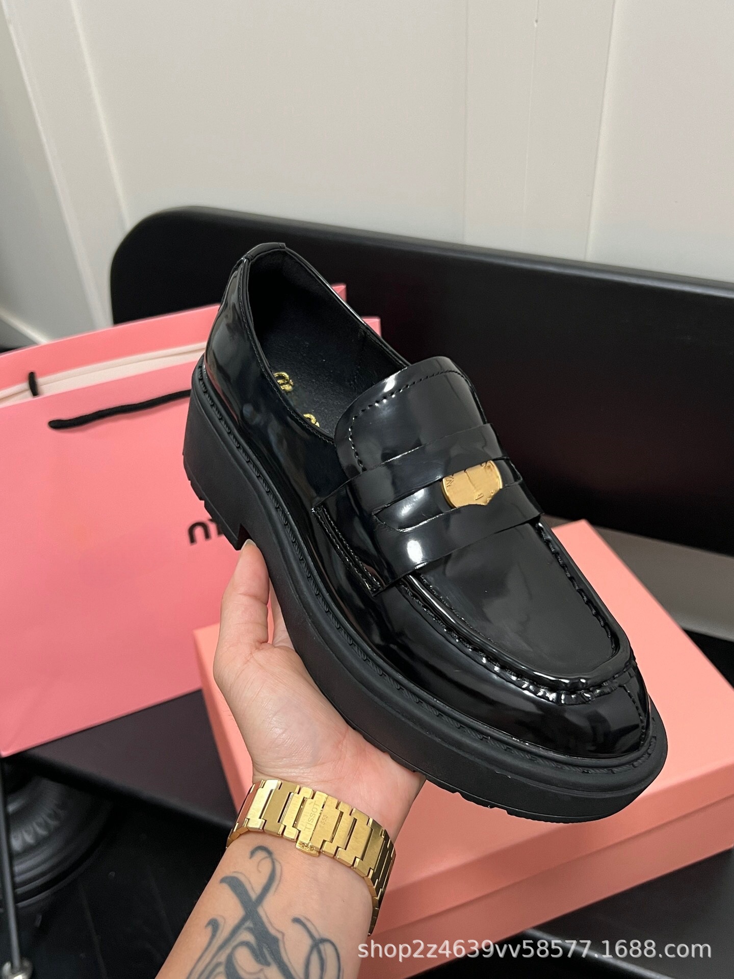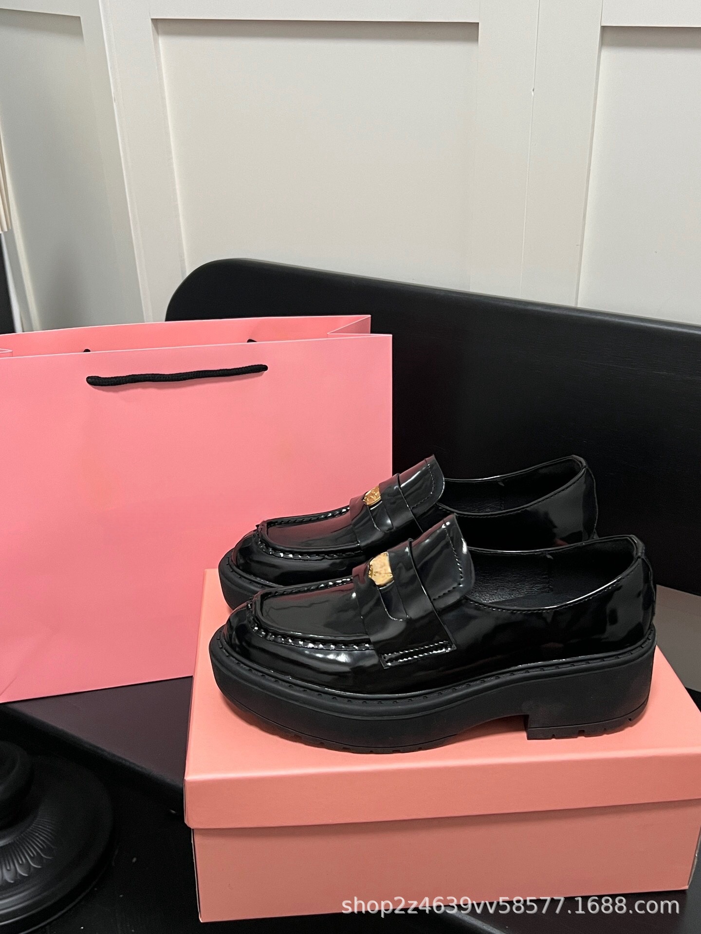 미우 여성용 두꺼운 밑창 작은 가죽 신발, 복고풍 금화 슬립온 로퍼, 높이가 증가된 영국식 두꺼운 굽 신발스토어 가기