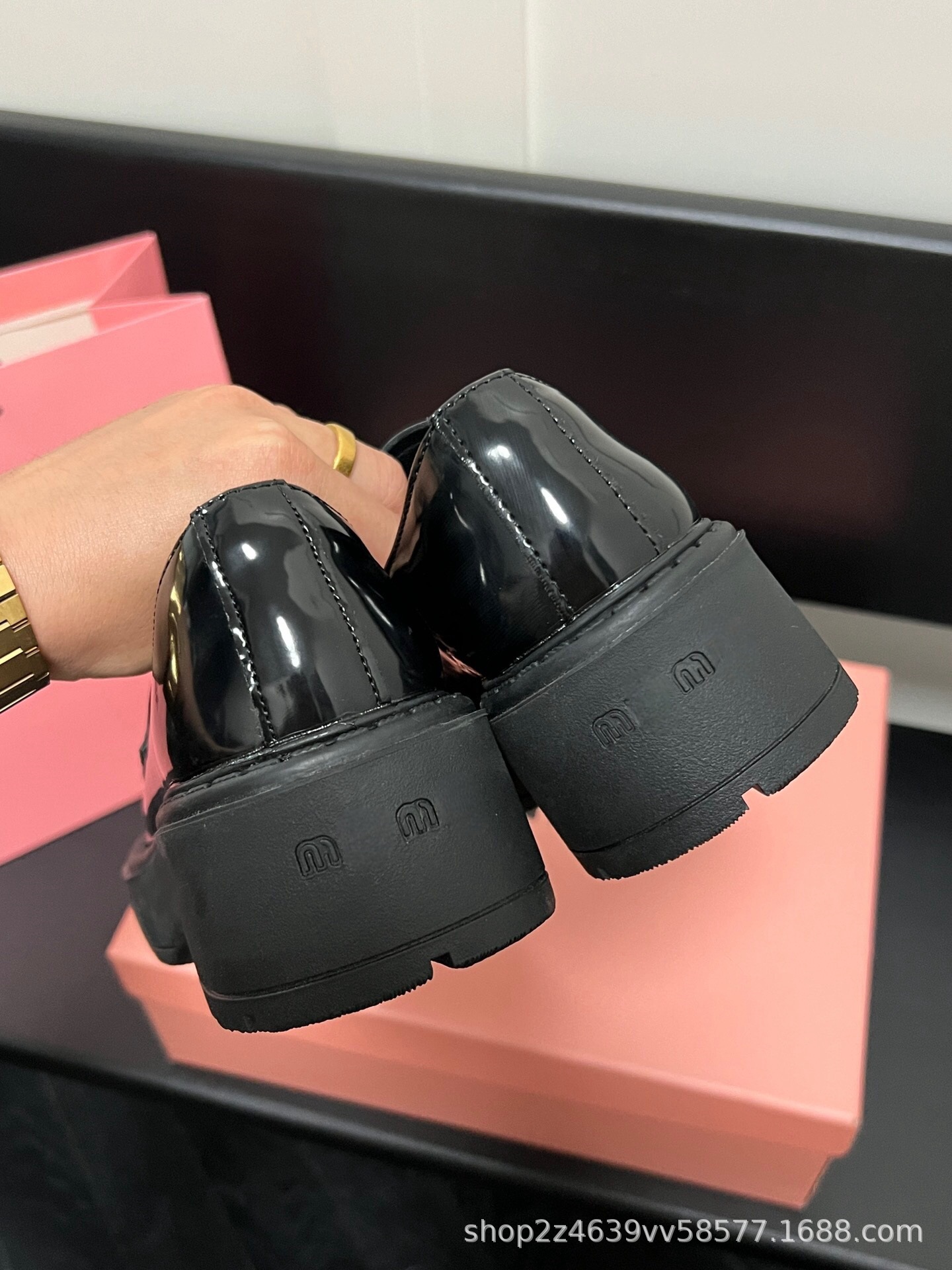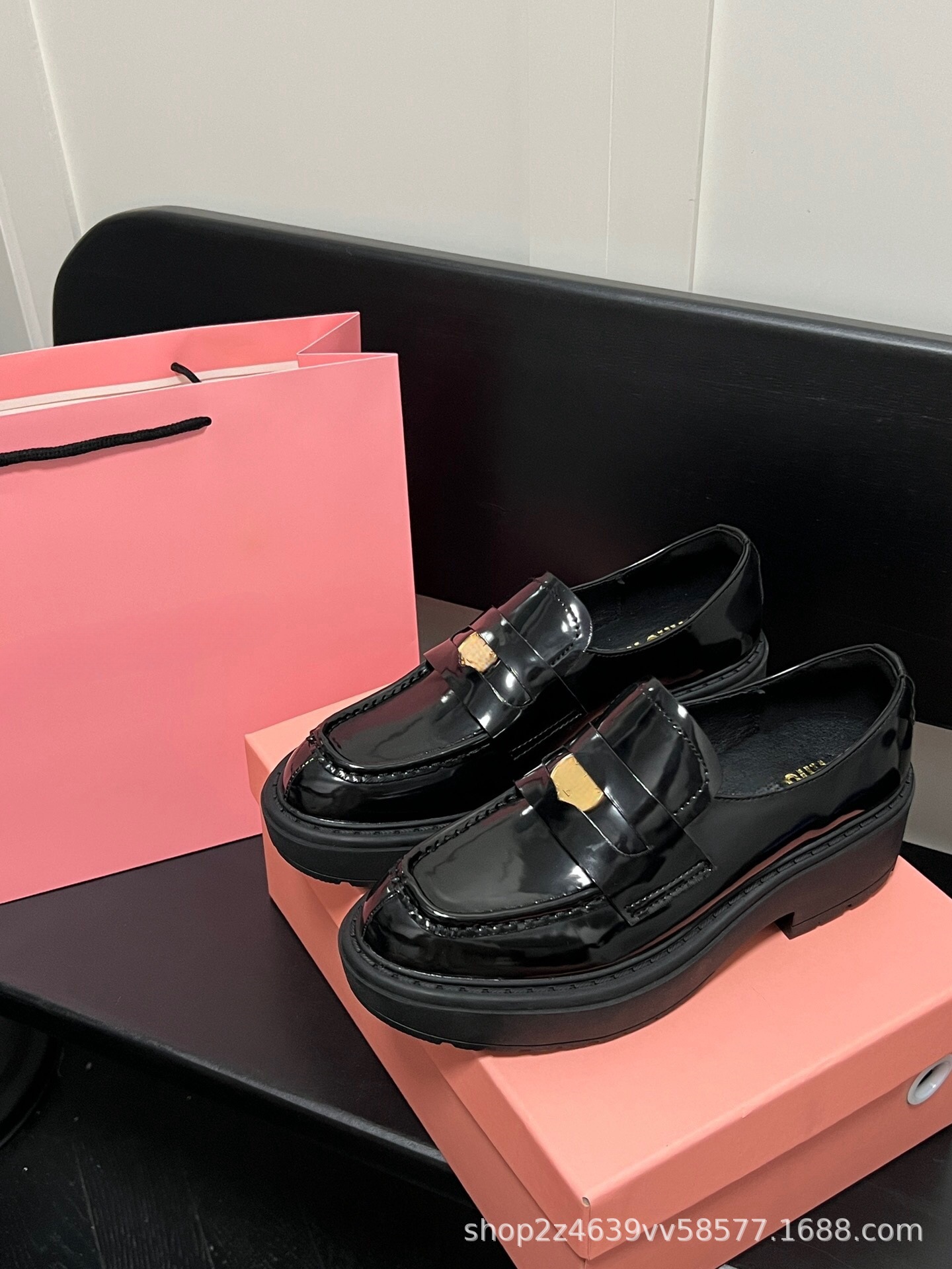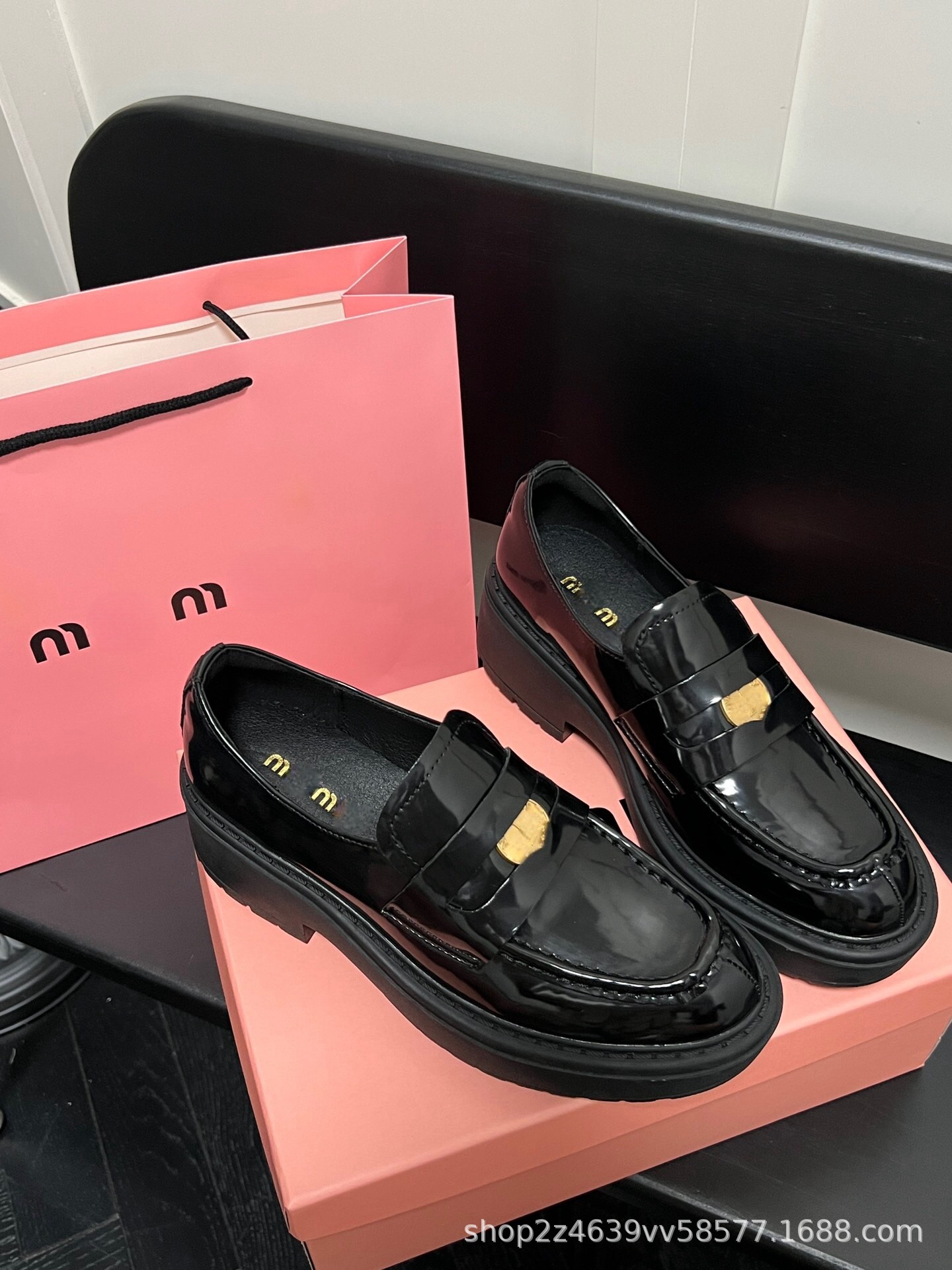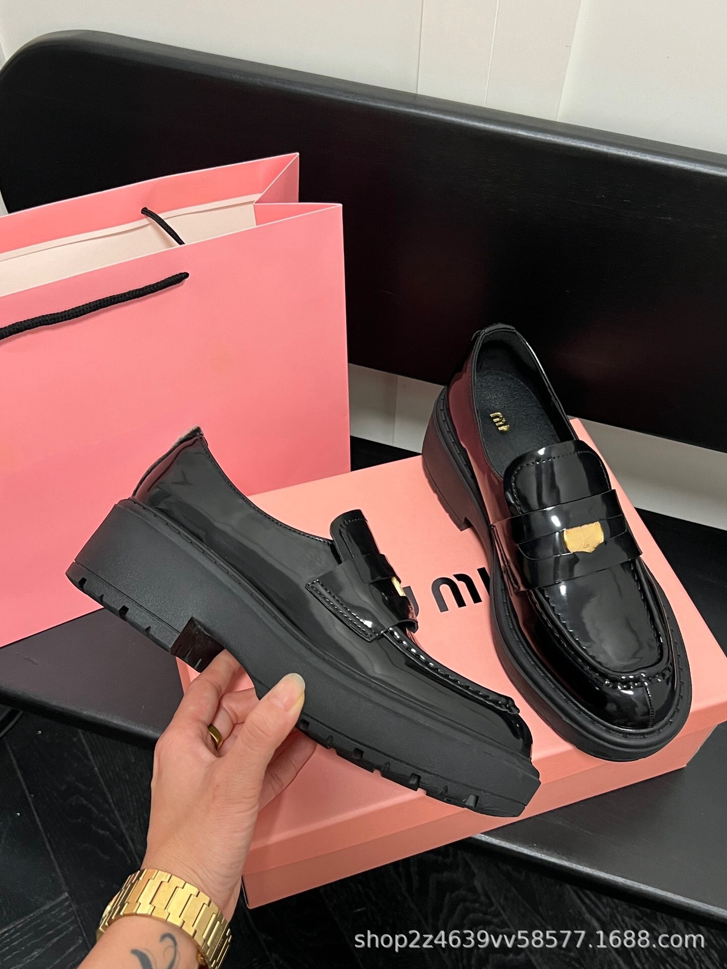 미우 여성용 두꺼운 밑창 작은 가죽 신발, 복고풍 금화 슬립온 로퍼, 높이가 증가된 영국식 두꺼운 굽 신발스토어 가기