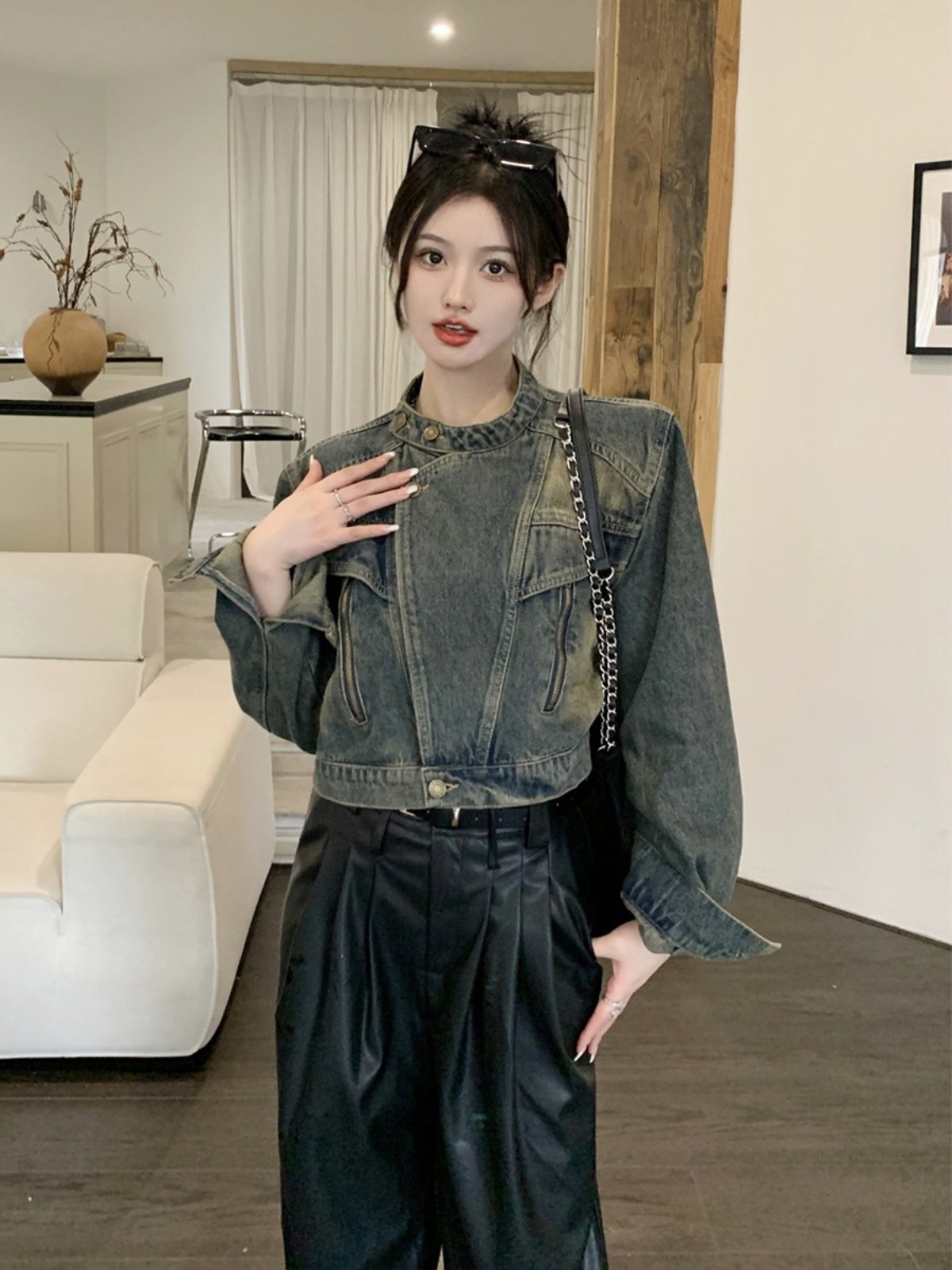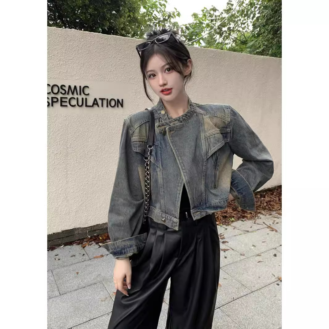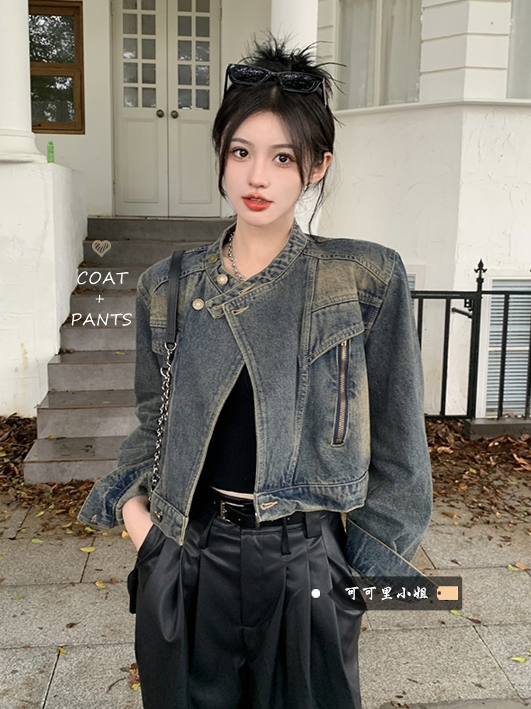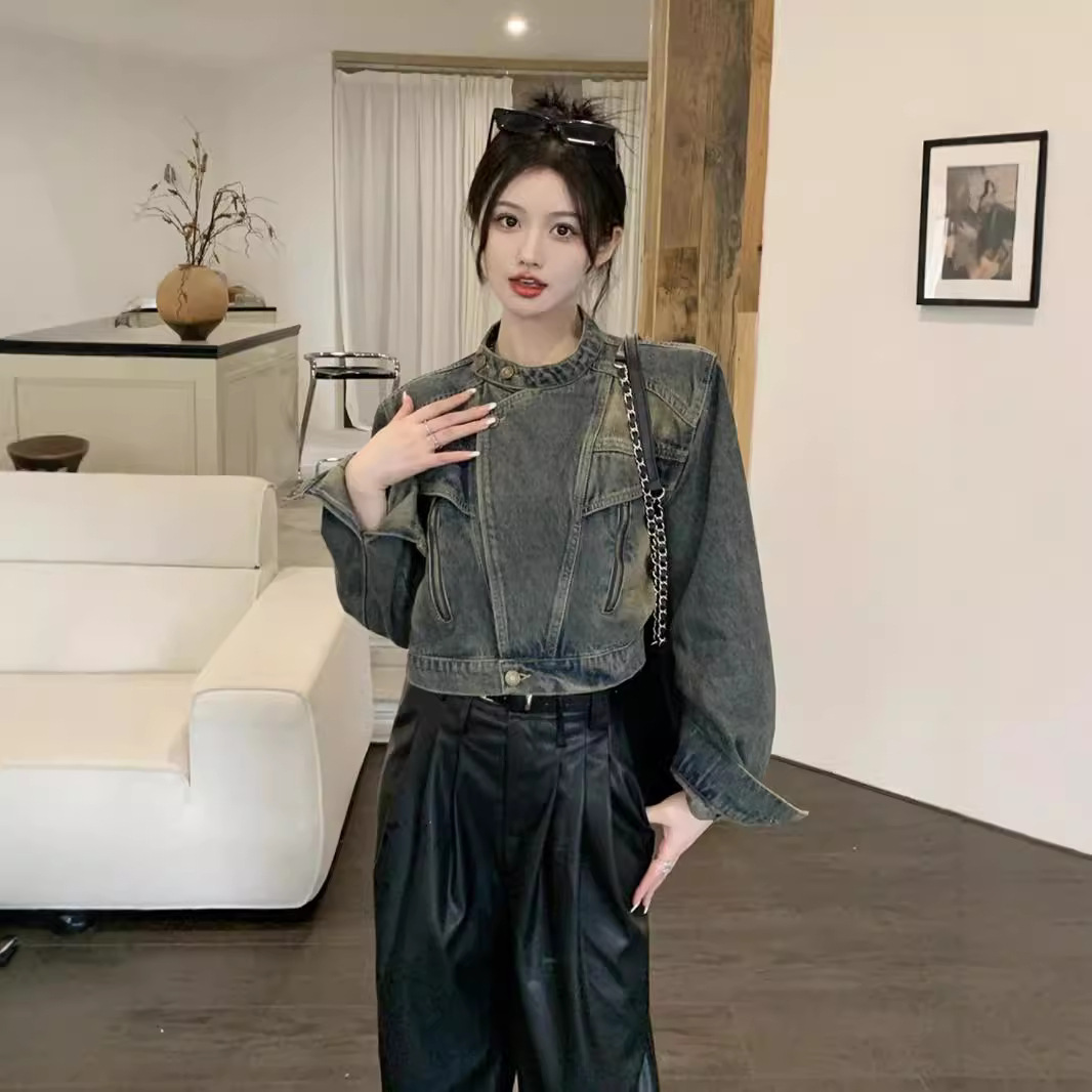 여성용 데님 바이커 재킷 2024년 가을 루즈핏 숏 긴팔 재킷 탑 ins 스타일 다용도 패셔너블스토어 가기