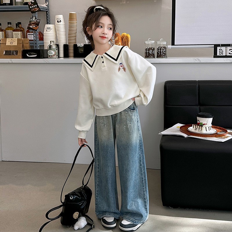 소녀의 봄과 가을 세트 2025 새로운 소녀 서양식 어린이 의류 해군 칼라 스웨트 셔츠 넓은 다리 바지 어린이 투피스 세트스토어 가기