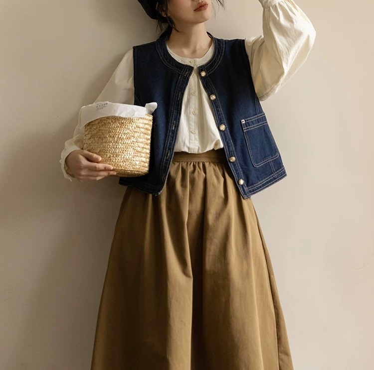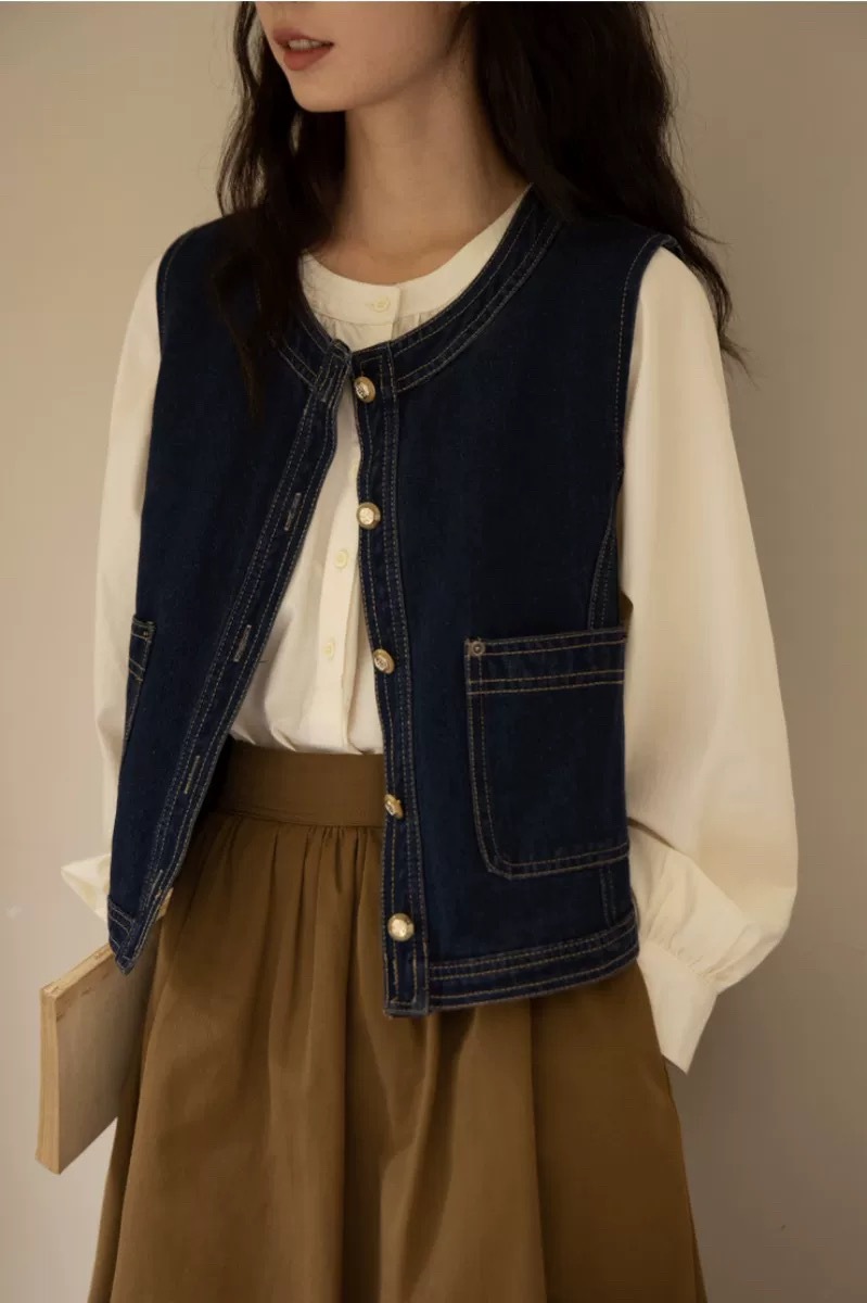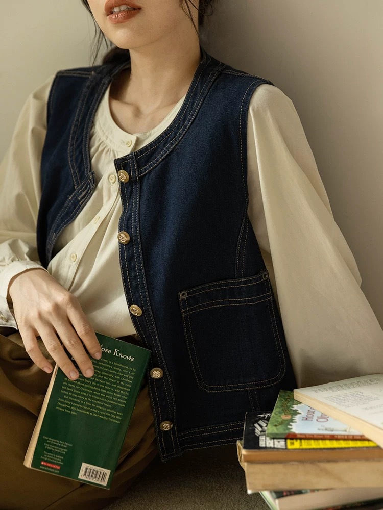 일본식 복고풍 데님 조끼 여성의 봄과 가을 스몰 사이즈 디자인 용 조끼 착용스토어 가기