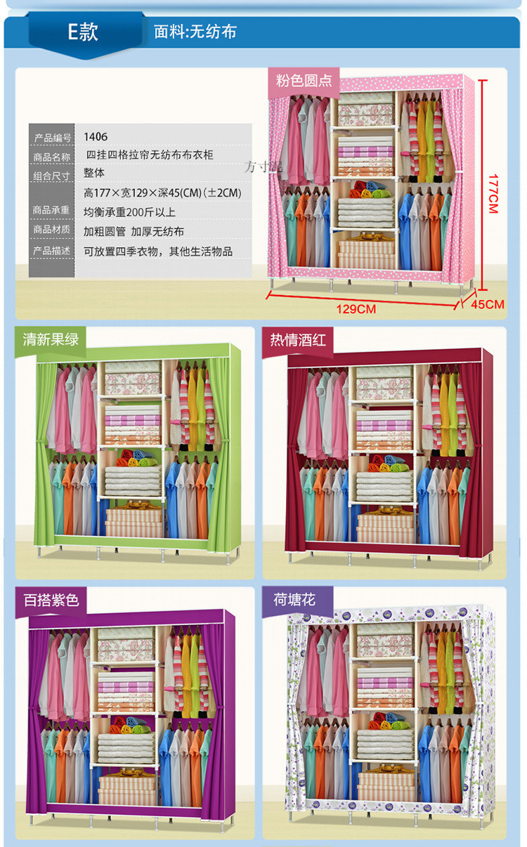 간단한 옷장 강철 파이프 두꺼운 두꺼운 천 옷장 임대 주택 주택 침실 조립 옷장 폐쇄 공장 도매