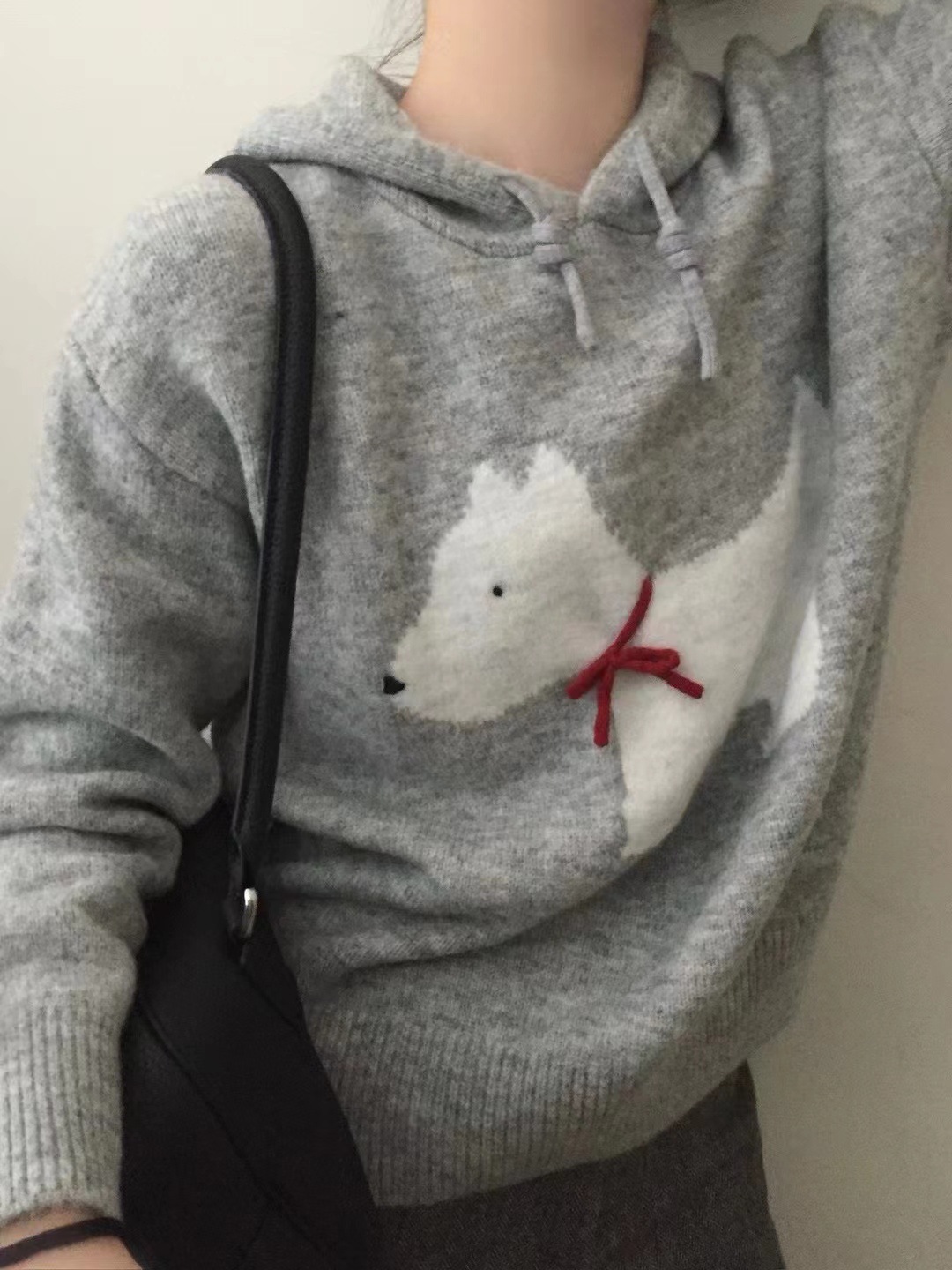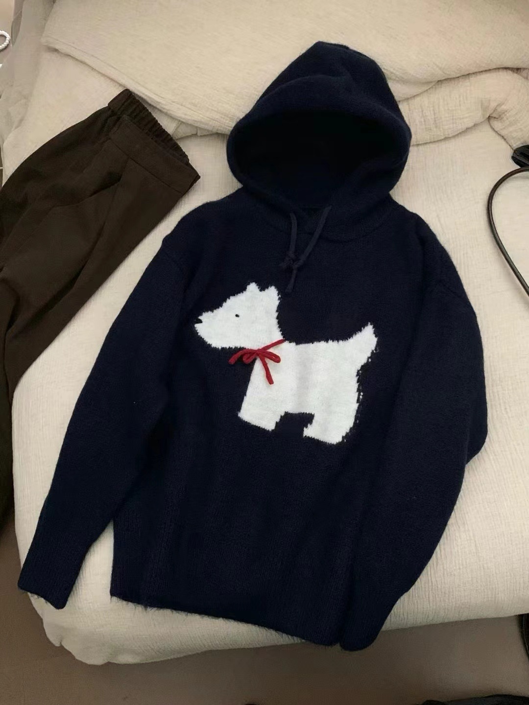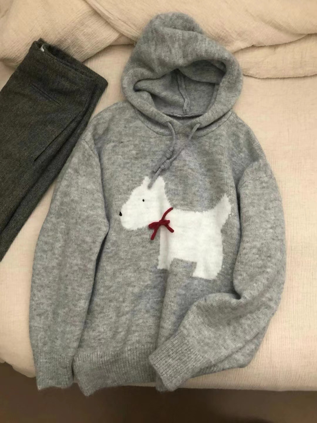 강아지 자수 후드 스웨터 2024 가을 새 울 니트웨어 캐주얼 대학 스타일 탑