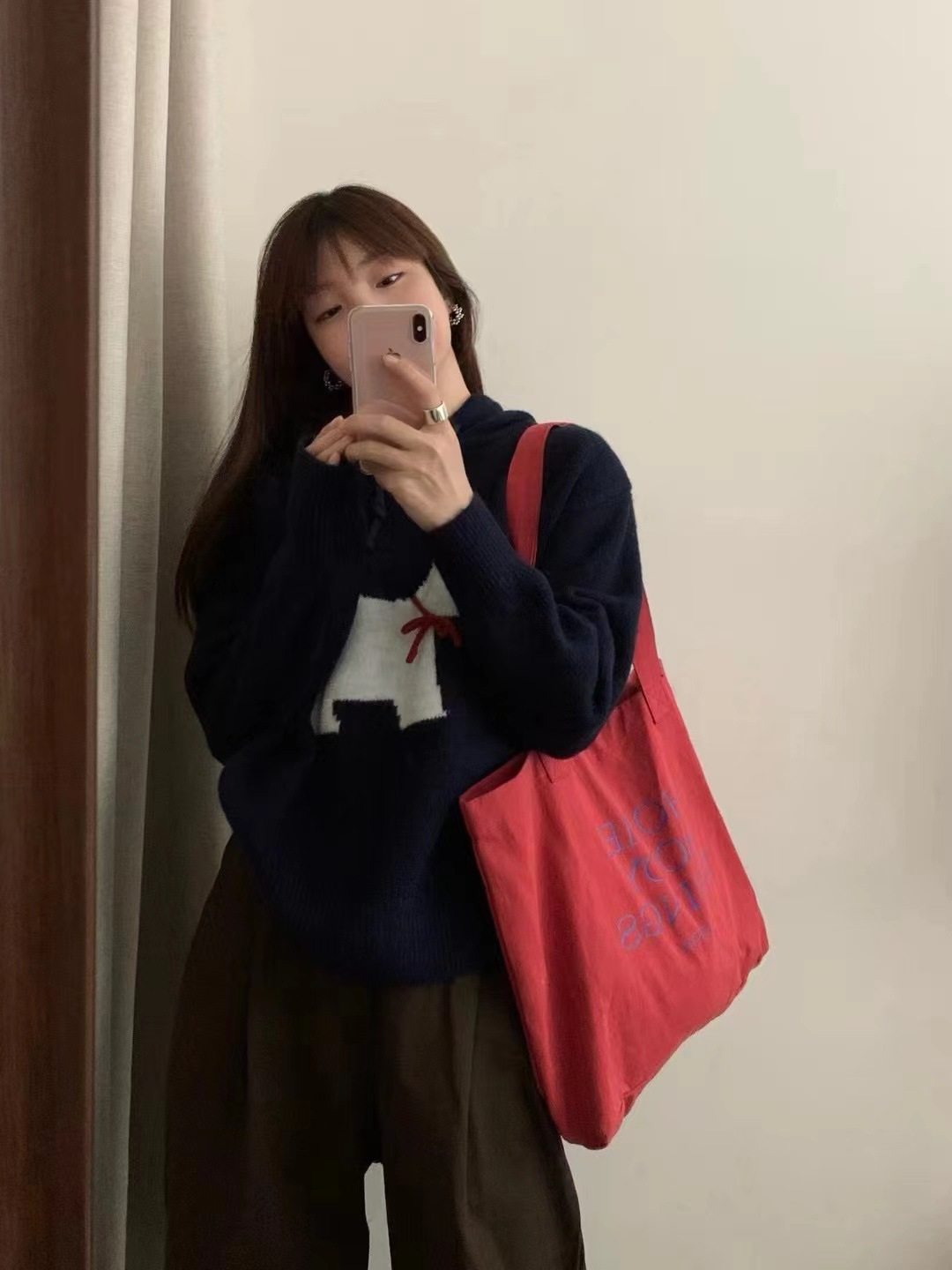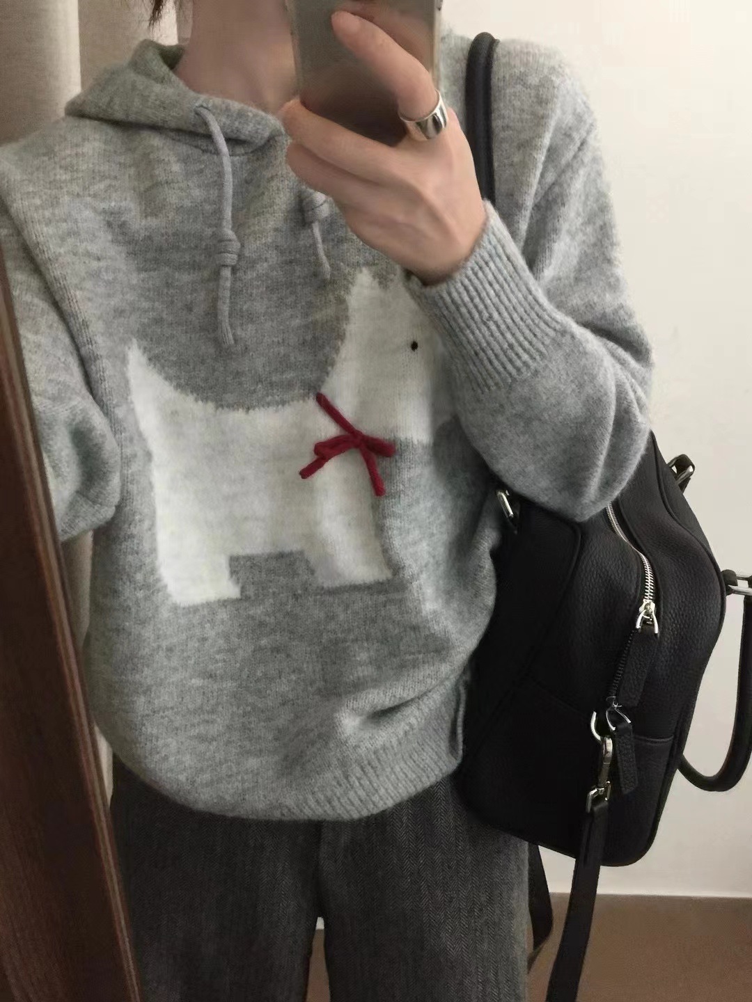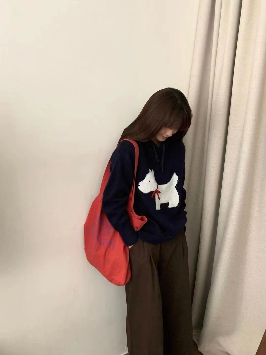 강아지 자수 후드 스웨터 2024 가을 새 울 니트웨어 캐주얼 대학 스타일 탑