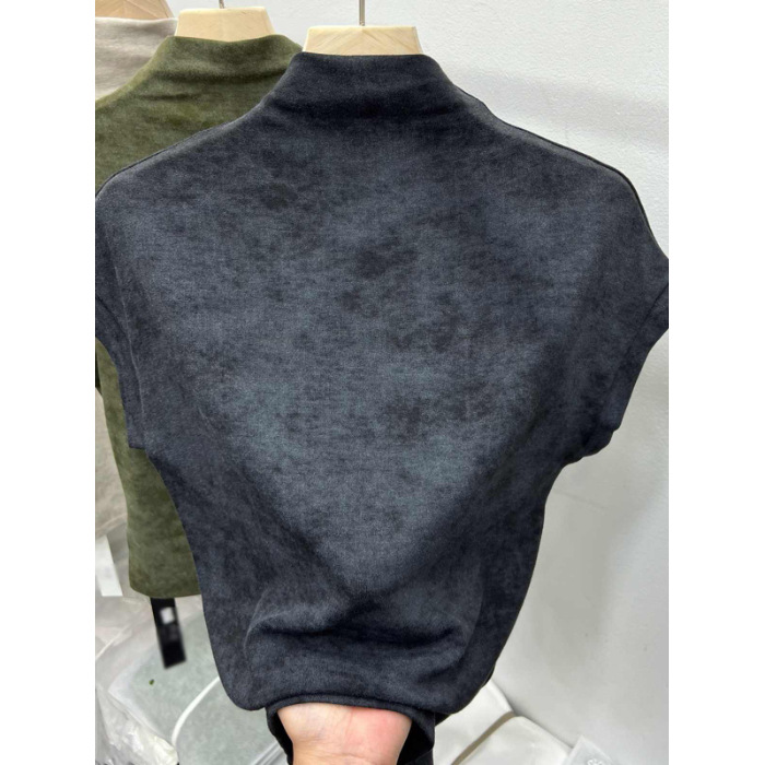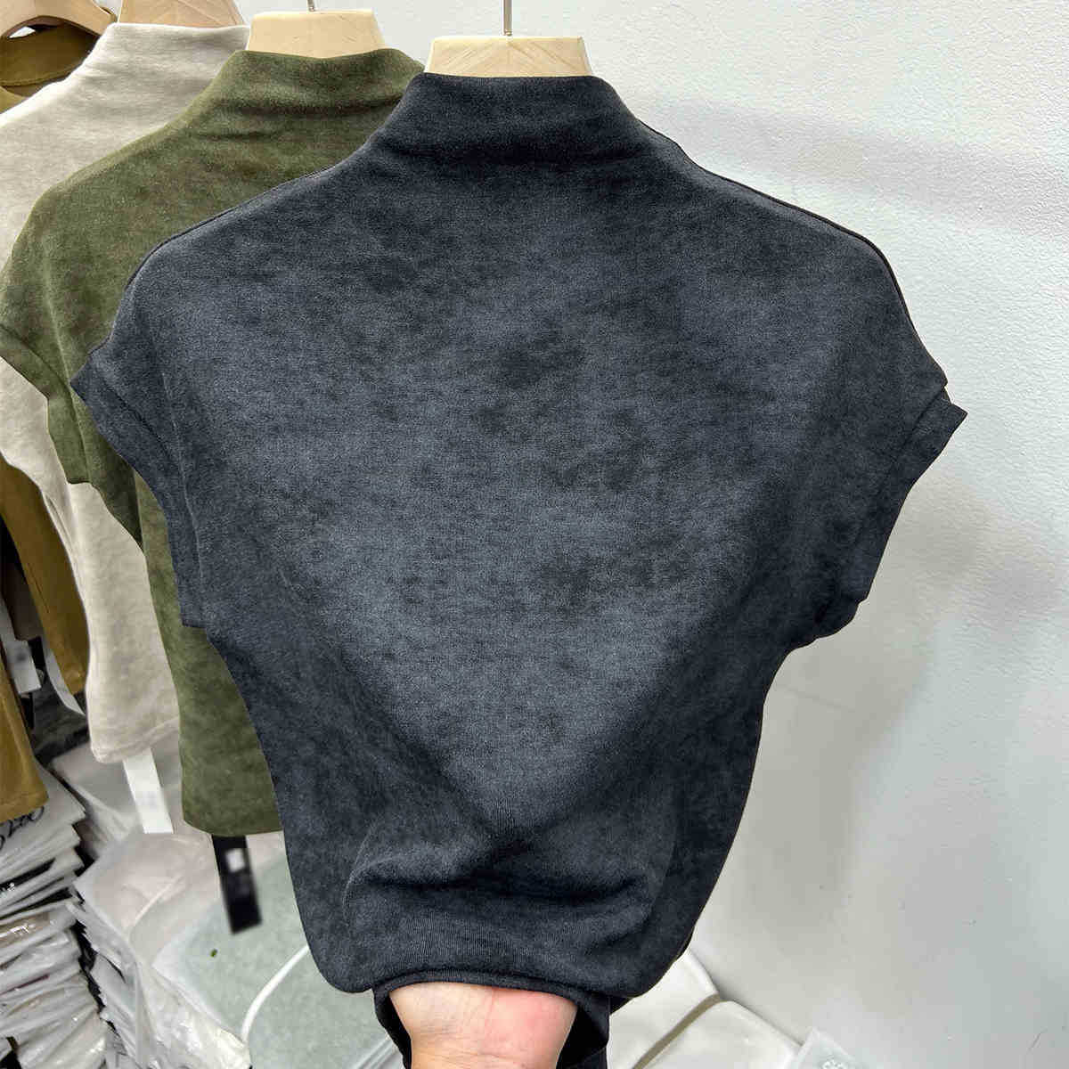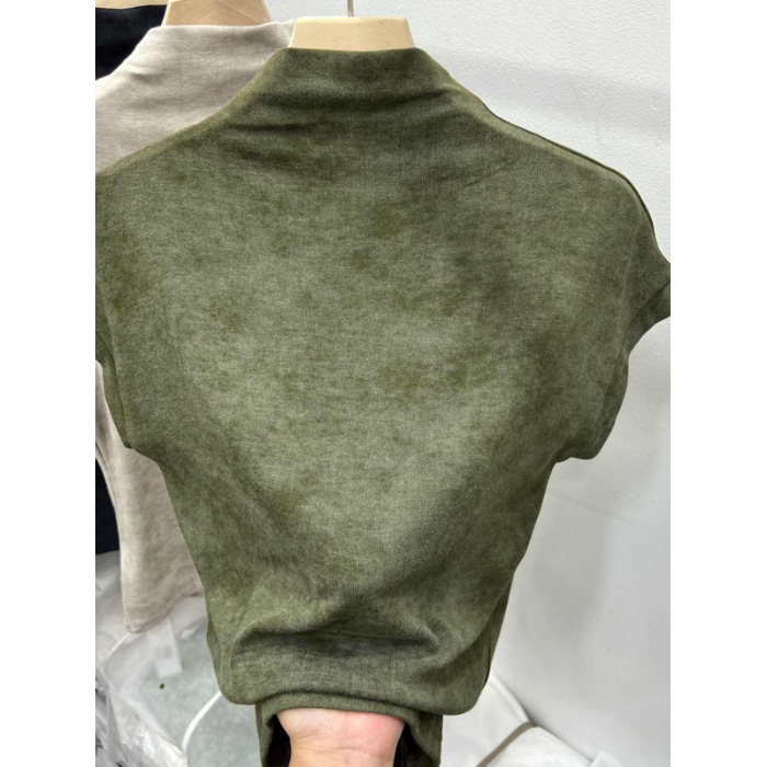 디자인 센스 틈새 세련된 타이 다이 탑 세미 하이 넥 반팔 티셔츠 여성의 2024 년 여름 새로운 플라잉 슬리브 베이스 셔츠