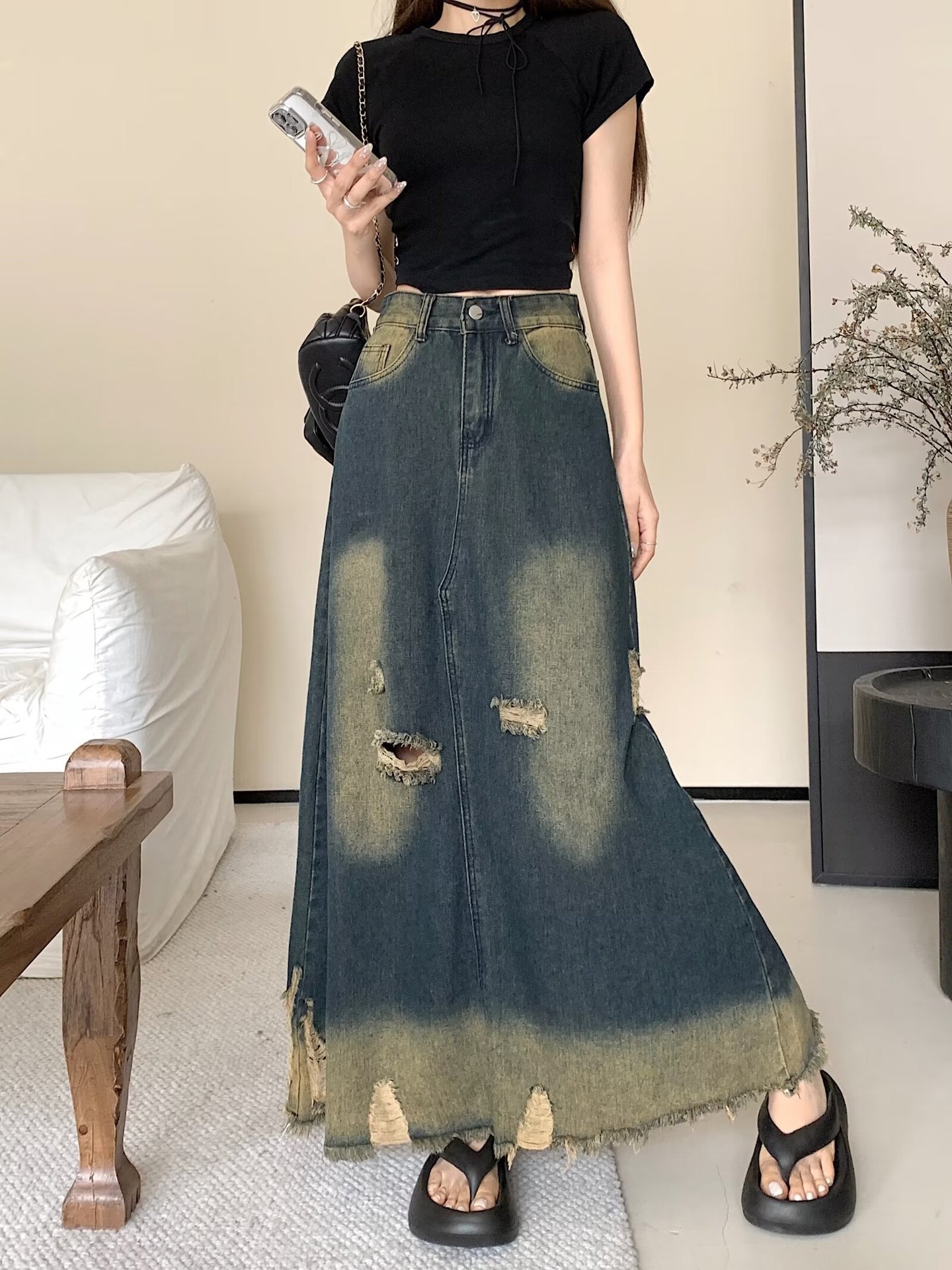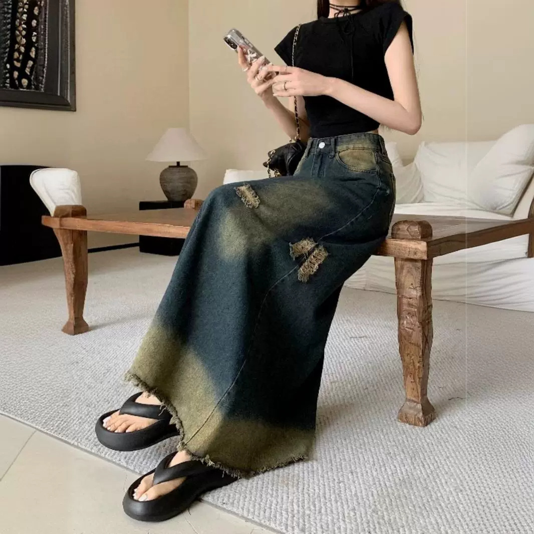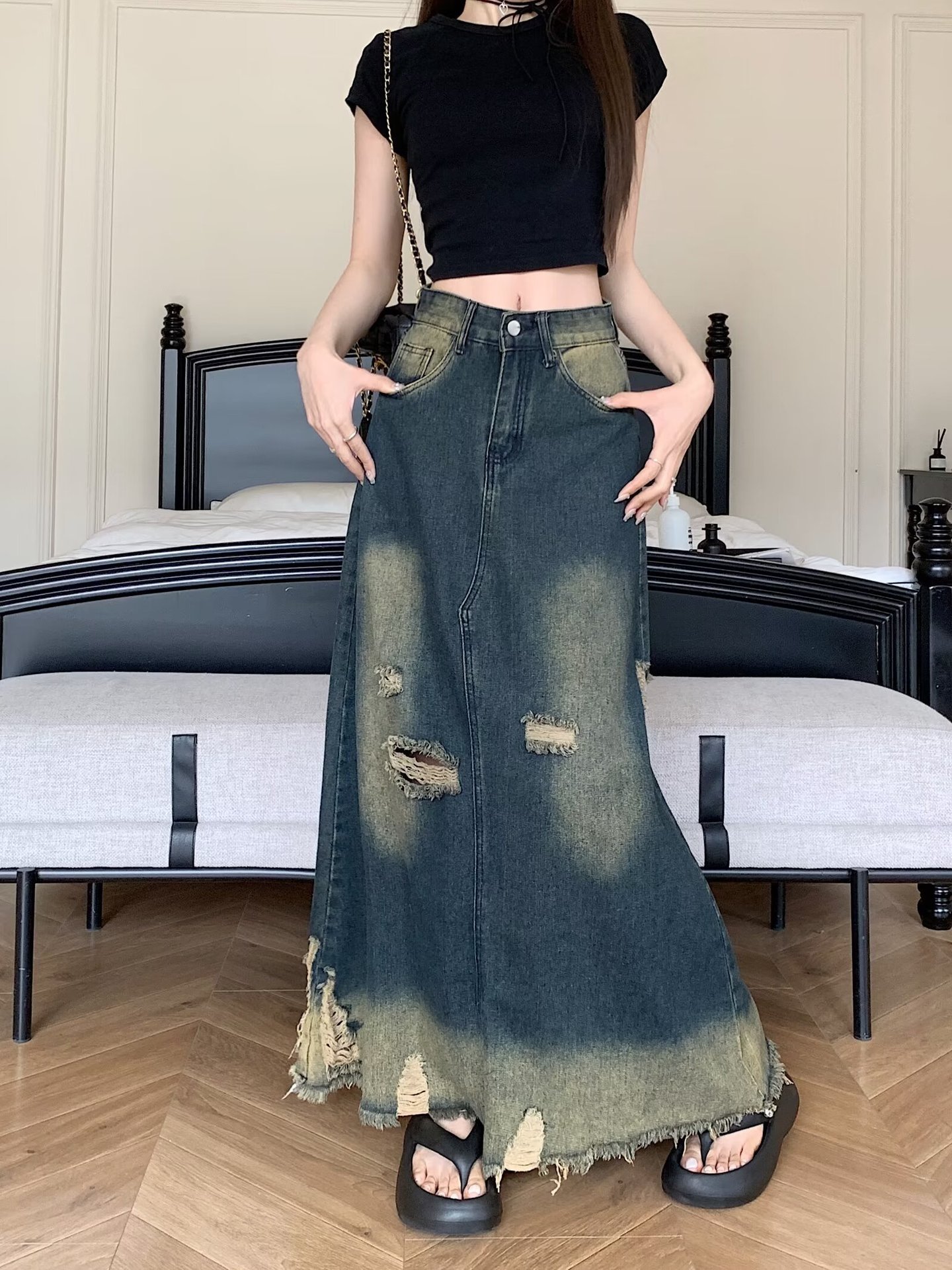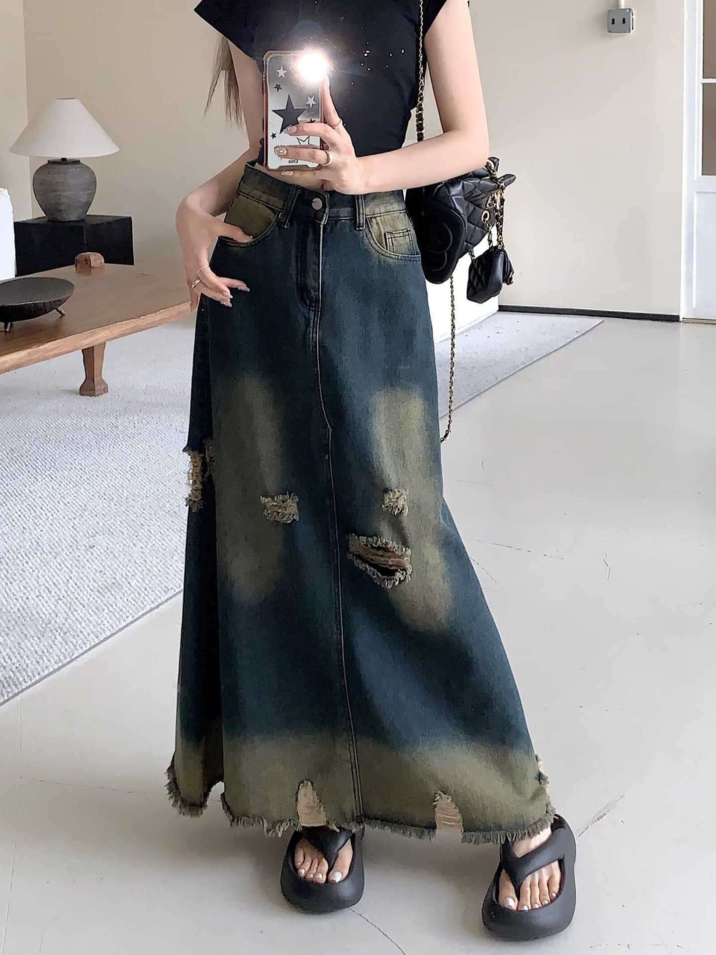 미국식 립 데님 스커트 여성 여름 플러스 사이즈 통통녀 슬림 A 라인 힙합 스커트 원스텝 스커트 롱 스커트