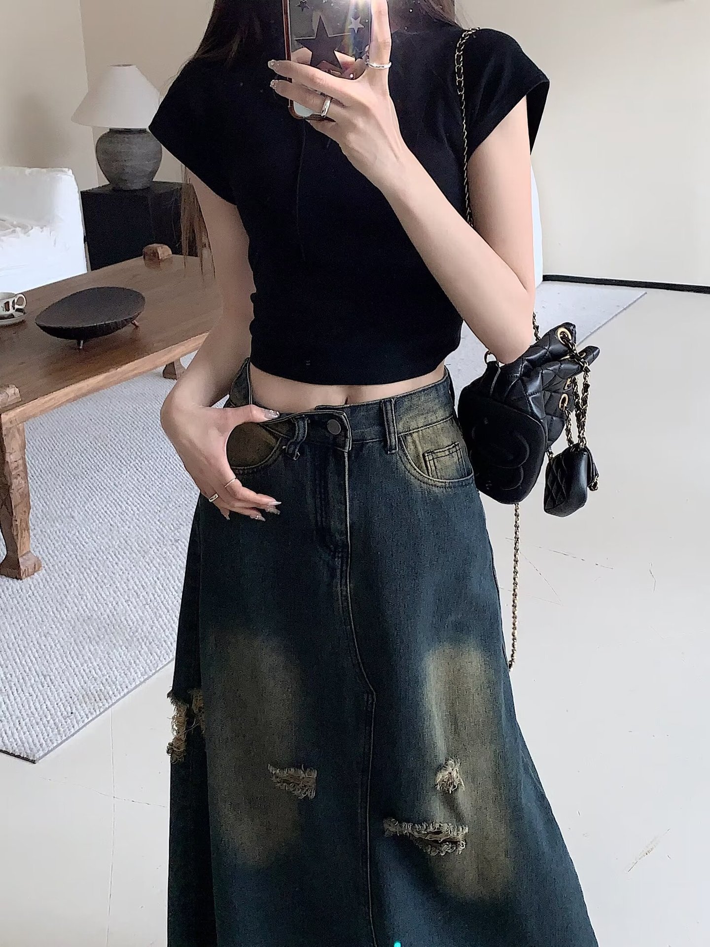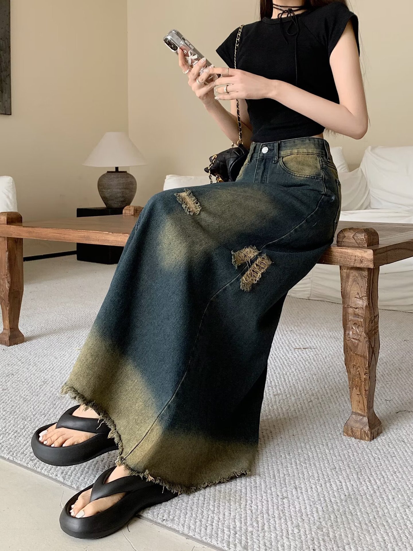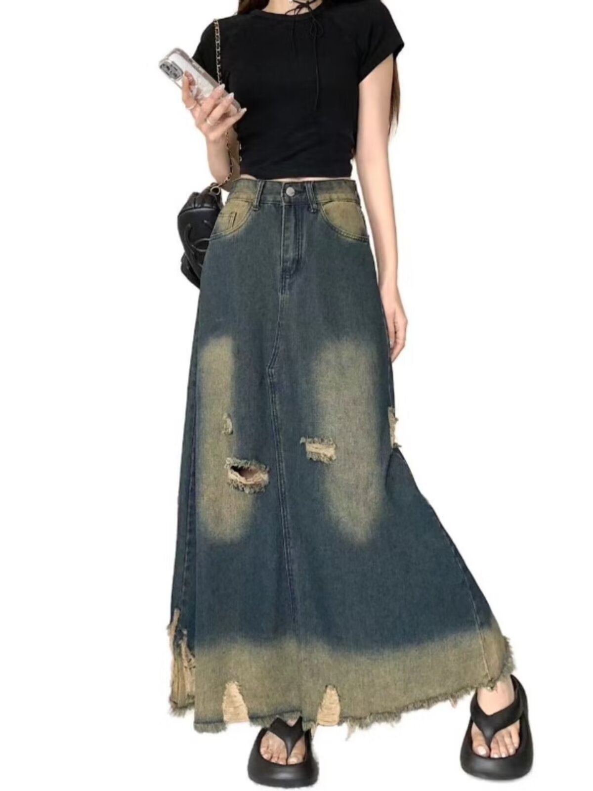 미국식 립 데님 스커트 여성 여름 플러스 사이즈 통통녀 슬림 A 라인 힙합 스커트 원스텝 스커트 롱 스커트