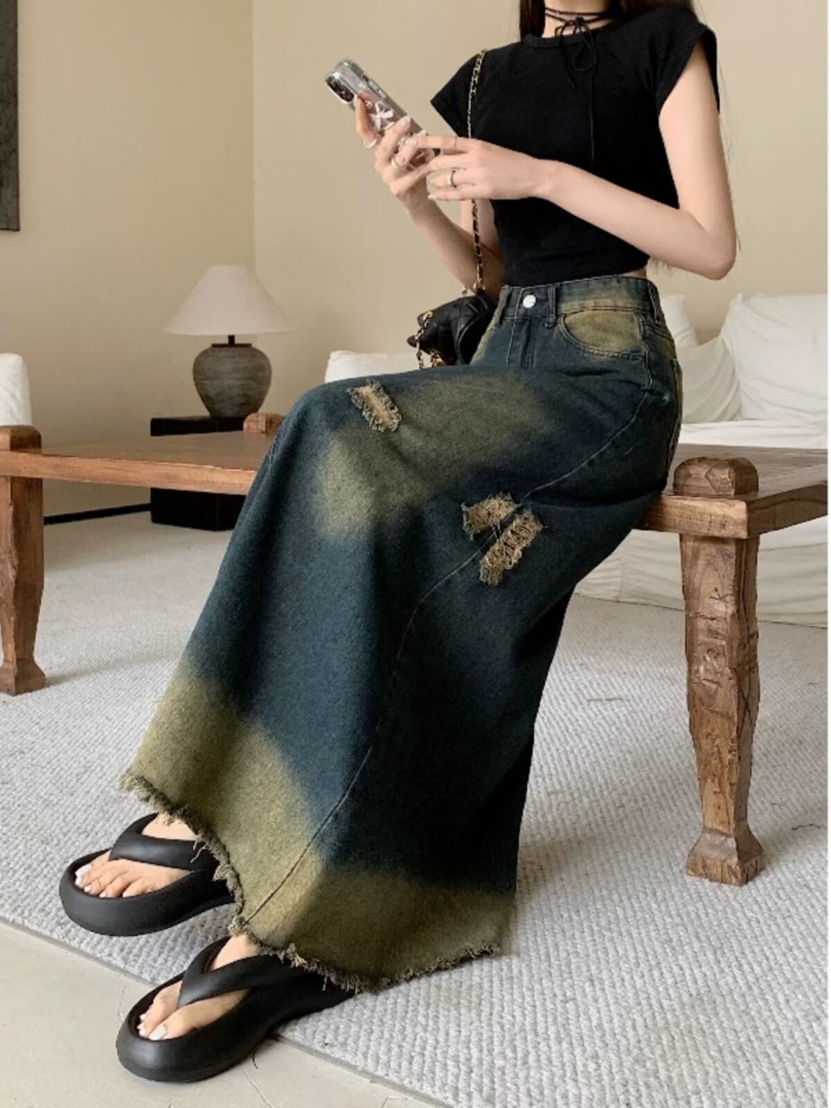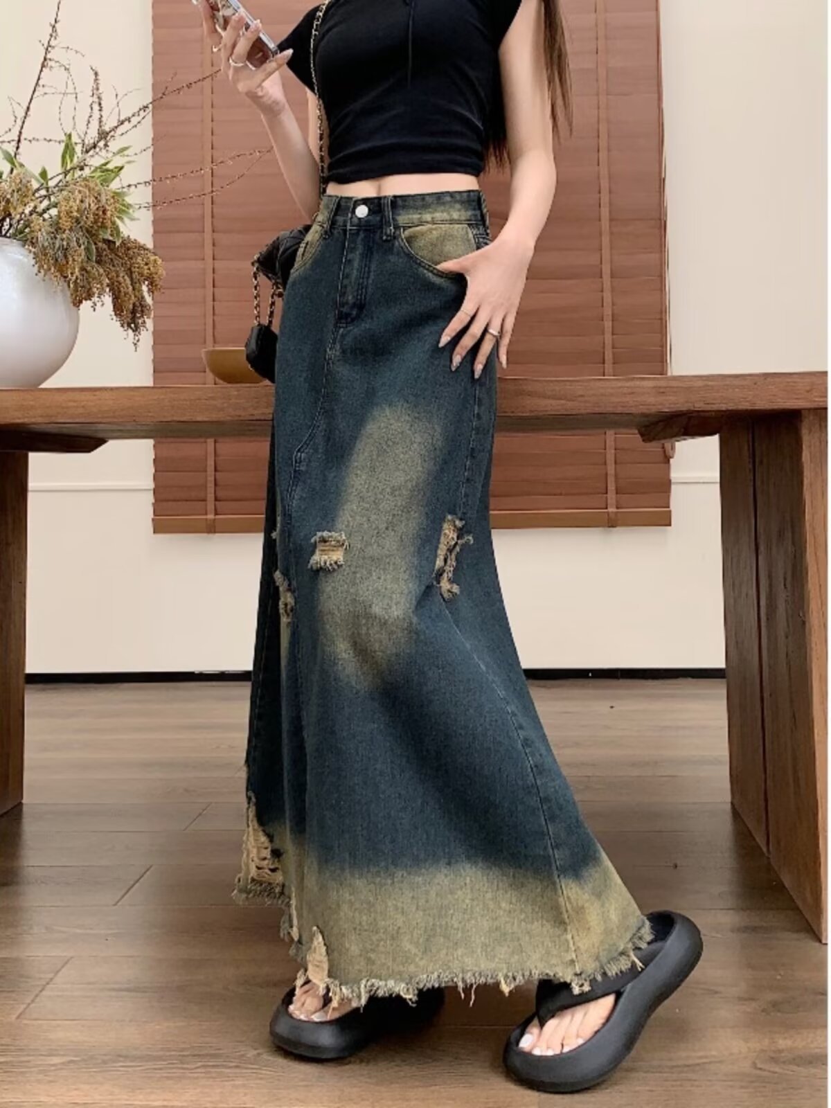 미국식 립 데님 스커트 여성 여름 플러스 사이즈 통통녀 슬림 A 라인 힙합 스커트 원스텝 스커트 롱 스커트스토어 가기