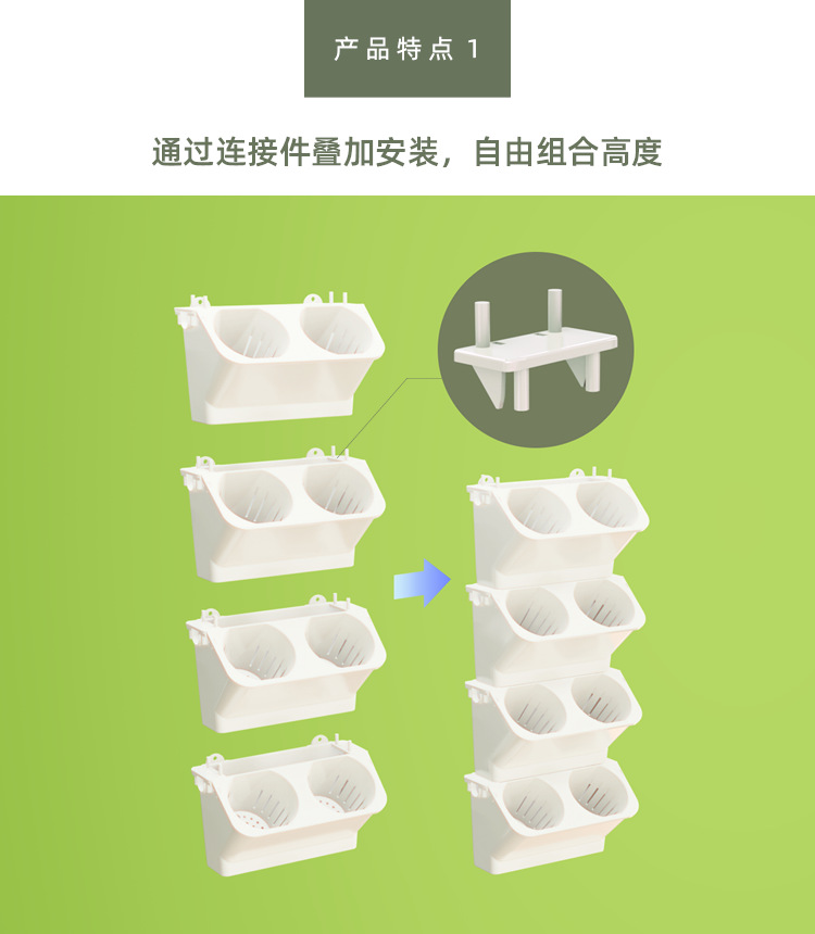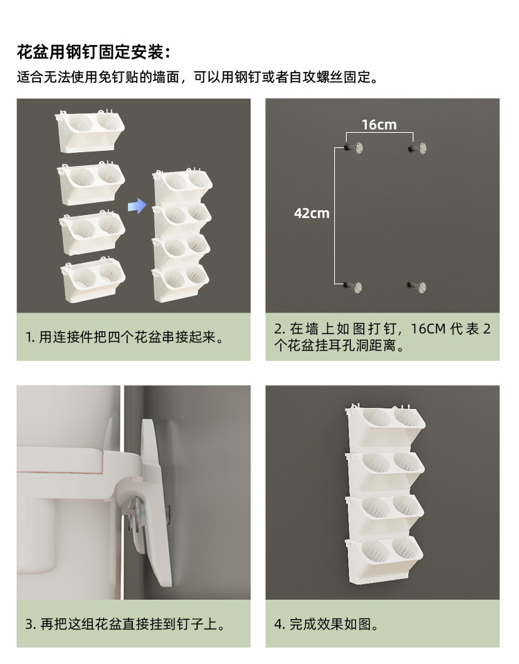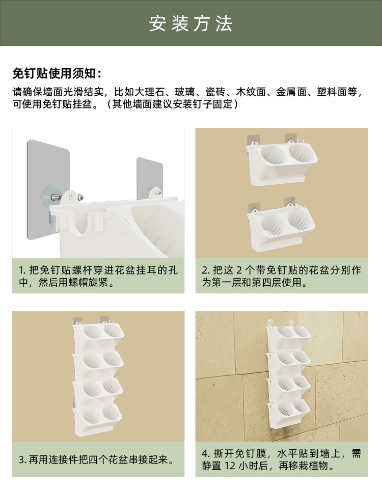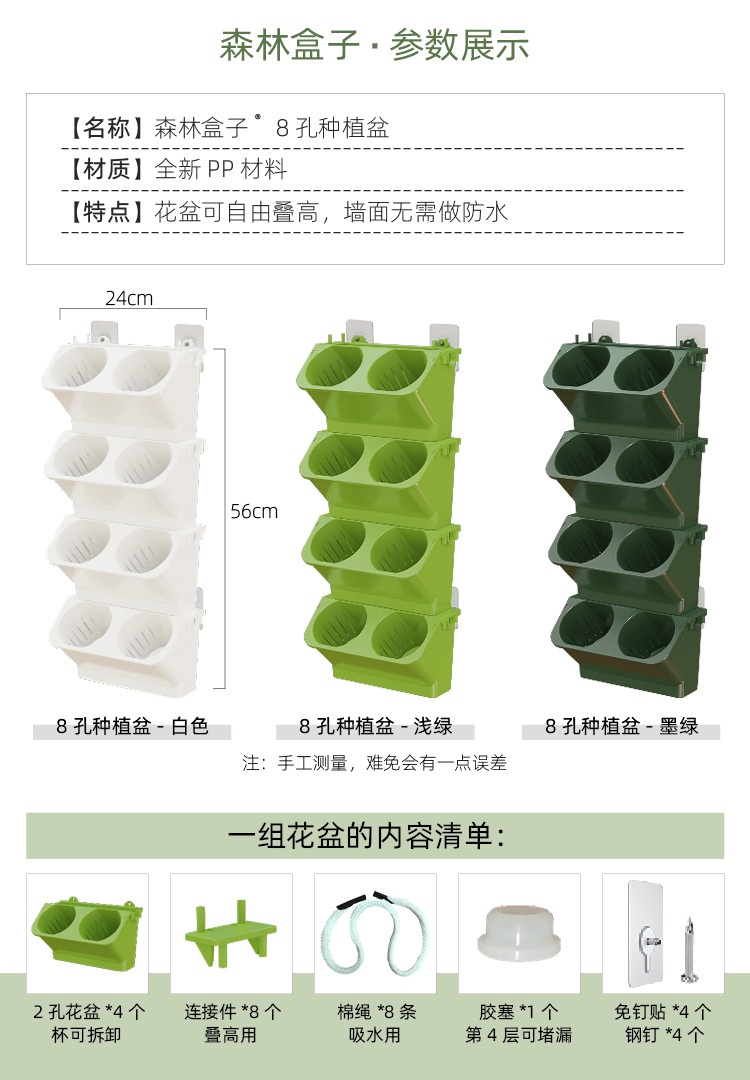 一套包含:2孔花盆*4个,连接件8个,棉绳8条,胶塞1个,免钉贴4个,钢钉4个。